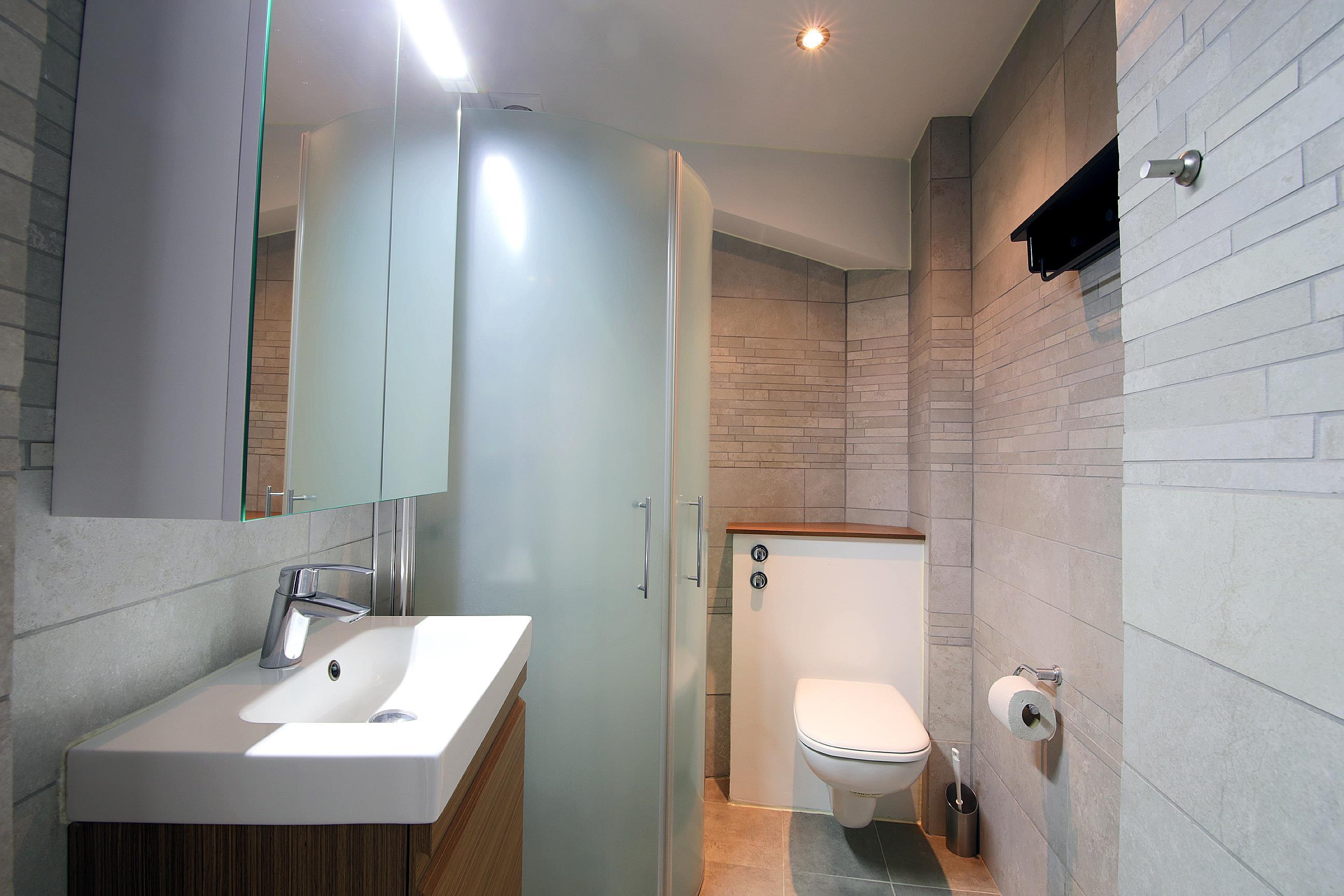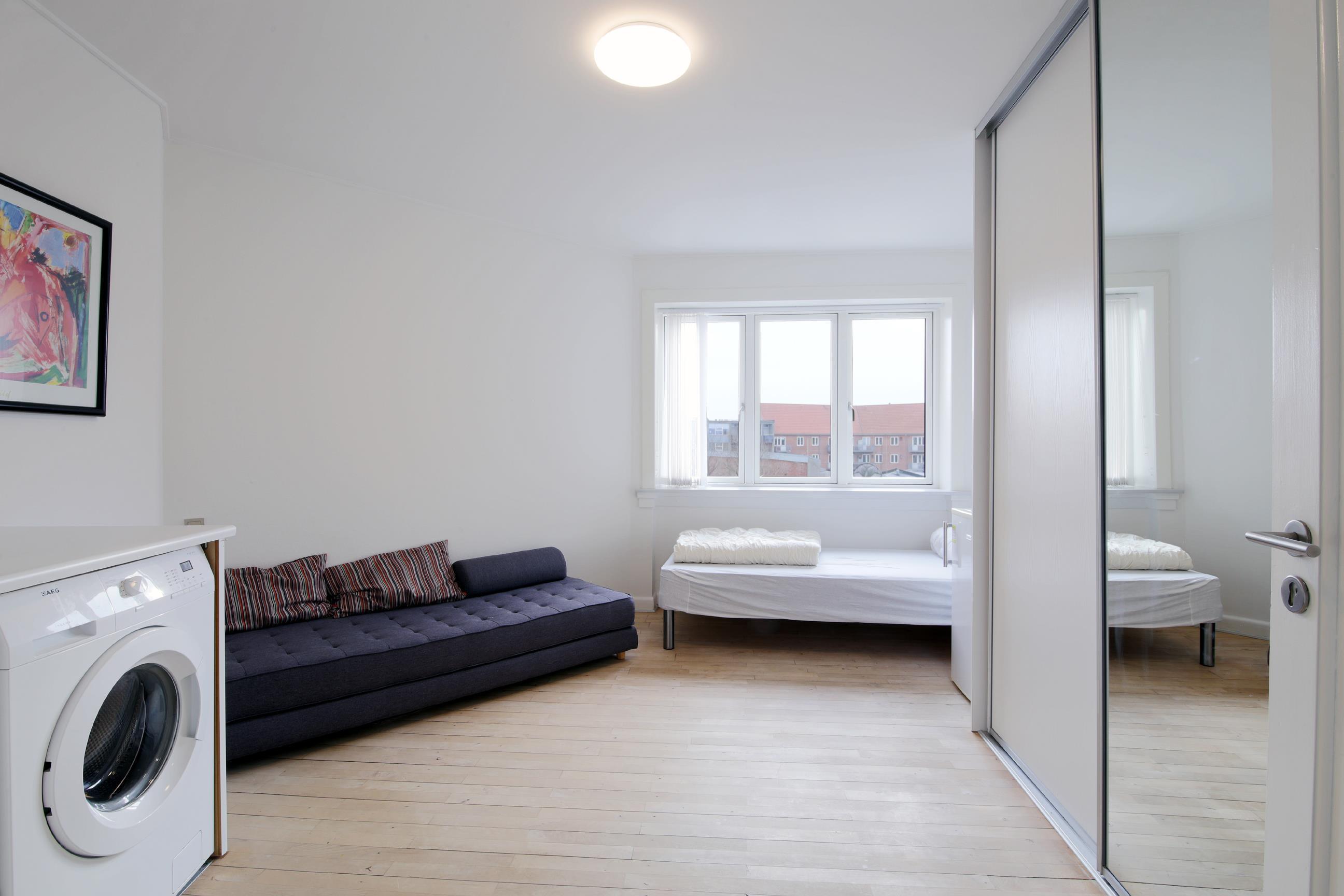 Gæsteværelse med 1 enkelt seng, skrivebord, skabsplads, vaskemaskine.