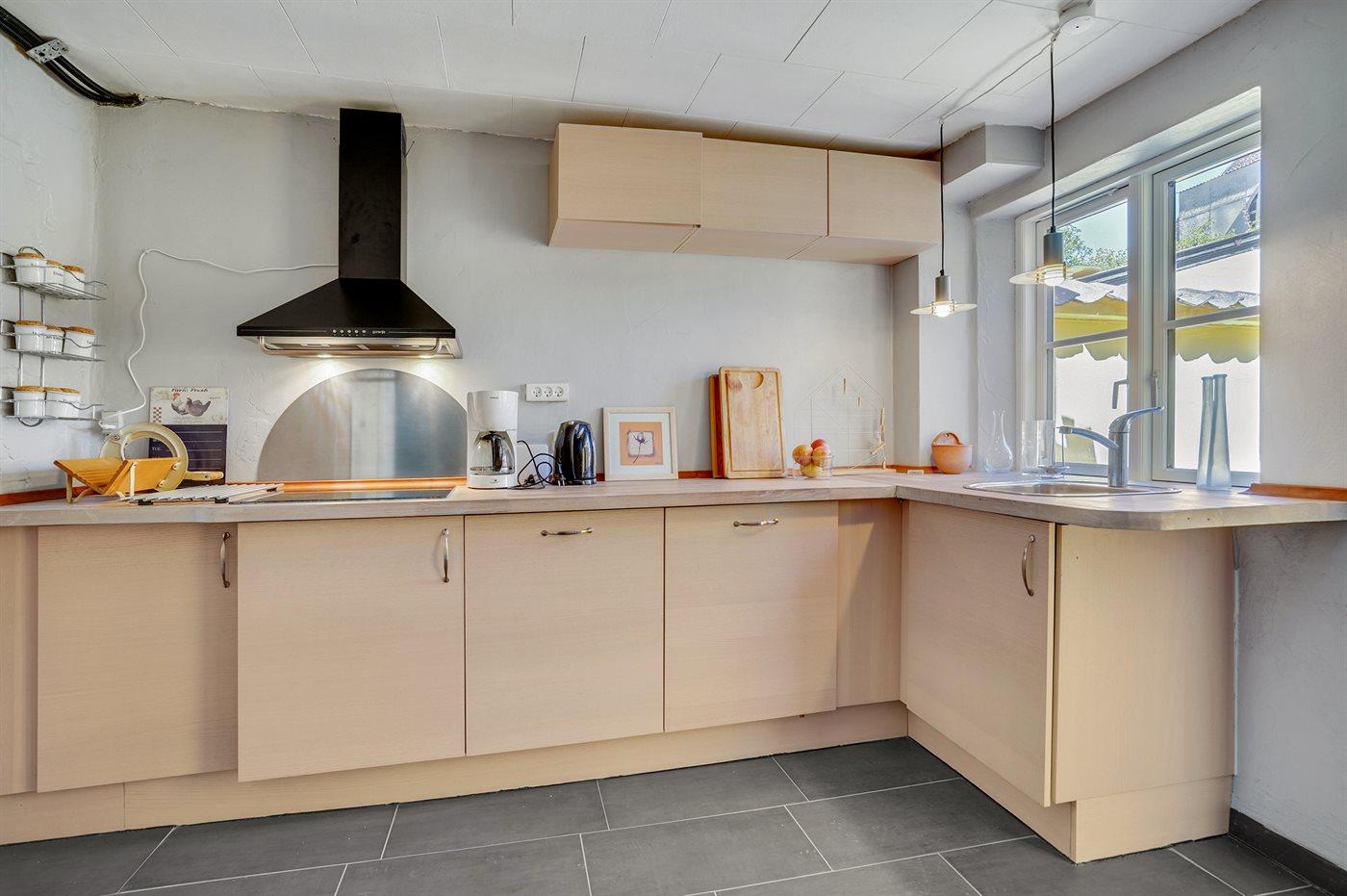Køkkenet er udstyret med 1 køleskab. Der er 4 keramiske kogeplader, varmluftovn Der er gulvvarme i køkkenet.