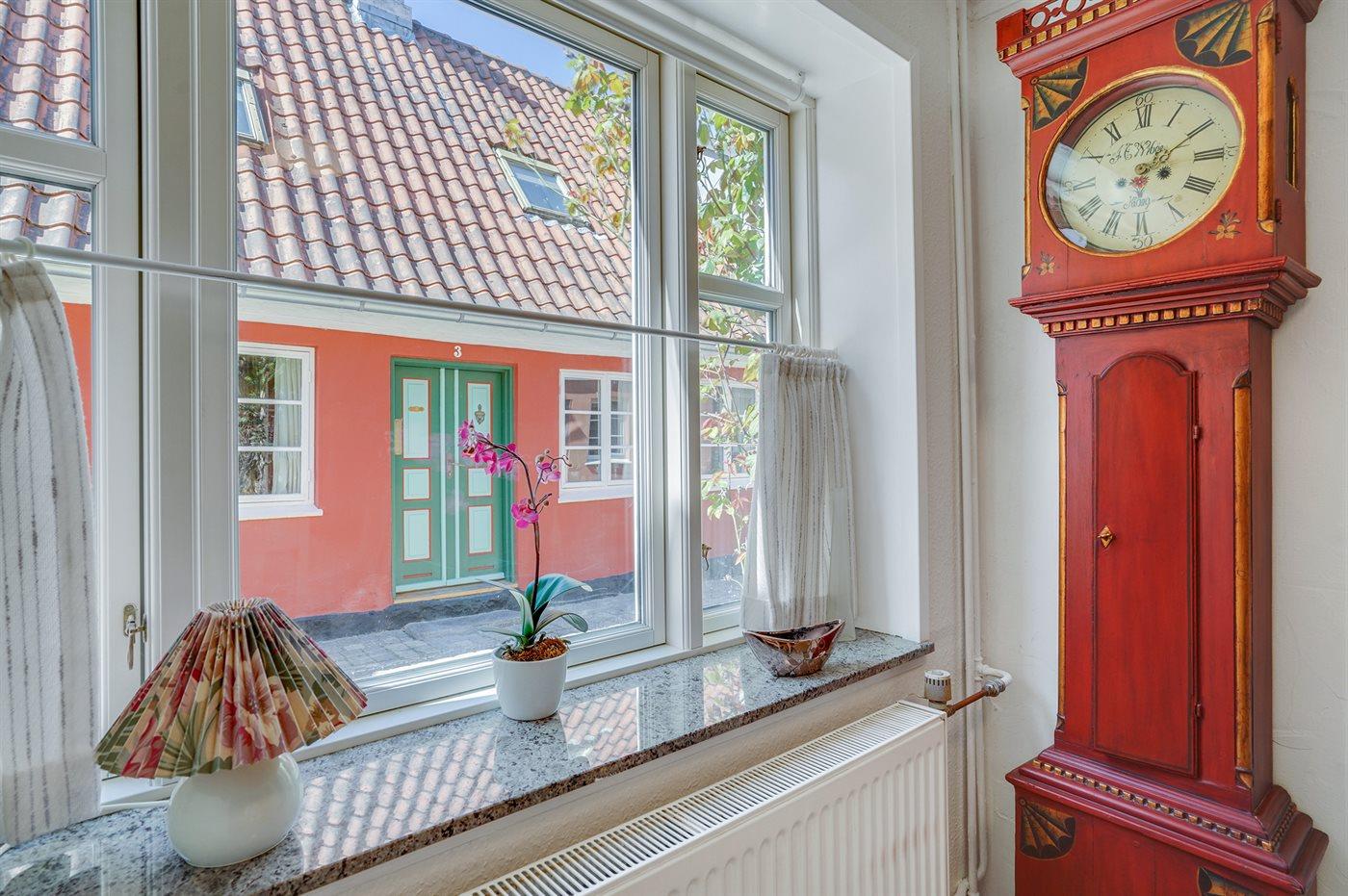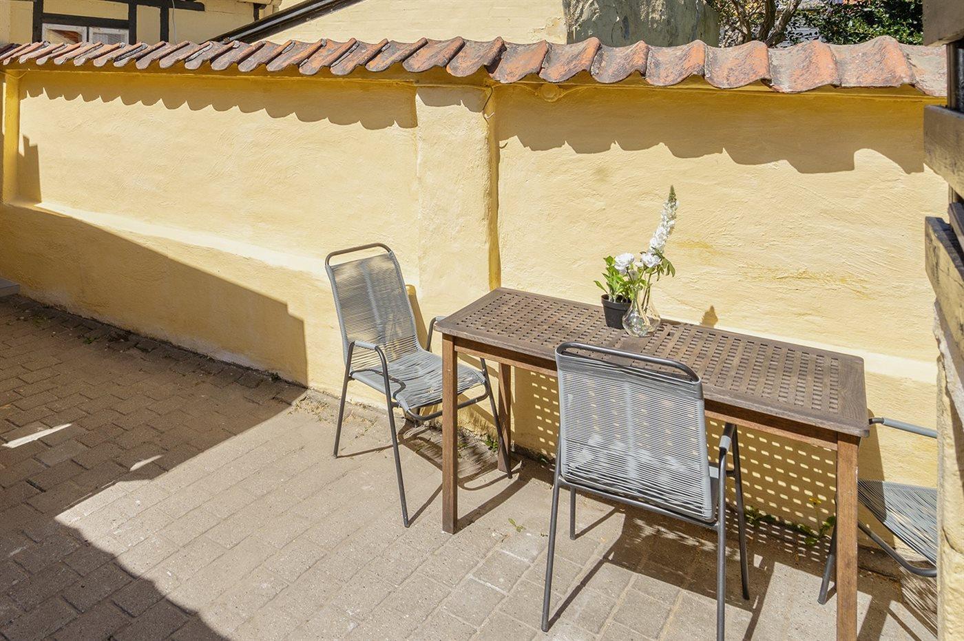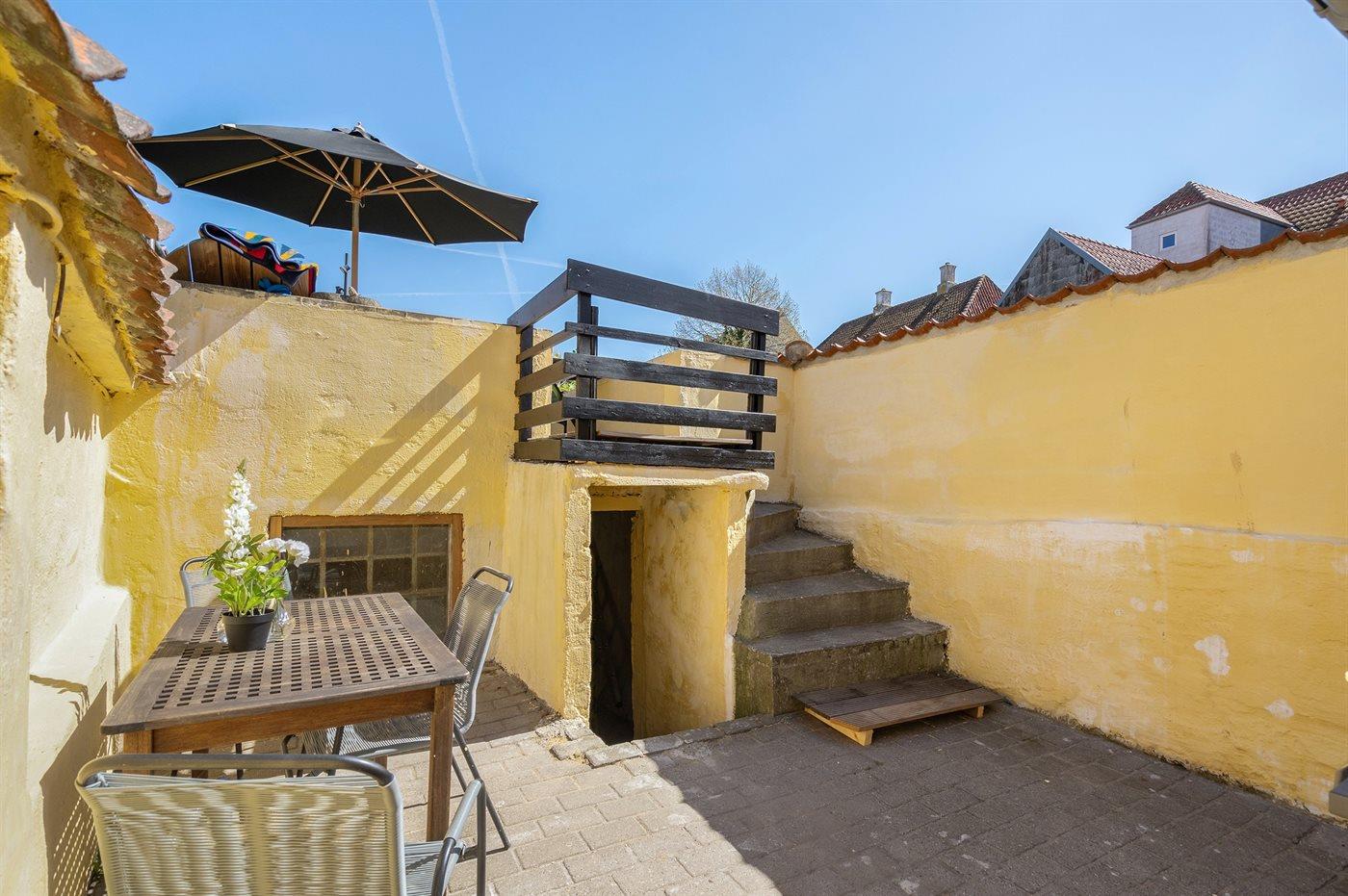Hyggeligt historisk fiskerhus i Faaborg med gårdhave, terrasse og udsigt til klokketårnet, tæt på havet og byens butikker.