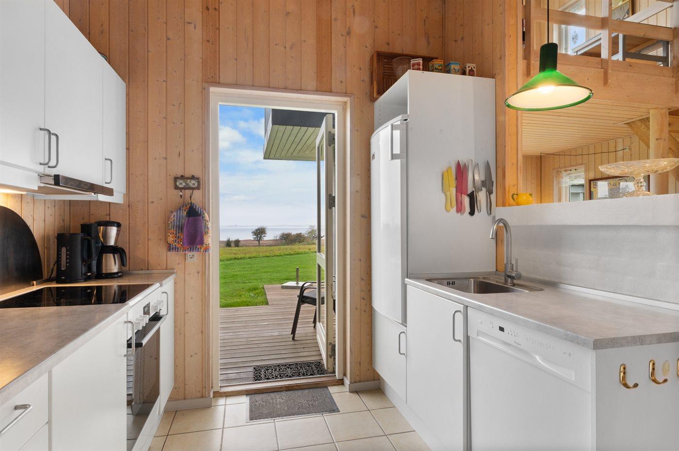 Køkkenet er udstyret med 1 køleskab. Der er 4 keramiske kogeplader, varmluftovn, mikrobølgeovn samt opvaskemaskine Der er gulvvarme i køkkenet.
