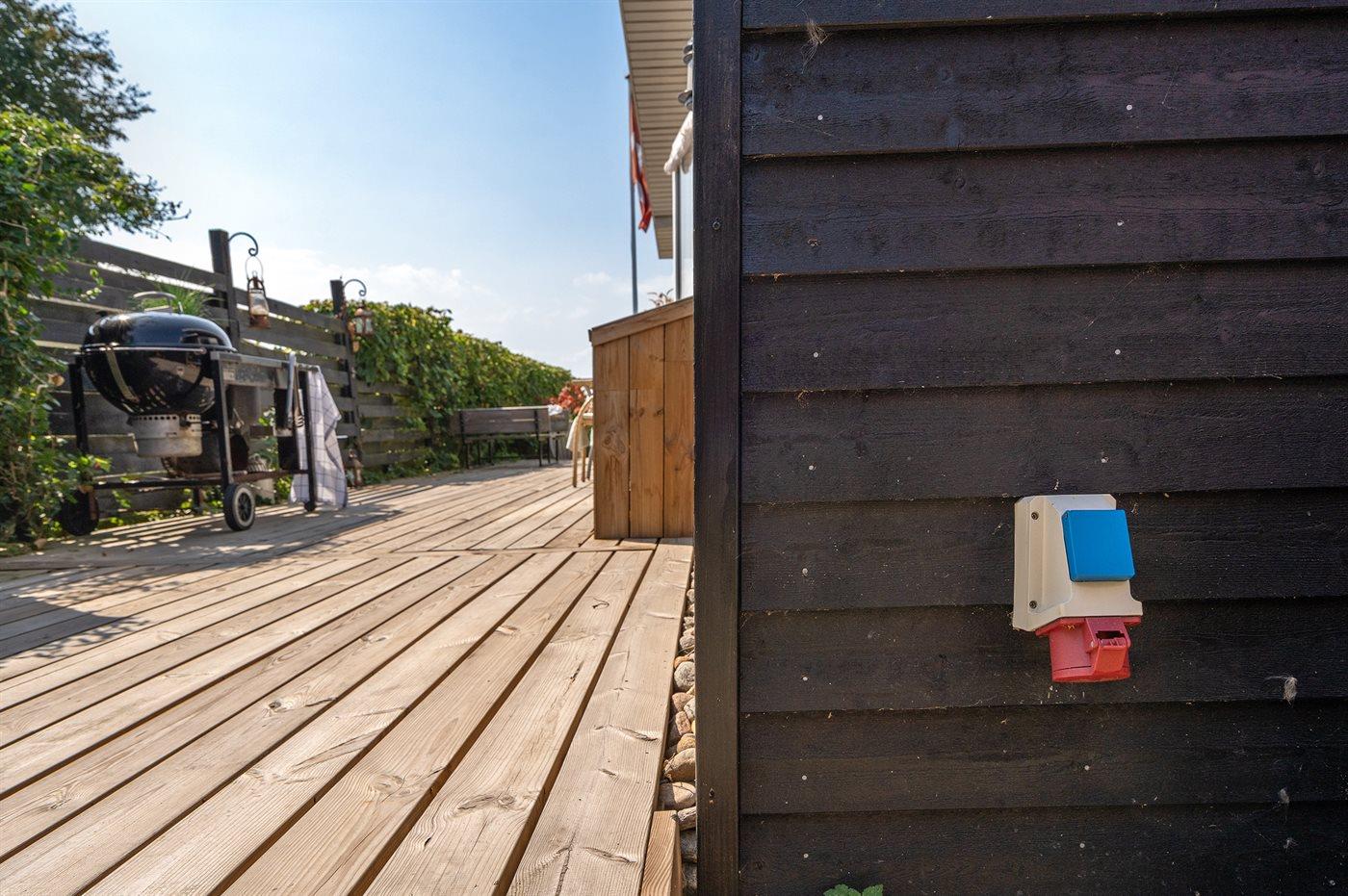 Ferieboligen er beliggende på en 262 m² stor havegrund. Der er 25 m til havet. Der er en badebro i nærheden. Nærmeste forretning er beliggende i en afstand af 4800 m. Der er en golfbane i en afstand af 9000 m. Til ferieboligen hører åbent terrasseareal. Udendørs bruser. Grill til rådighed. Der er installeret stik til opladning af elbil. CEE stik. Parkering ved ferieboligen.