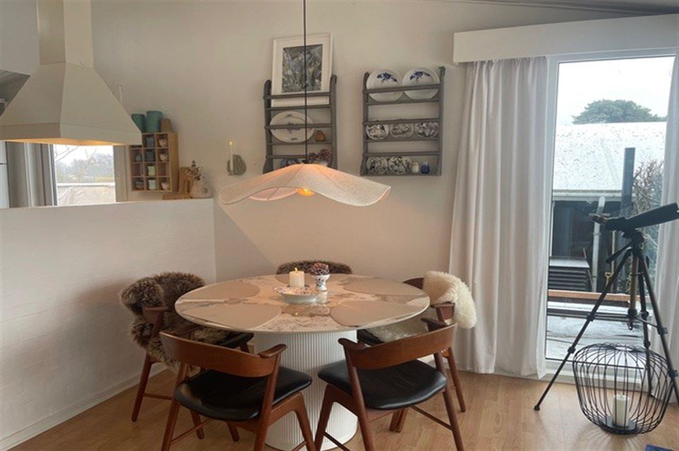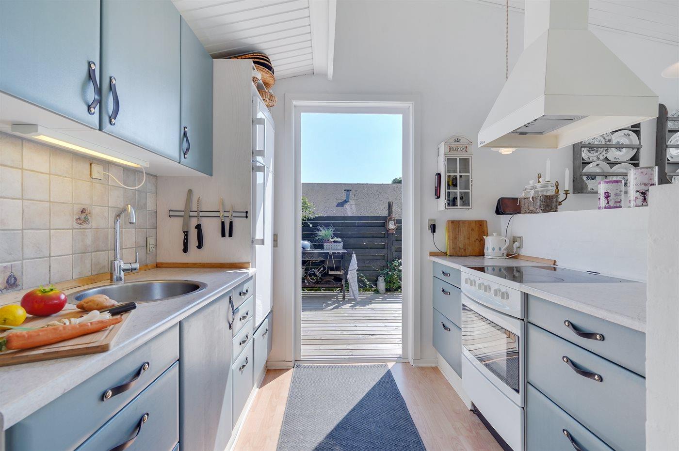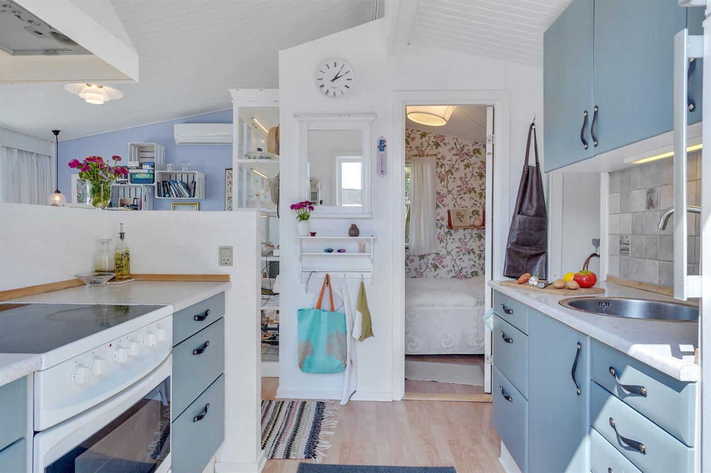 Køkkenet er udstyret med 1 køleskab. Der er 4 keramiske kogeplader, varmluftovn samt opvaskemaskine.