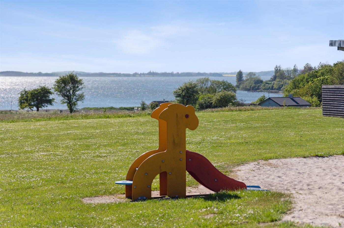 På fællesområdet er der en stor legeplads, og om sommeren er der opsat fælles badebro ved stranden.