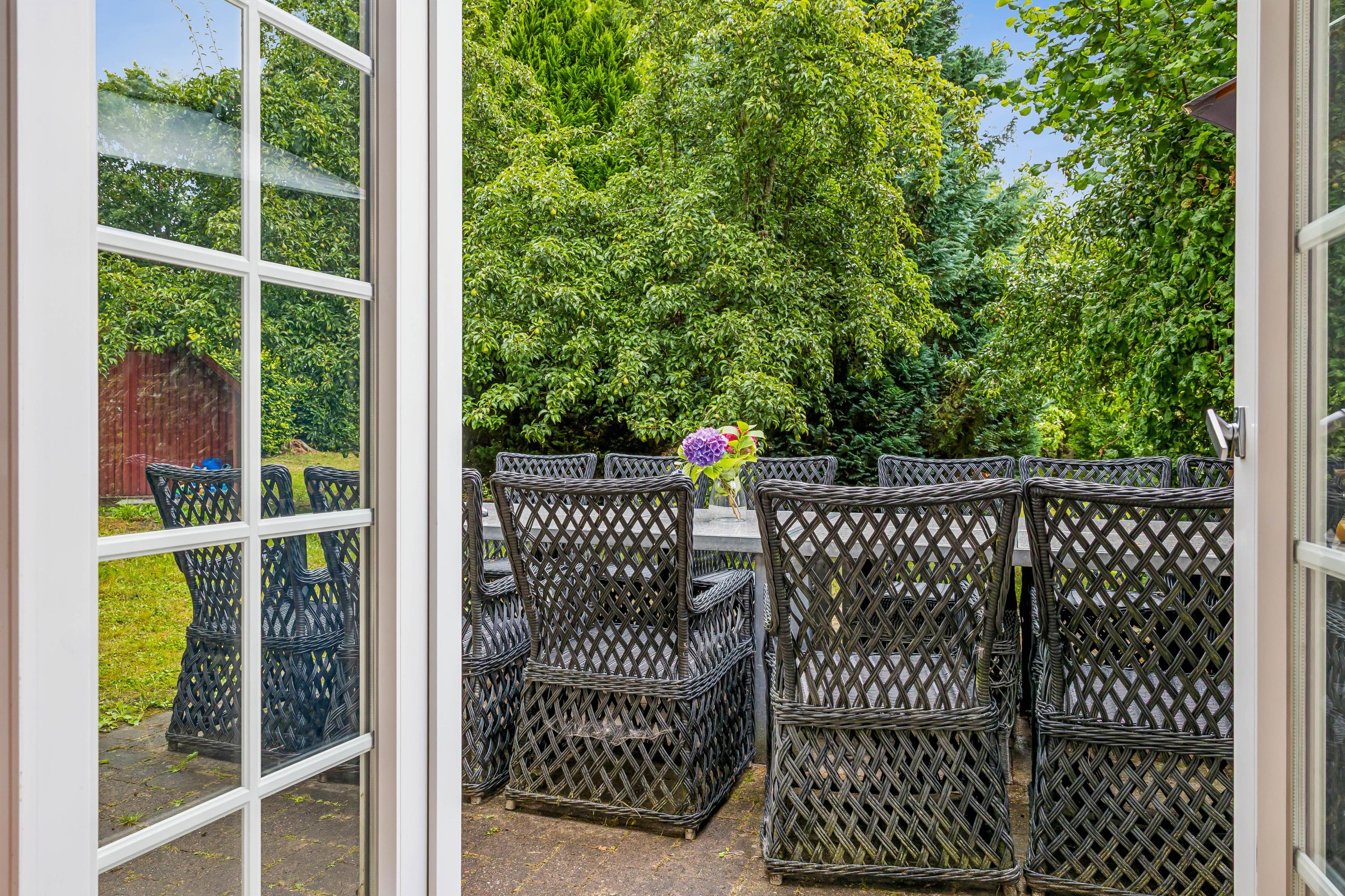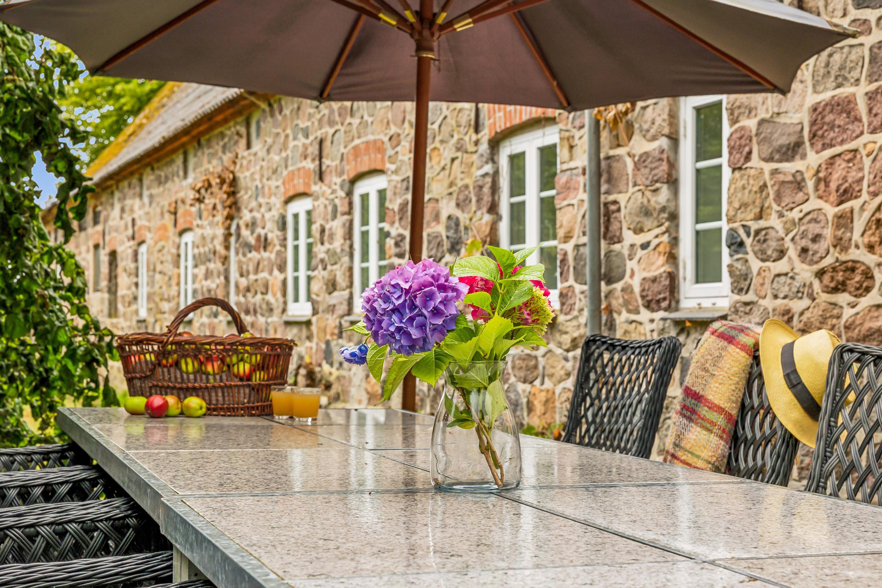 Feriebolig Øst ved Følle Strand tilbyder plads til 18 gæster, stor terrasse, legeplads og fælles faciliteter på Røndegaard.