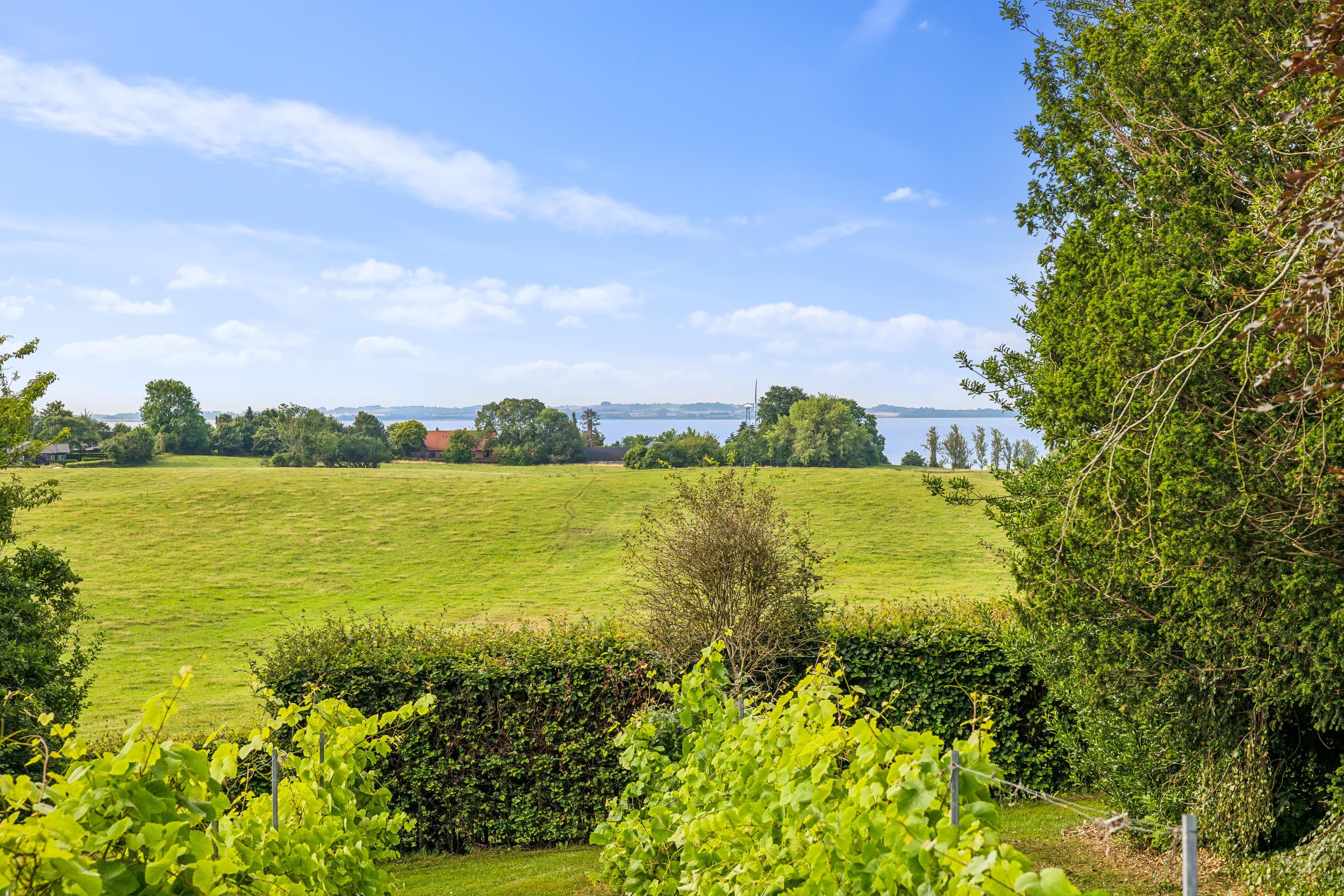 Stor feriebolig ved Følle Strand med terrasse, sauna, legeplads og smuk udsigt over Kaløvig.