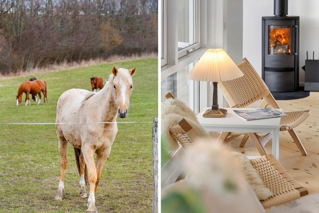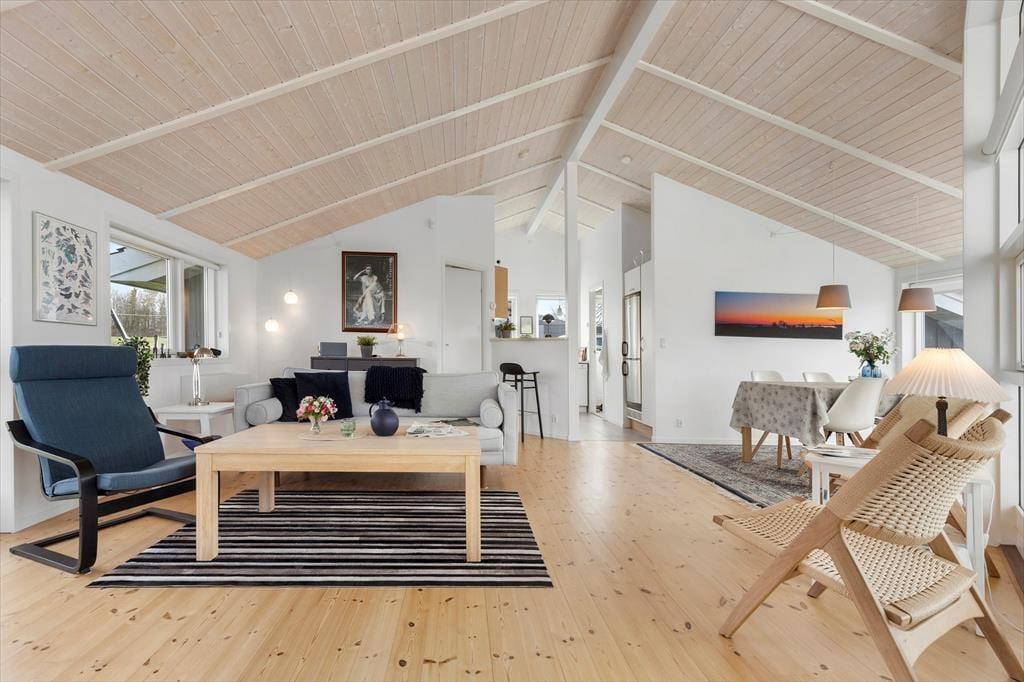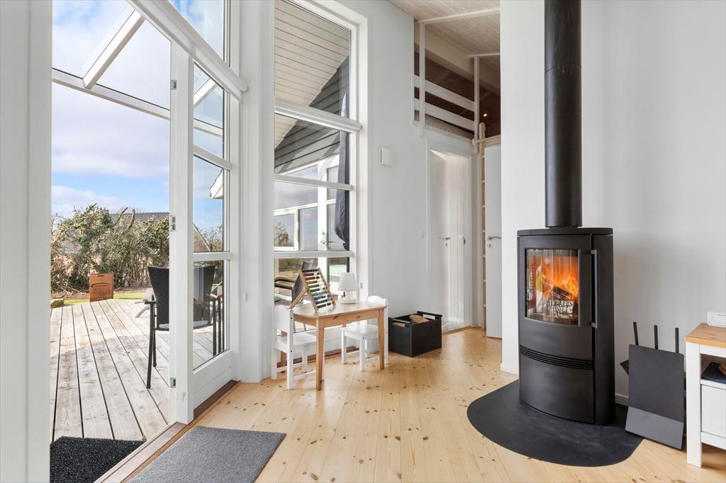 Sommerhus i Følle Strand, Østjylland, med plads til 6 voksne. Der er en hyggelig indretning med bl.a. brændeovn, og du finder desuden vaskemaskine, opvaskemaskine og tørretumbler i boligen.