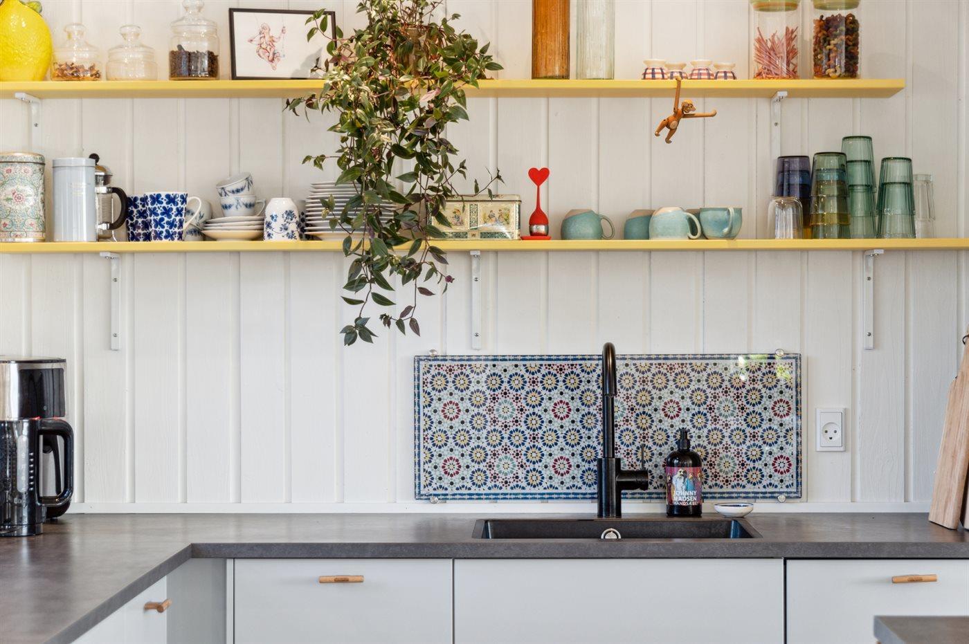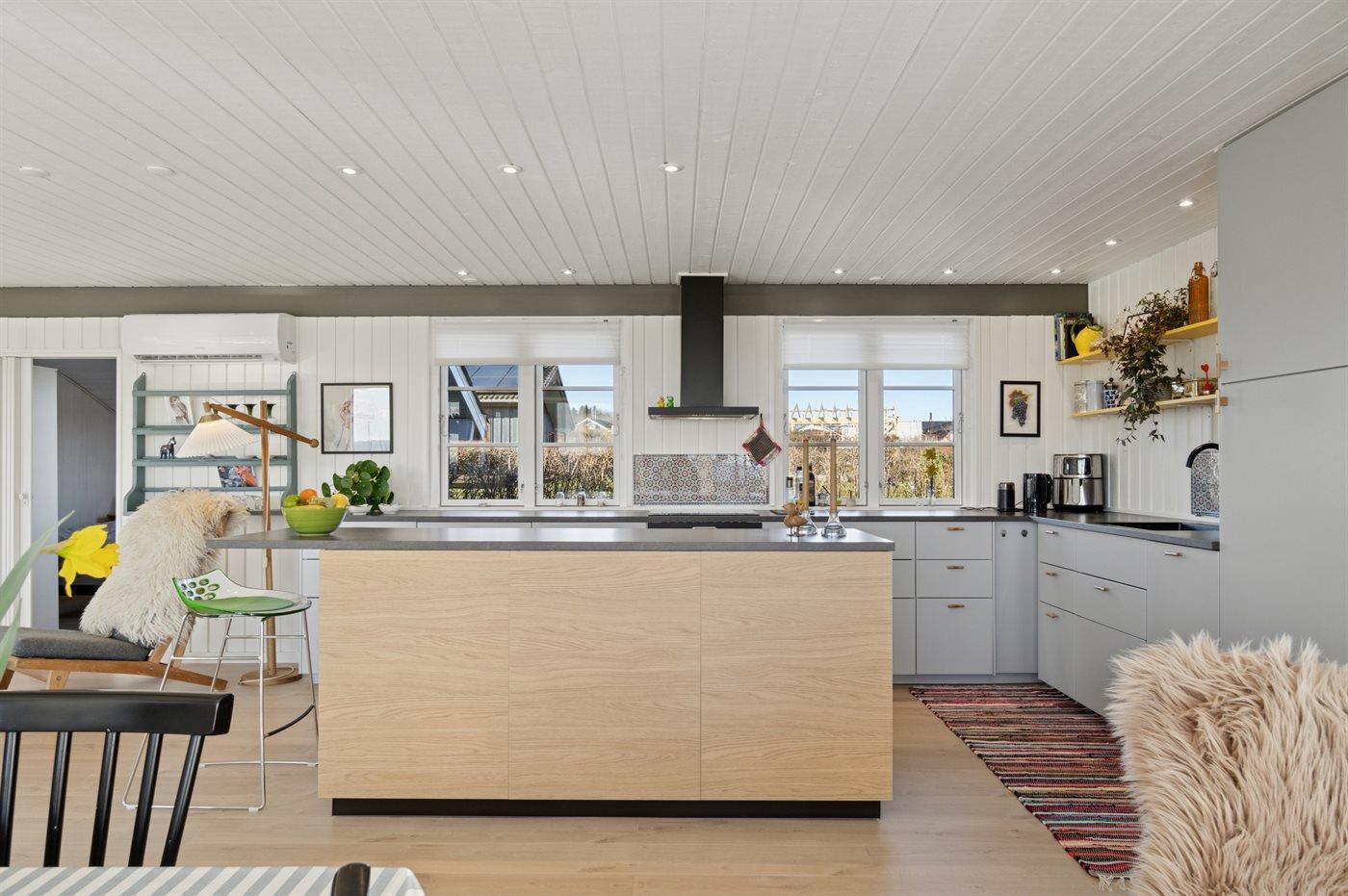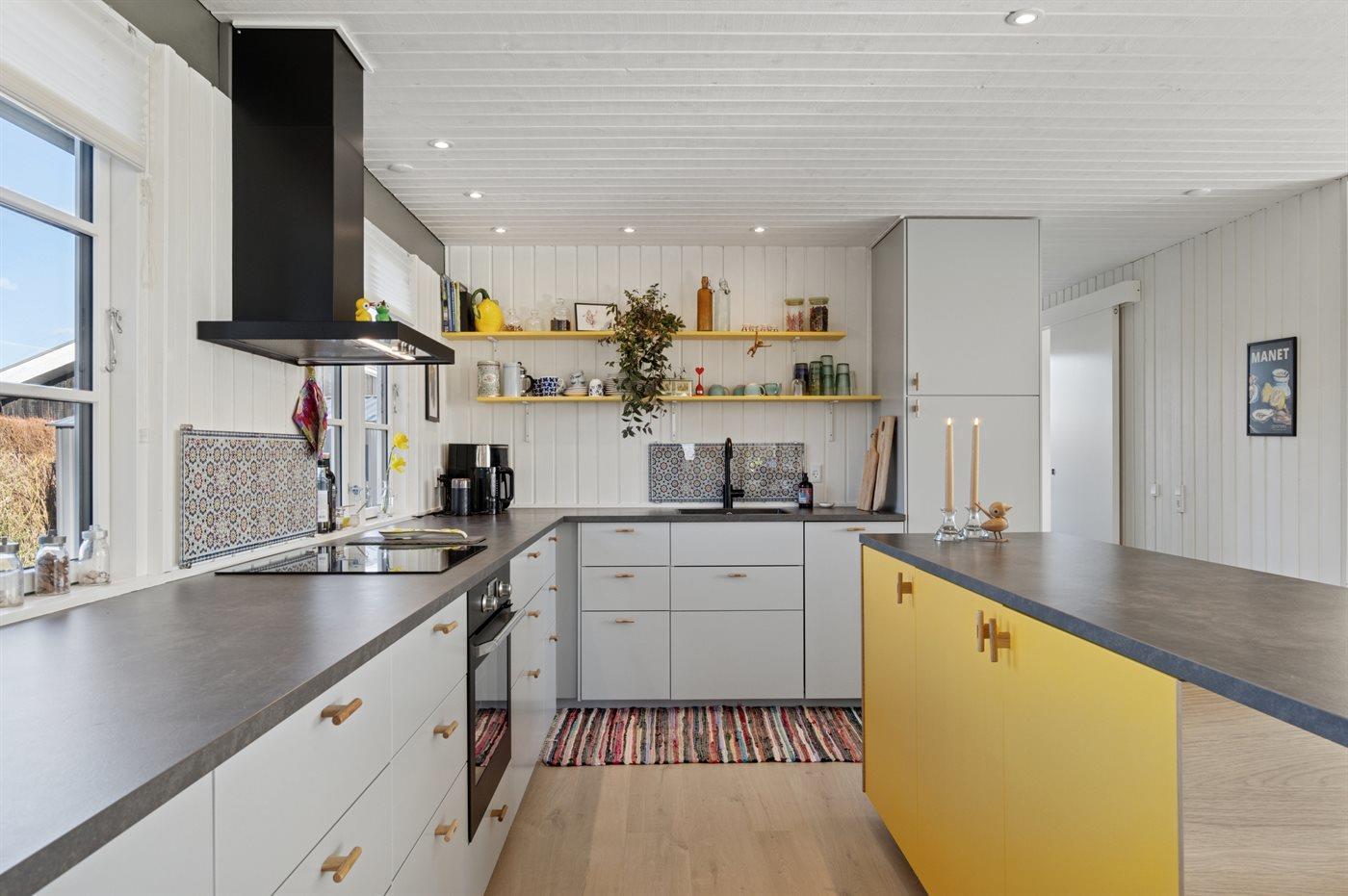 Køkkenet er udstyret med 1 køleskab. Der er 4 keramiske kogeplader, varmluftovn, mikrobølgeovn, Airfryer samt opvaskemaskine.