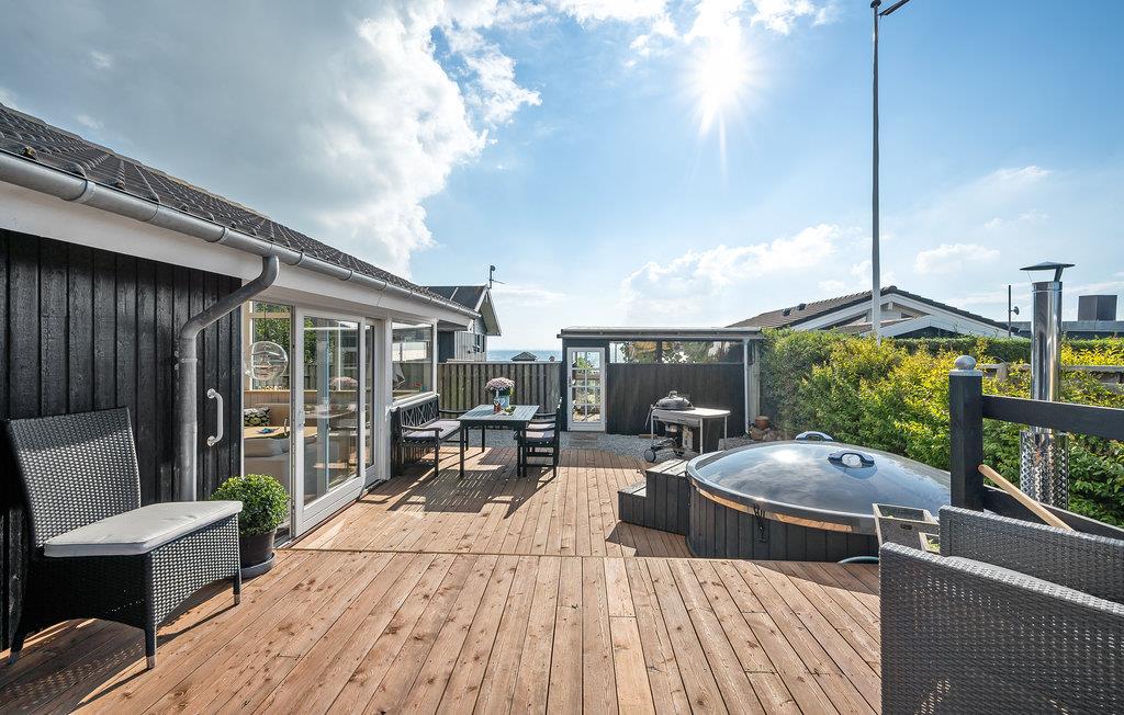 Glæd jer til at tilbringe mange timer udendørs, hvor den smukke træterrasse med indbygget vildmarksbad sørger for det hele. Slap af i det varme vand med et godt glas vin efter en aktiv dag ved havet, som ligger kun 50 m fra huset. På terrassen står kvalitetshavemøbler og grill klar til jer, så I let kan samles til hyggelig grillaftener.