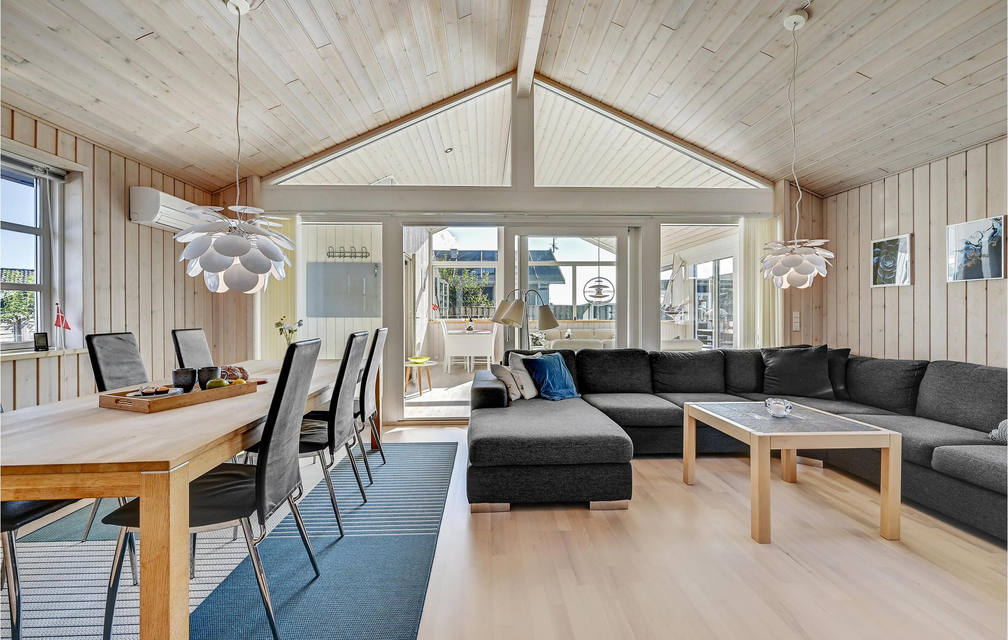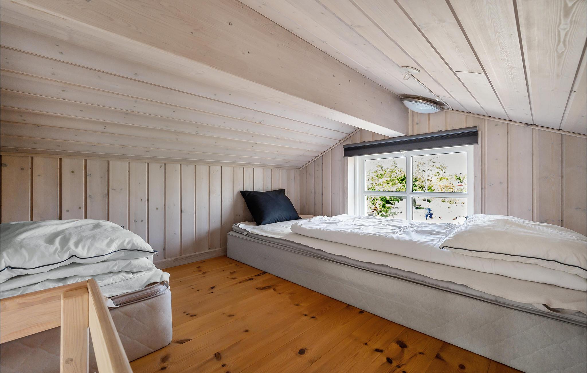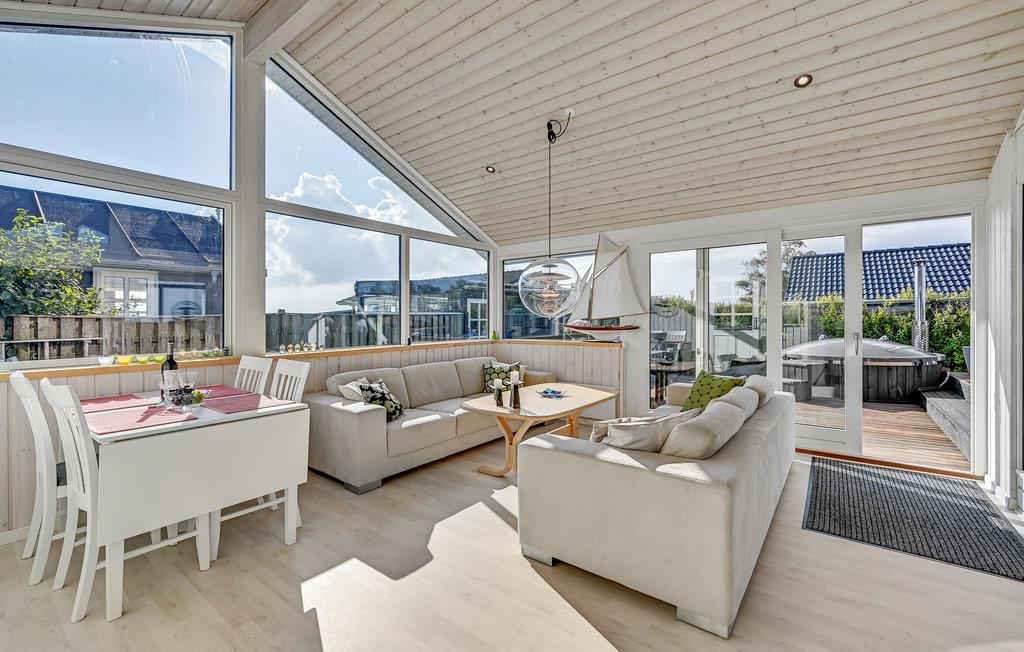 Velkommen til store, lyse rum med moderne indretning og masser af plads til afslapning og velvære. Det åbne køkken og opholdsområde inviterer jer til at nyde hinandens selskab mens feriens måltider tilberedes og en knitrende ild i brændeovnen skaber ekstra hygge. Her er to soveværelser, samt yderligere sovepladser på hemsen.