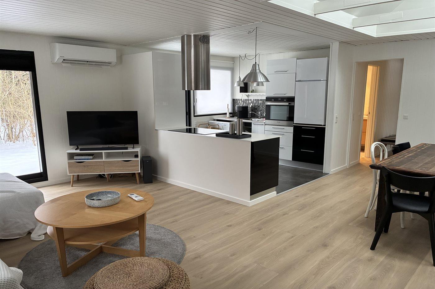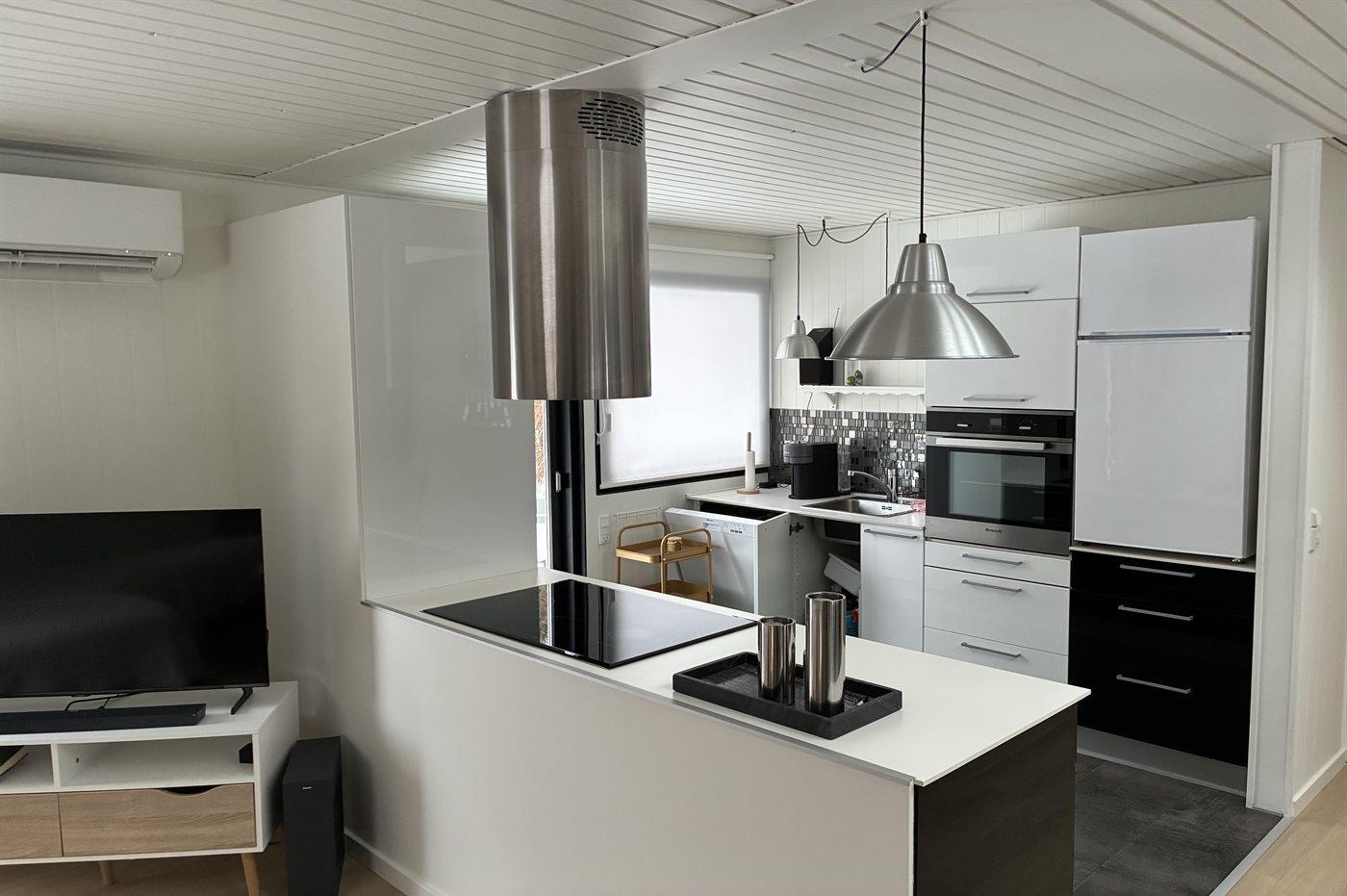 Køkkenet er udstyret med 1 køleskab. Der er 4 induktionskogeplader, varmluftovn samt opvaskemaskine.