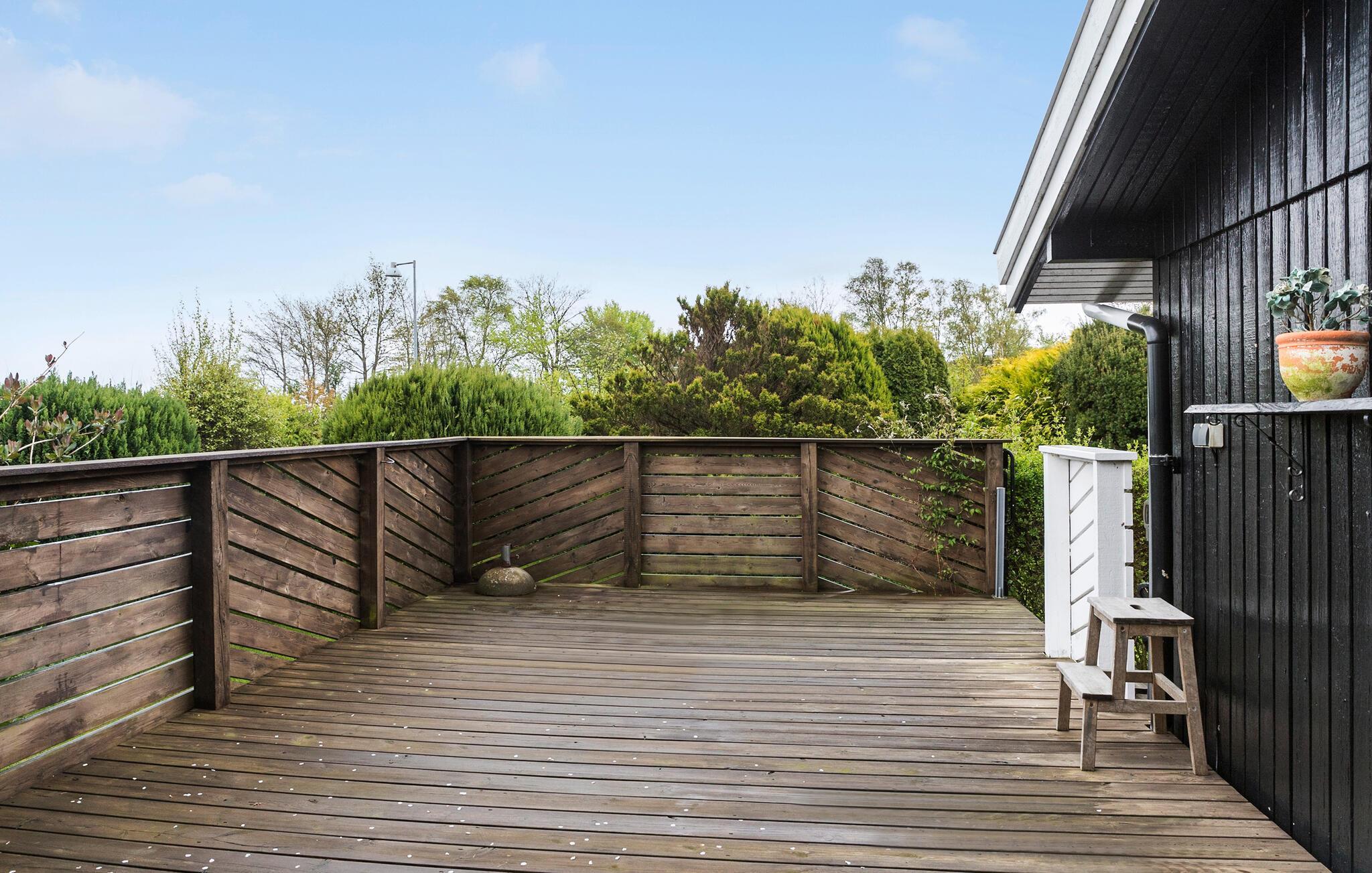 Når solen skinner, kan I nyde den lige fra morgenstunden på terrassen med en god kop kaffe. Dele af terrassen er overdækket, så I også kan finde skygge til at læse en god bog, mens børnene løber rundt og leger i haven. Holder vejret hele dagen, kan I lade en smuk aften gå på hæld med saftige bøffer fra grillen og et godt glas vin, mens I lægger planer for de kommende dage.