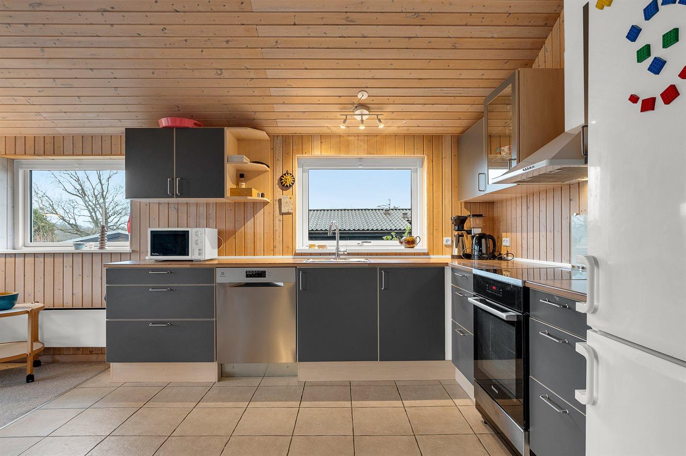 Køkkenet er udstyret med 1 køleskab. Der er 4 induktionskogeplader, varmluftovn, mikrobølgeovn samt opvaskemaskine.