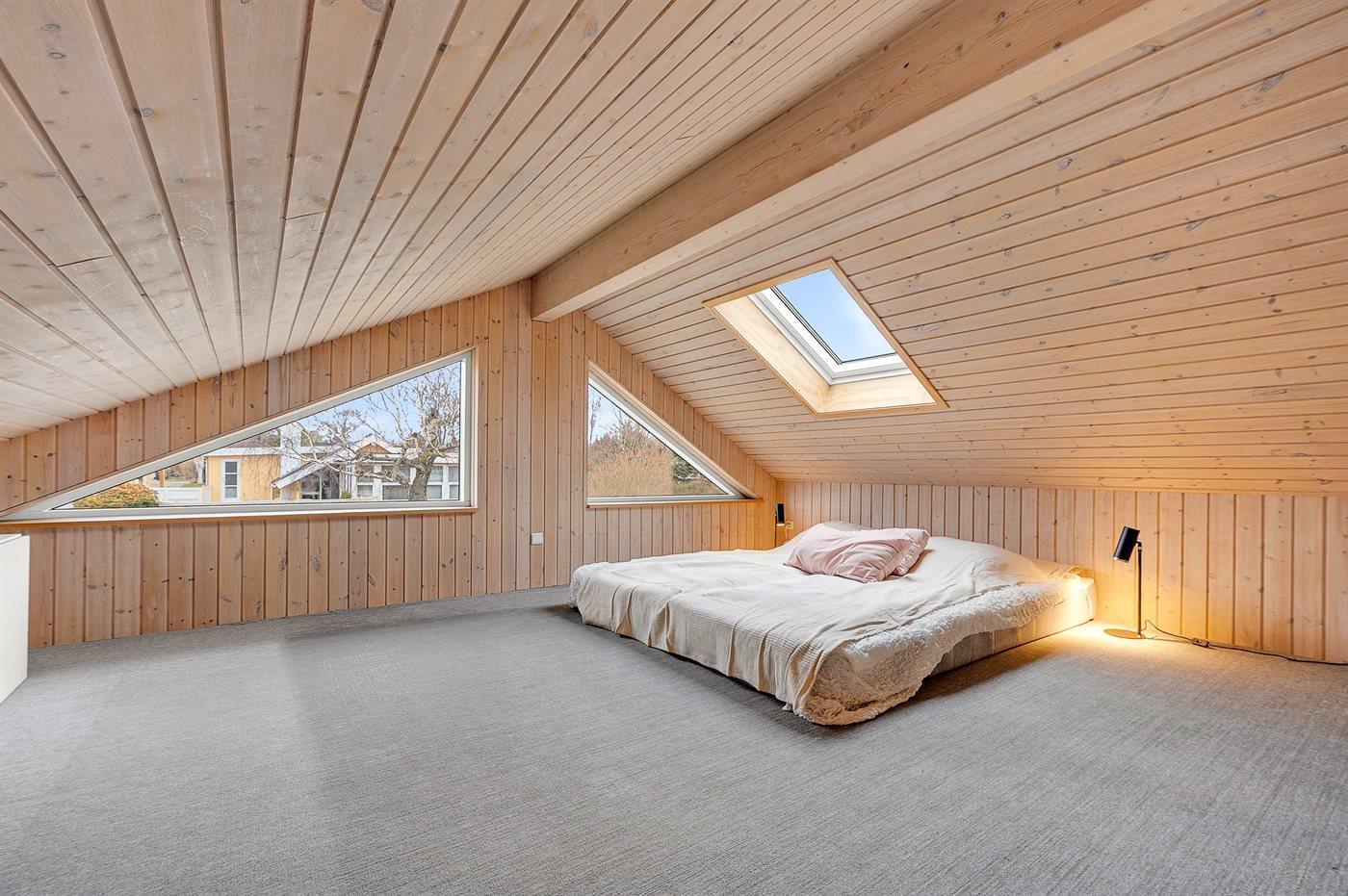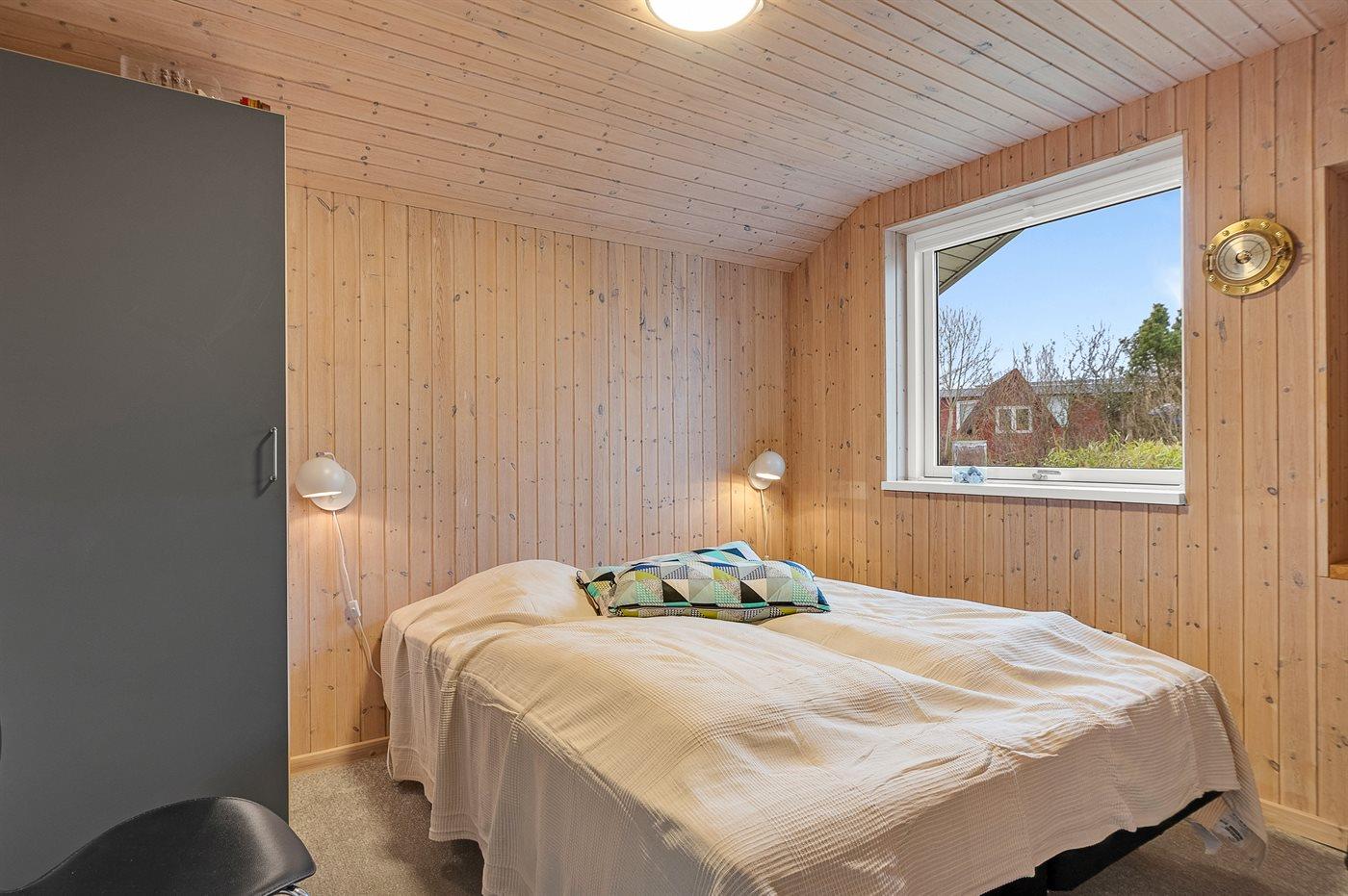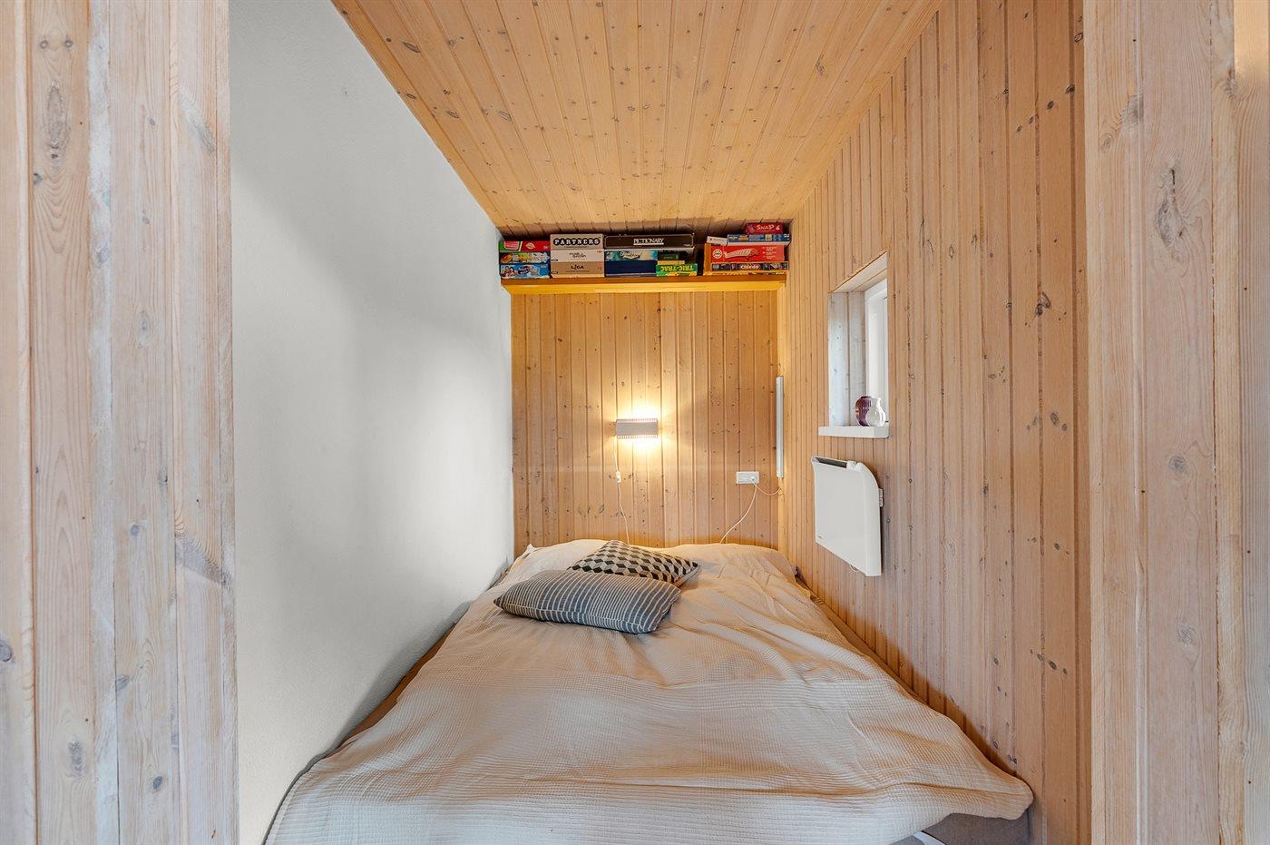 Der er i alt 3 soveværelser. Sovepladserne fordeler sig på: 4 sovepladser i dobbeltsenge. 2 sovepladser på madrasser. 2 sovepladser i alkove. 2 af disse sovepladser befinder sig på husets hems, og 2 sovepladser findes i stuen. Derudover er der 1 stk. barneseng.