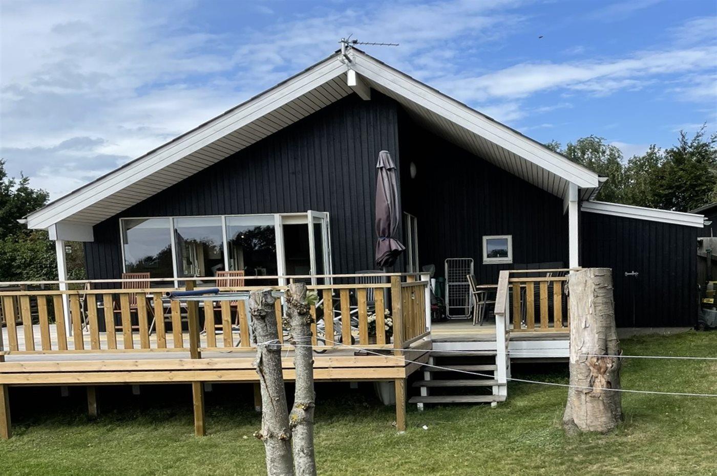 Hyggeligt sommerhus nær Millinge med stor terrasse og havudsigt, perfekt til afslapning og naturoplevelser.
