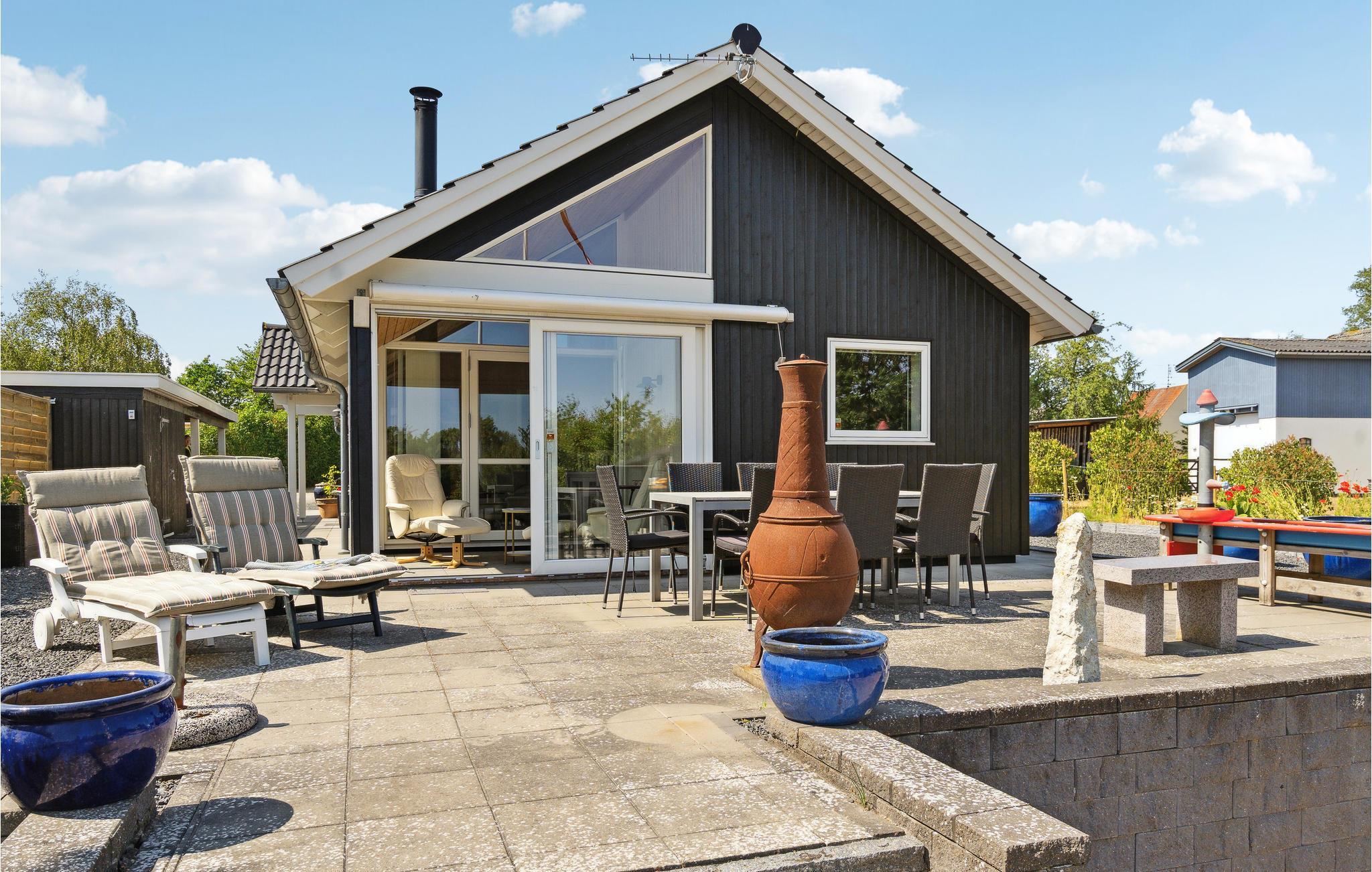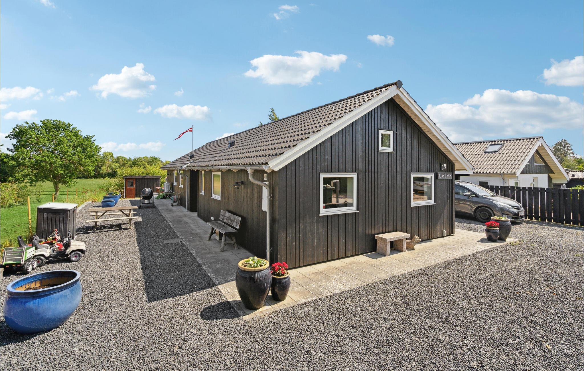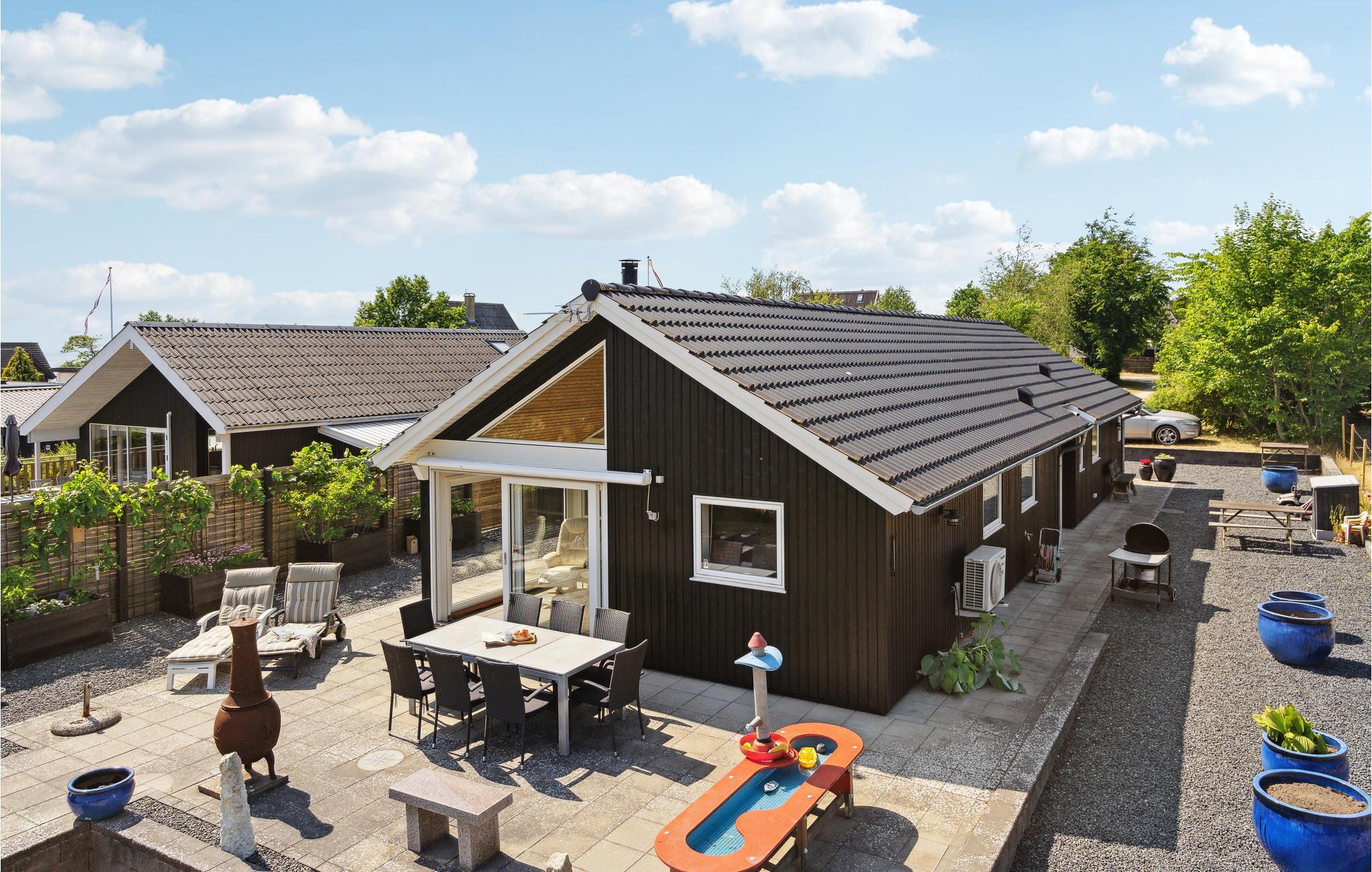 Hyggeligt feriehus tæt på stranden i Faldsled med stor terrasse og legeredskaber til børnene.