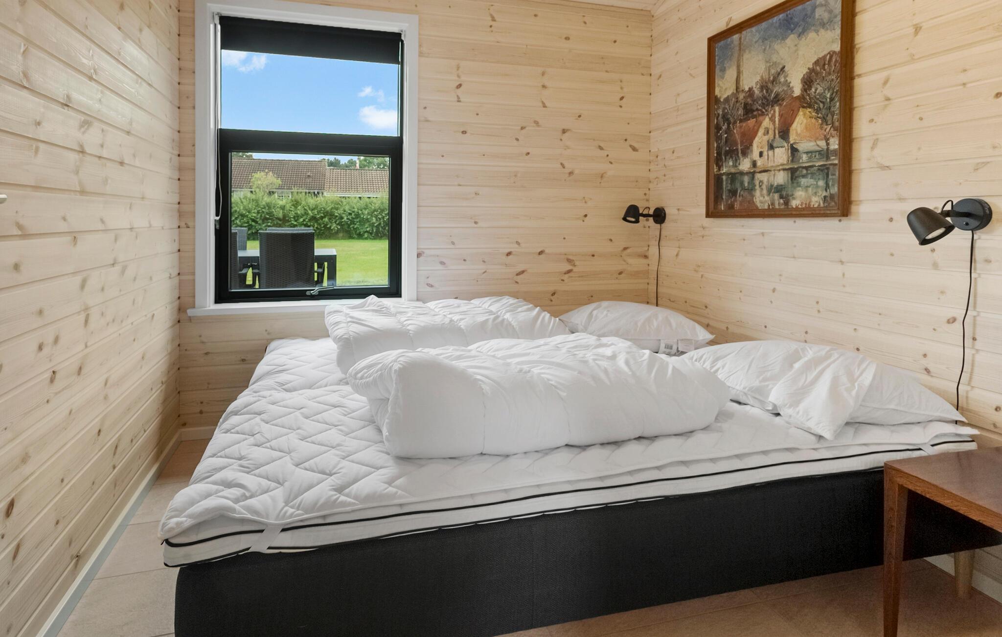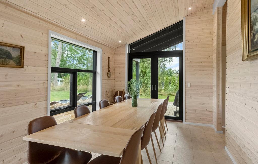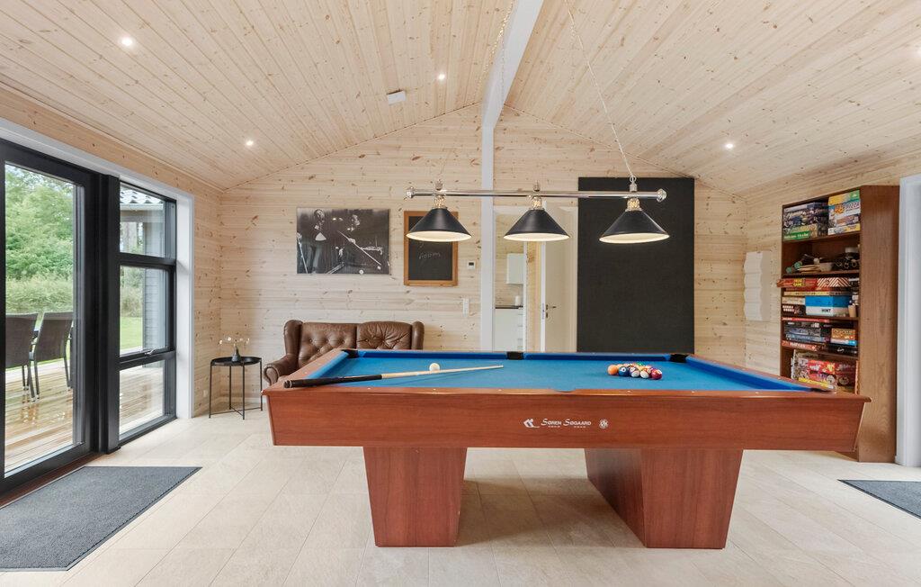Dette etplans feriehus har et lyst og stilfuldt interiør. Masser af træ, store vinduer med smuk udsigt over de grønne omgivelser og hyggelig belysning skaber en virkelig behagelig atmosfære. Snak ved det lange spisebord, spil billard eller bordtennis eller lad børnene vælge et brætspil. Lyt til den knitrende brændeovn, mens I slapper af i lænestolen eller tryll en lækker middag frem i det indbydende køkken.