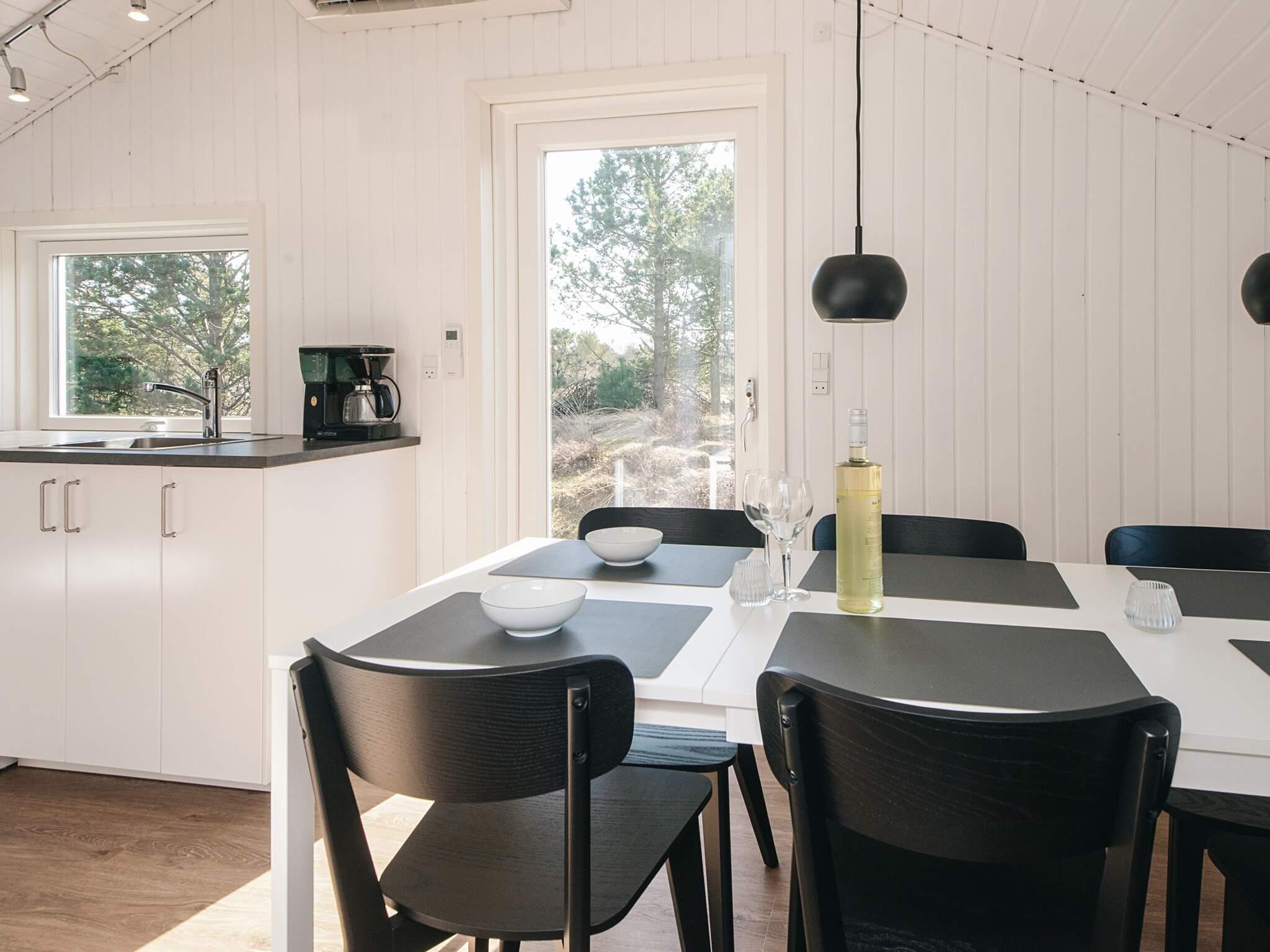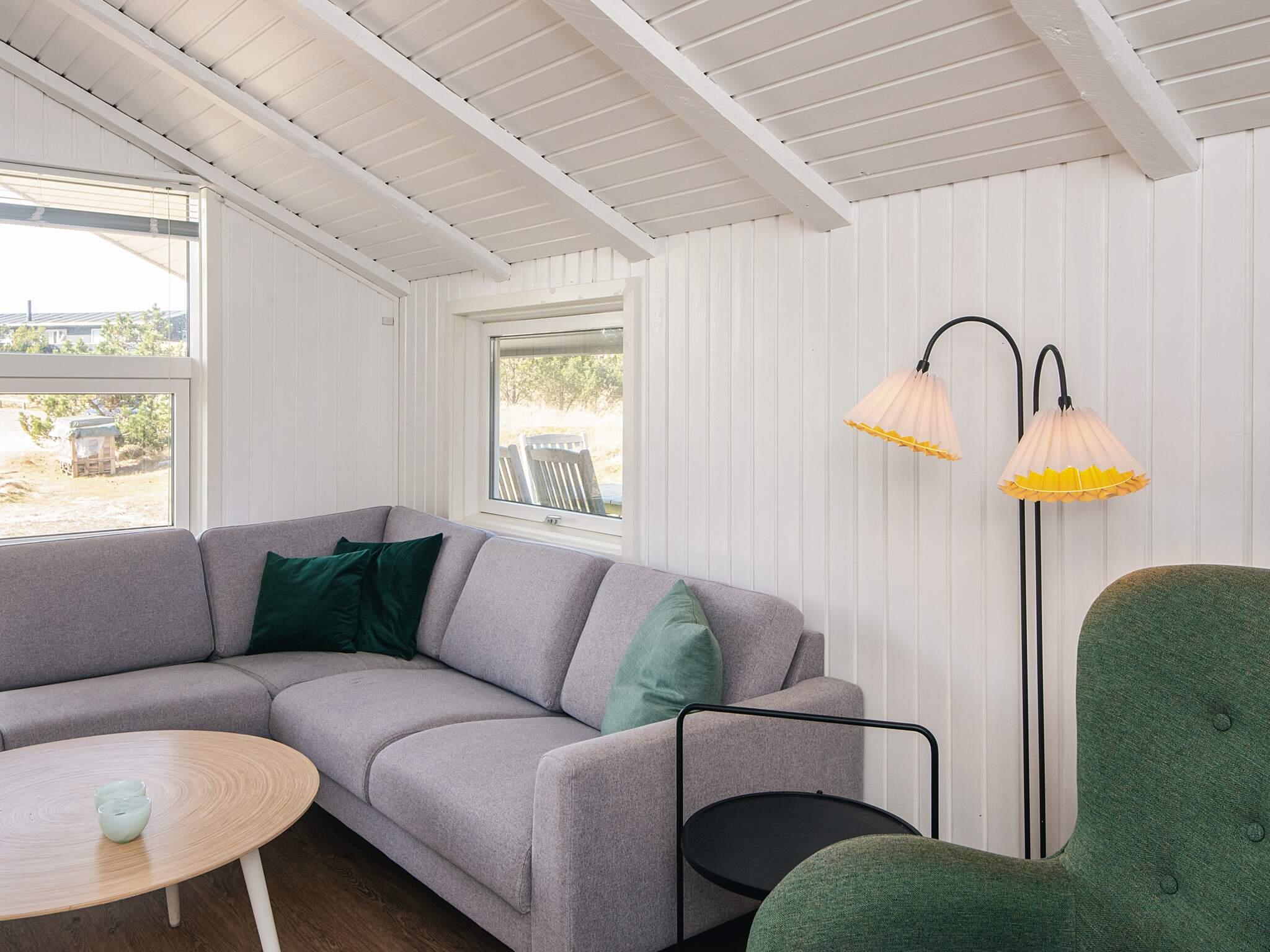 Indendørs fremstår huset lyst og indbydende med en åben forbindelse mellem køkken og stue, som danner et naturligt samlingspunkt for ferien. Brændeovnen skaber ekstra hygge på køligere dage, mens varmepumpen sikrer en behagelig temperatur året rundt. I stuen findes desuden et Smart-TV.