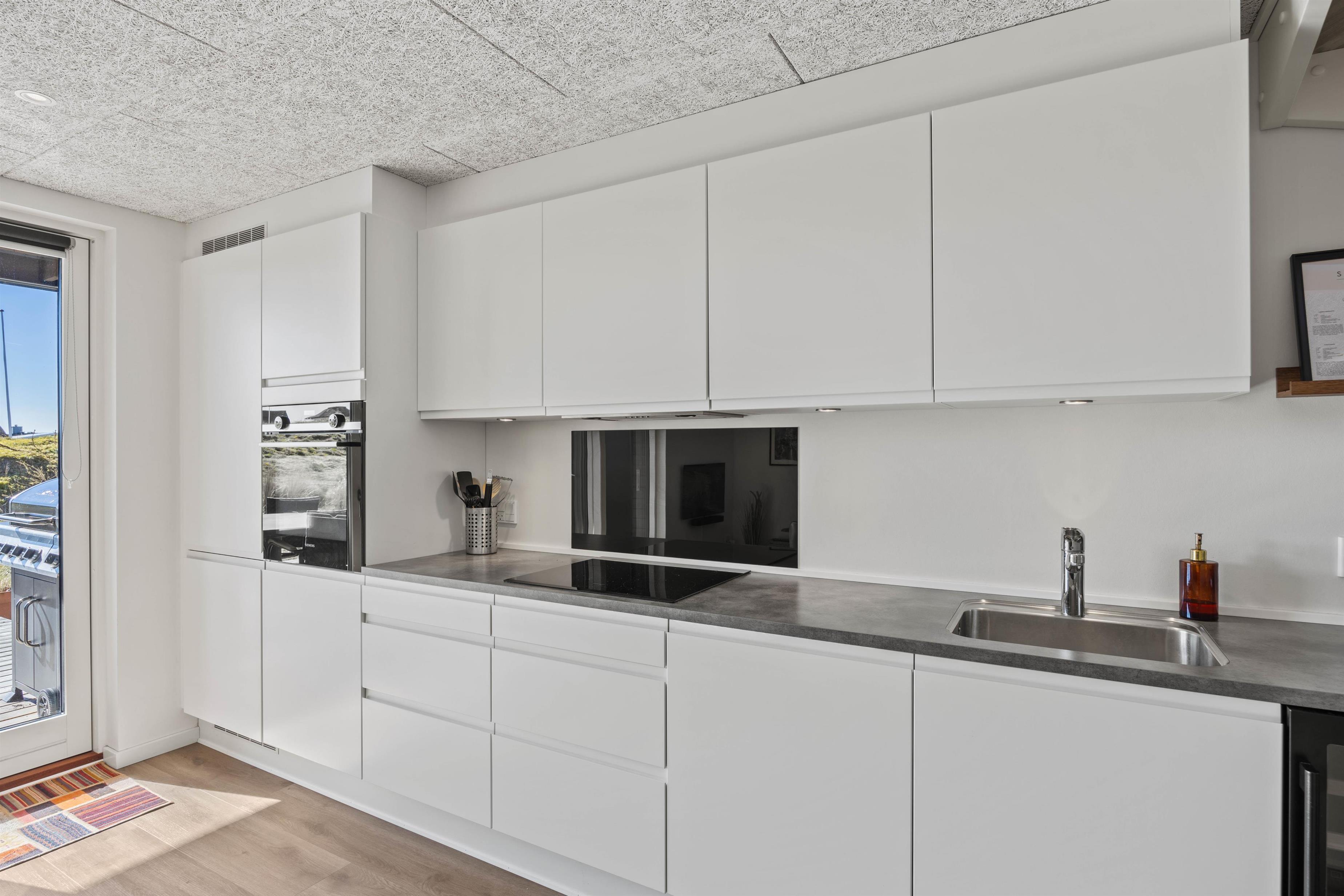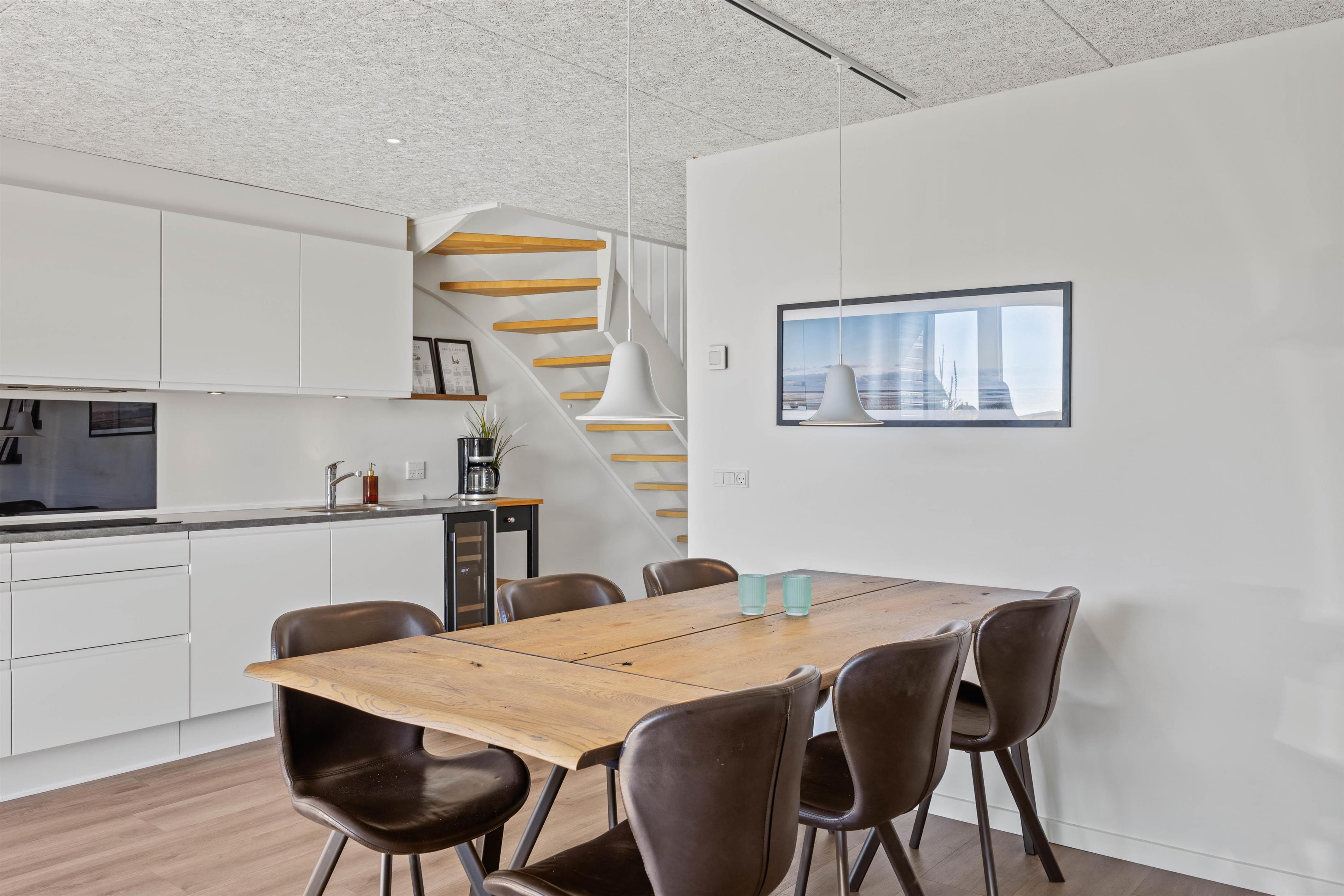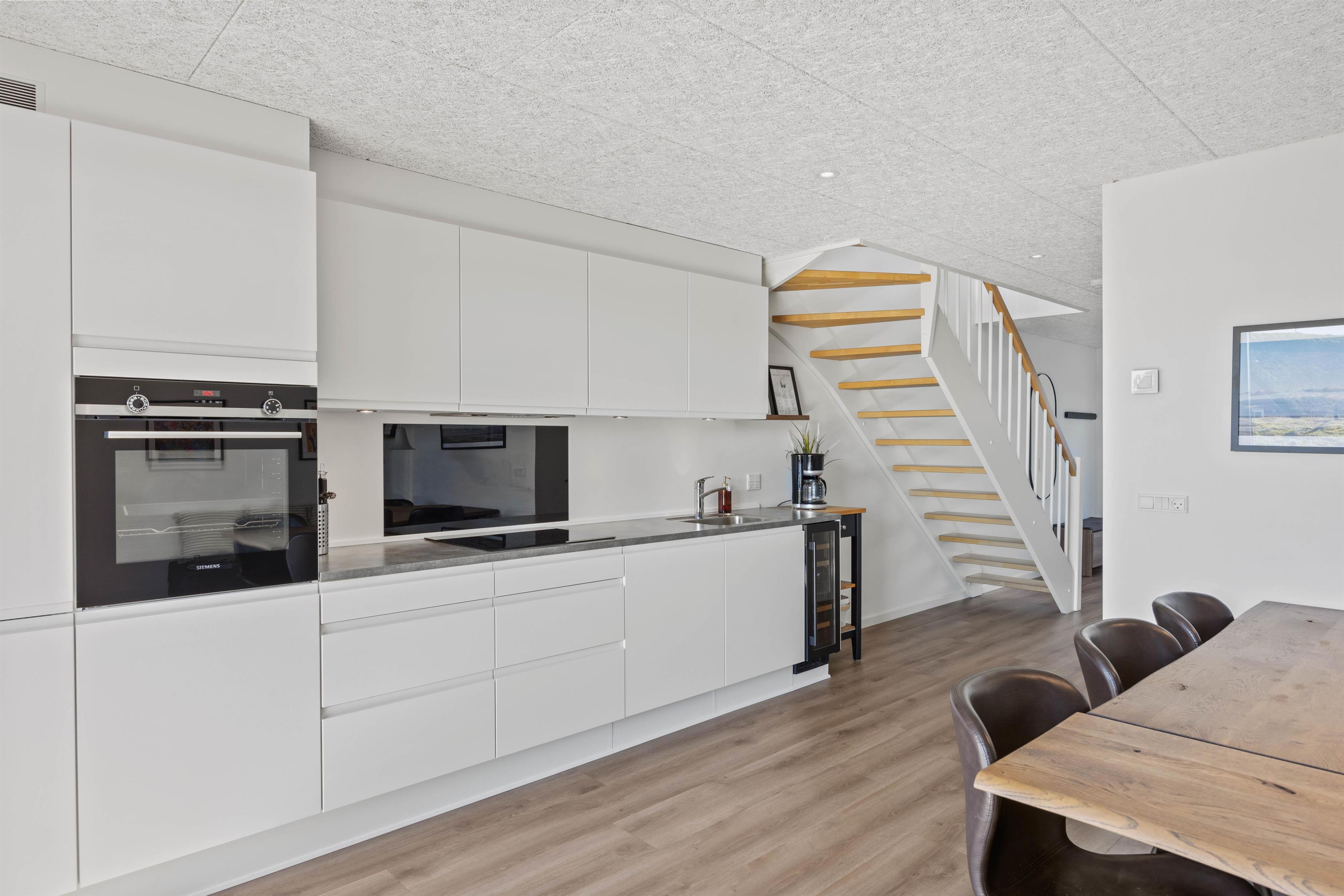 I stueplan ligger den åbne og veludstyrede køkkenafdeling. Her er både vinkøleskab, induktionskomfur, opvaskemaskine, mikroovn og en køle-/frysekombination. Alt, hvad I skal bruge til en hyggelig aften med madlavning og samvær. Ved spisebordet ved siden af køkkenet er der god plads til fælles måltider og måske et spil kort til et glas vin.