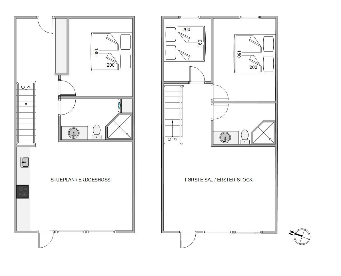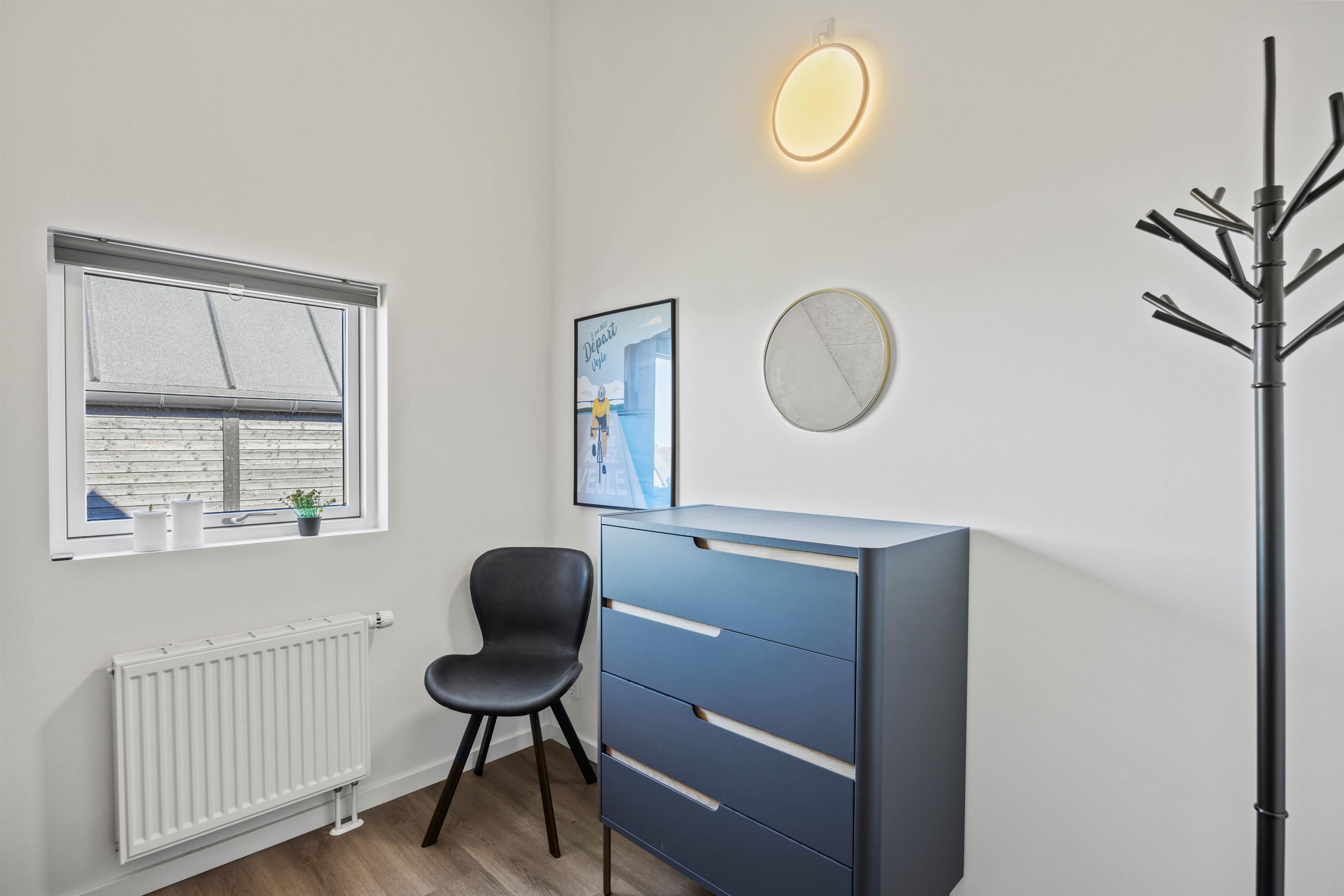 Ferielejligheden er opført i 2021, og indendørs finder I en hyggelig opholdsstue på førstesalen, indrettet med komfortable møbler og tv med danske kanaler. Her kan I slappe af i sofaen, se en god film eller bare nyde udsigten gennem de store vinduer. Fra stuen har I udgang til en overdækket altan, hvor morgenkaffen eller en stille stund med en god bog venter.