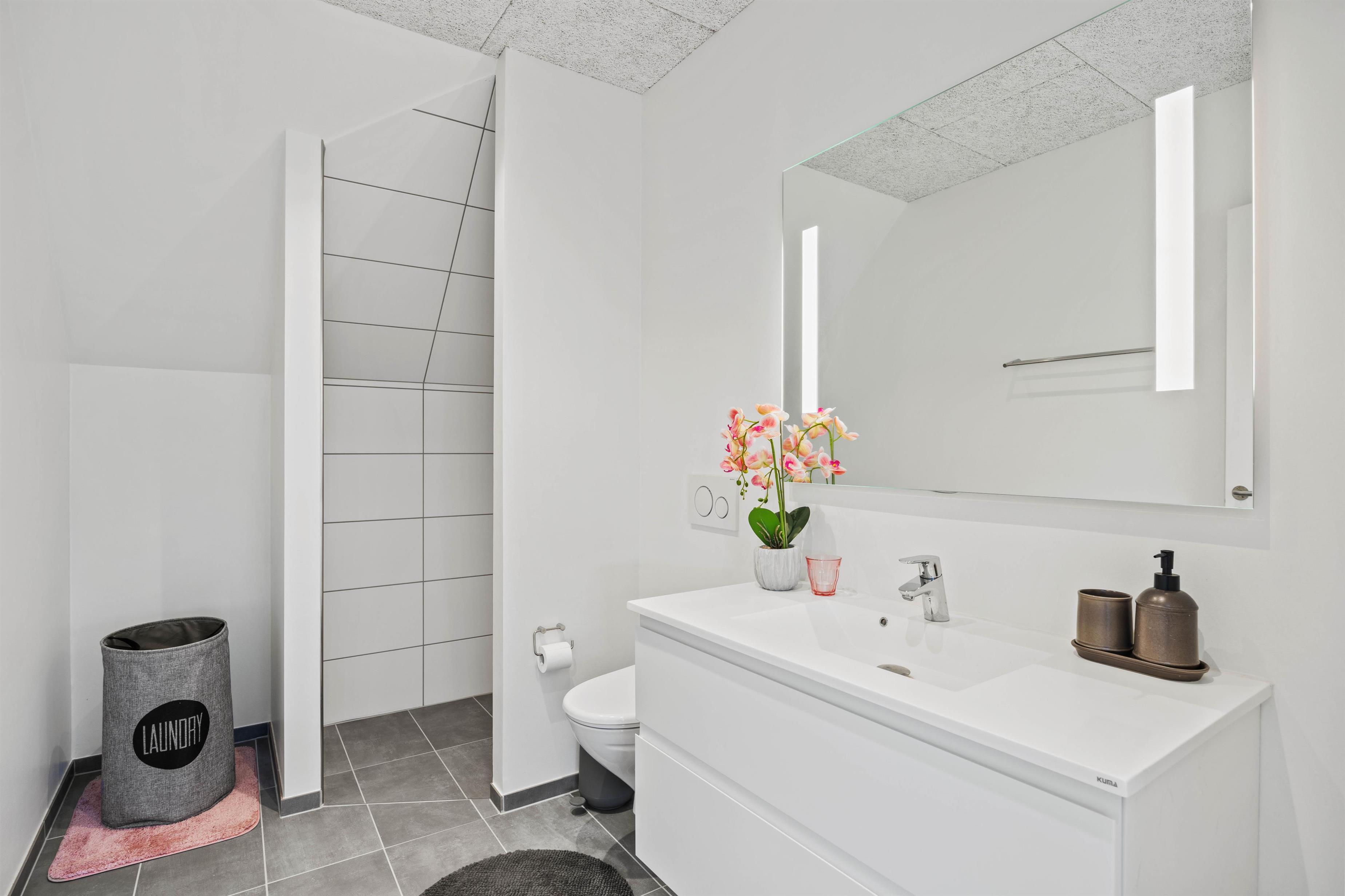 På førstesalen ligger også det ene af 2 moderne badeværelser samt 2 af de i alt 3 lyse soveværelser med dobbeltseng.