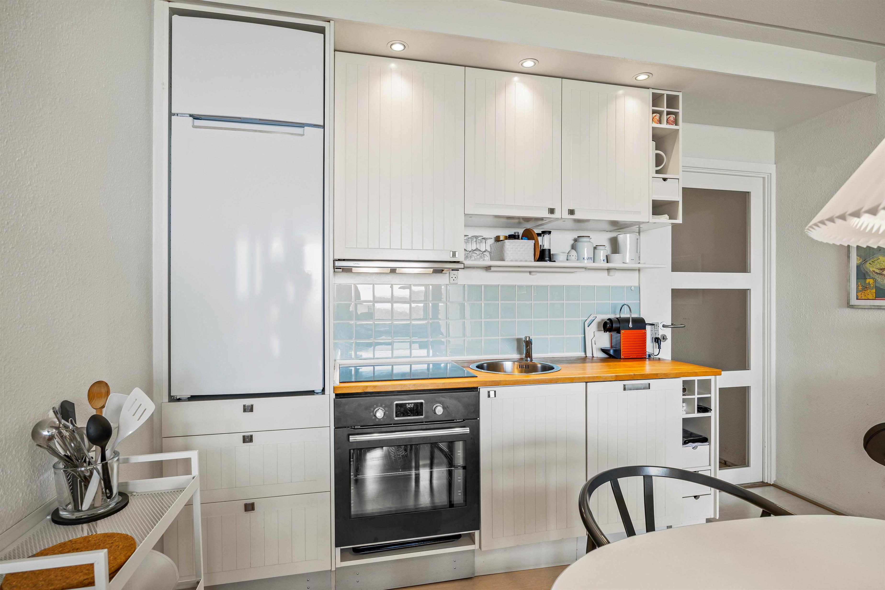 Ferielejligheden har et opholdsrum med komfortable møbler, hvorfra I kan nyde udsigten og hygge med en god bog eller et slag kort ved sofaen eller bare Chromcaste en film. I det overskuelige og veludstyrede køkken er der ud over ovn og kogeplader et køleskab med frostboks samt en opvaskemaskine til rådighed.