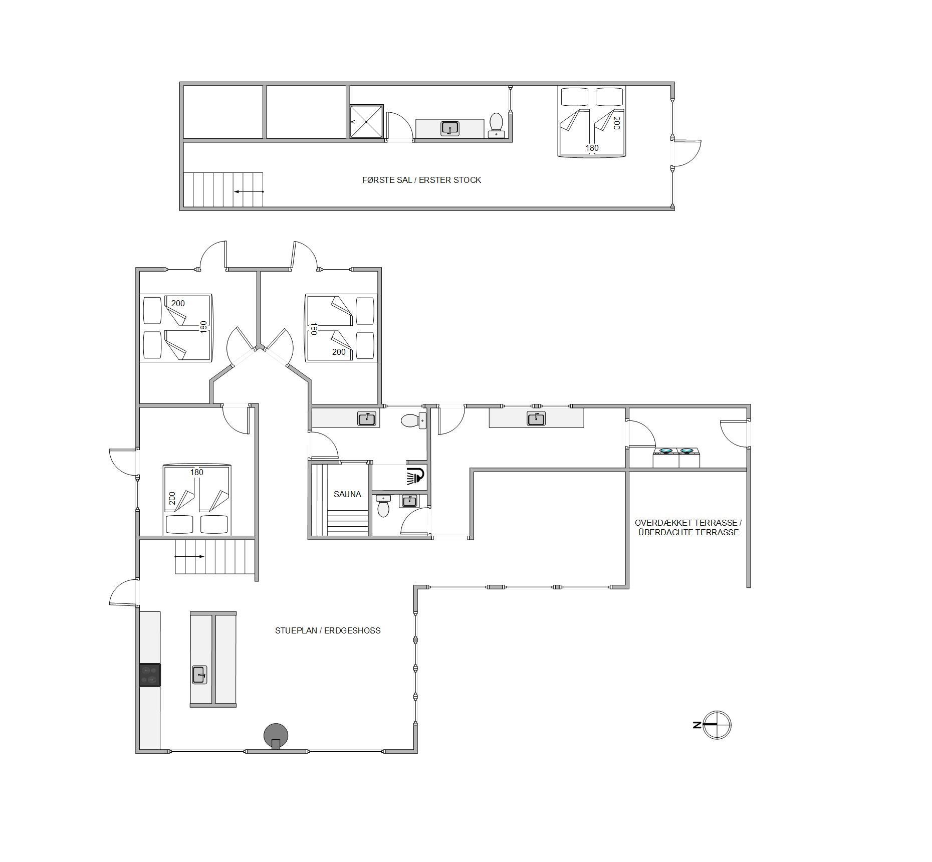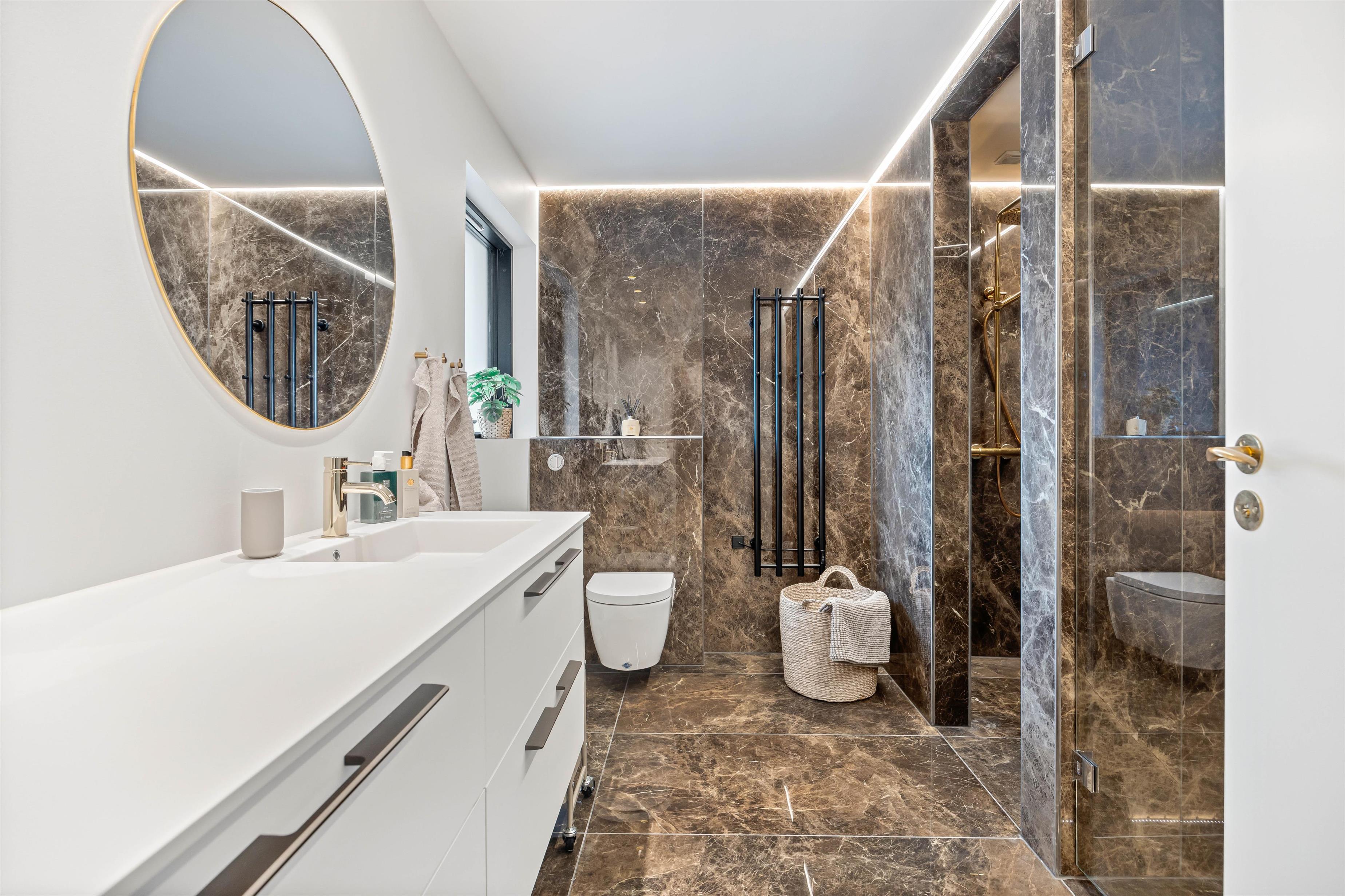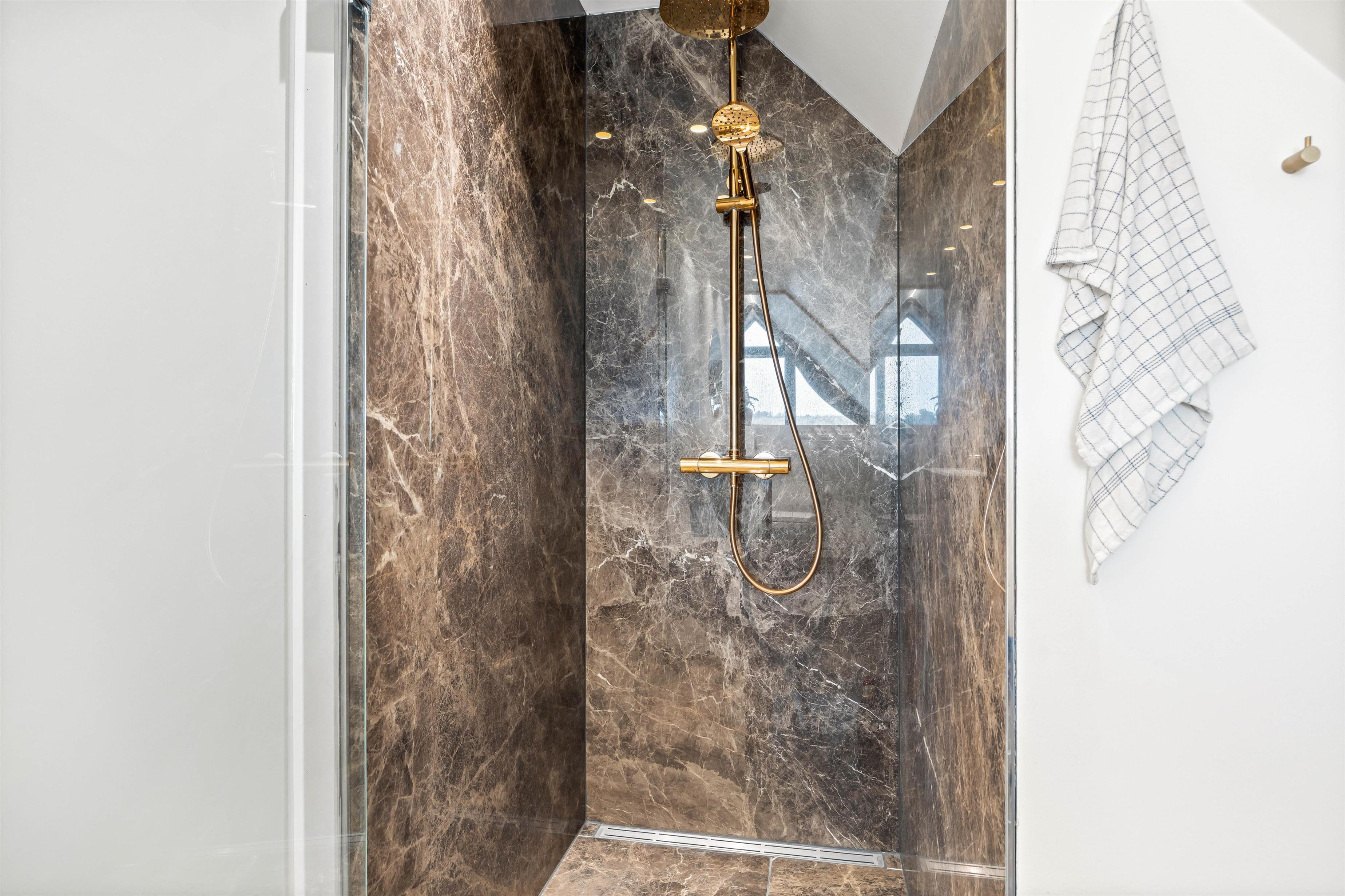 De 2 badeværelser har indretningsmæssigt flotte marmordetaljer, og begge har varme i gulvet, og der findes også et separat toilet, så ingen grund til at bekymre jer om kødannelse. Arrangér din egen hygge- og spadag, der ender med en tur i saunaen og måske en tur udenfor med et koldt gys under bruseren? Udendørsbruseren er også ideel efter en tur på stranden på de varme dage til at få det sidste sand skyllet af.