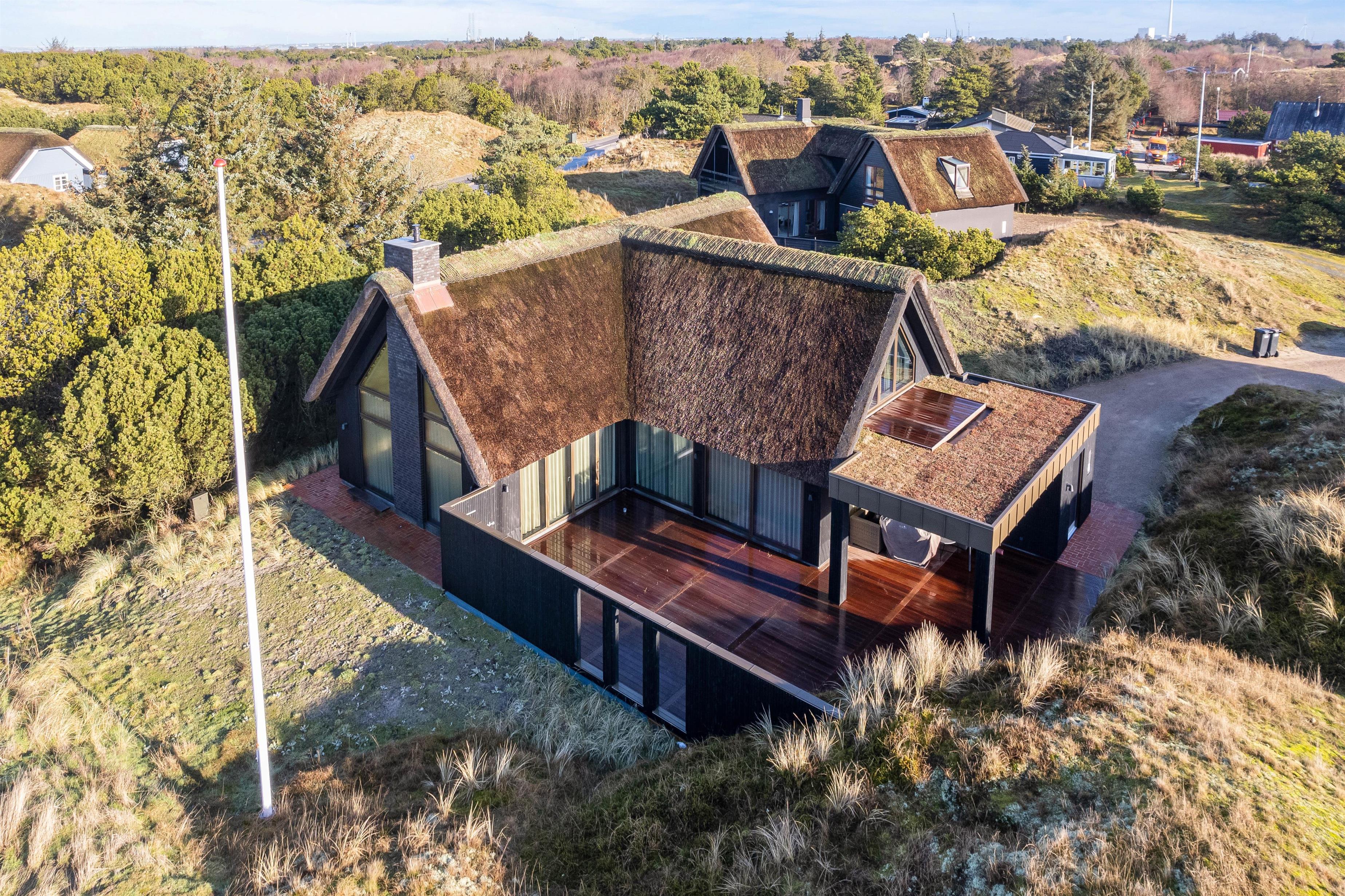 Trænger I til ferie i et topmoderne, nordisk inspireret sommerhus med stråtag, der er bygget i 2022, og som ligger i et roligt og naturskønt område ved Fanø Bad? Så er dette feriehus lige det rette for jer. Feriehuset på Skovsletten 6 har en fantastisk beliggenhed tæt på skovområde og kun 500 meter til strand og golfbane. Her får I altså ægte feriestemning med plads til 7 personer - og jeres hund er her også velkommen.