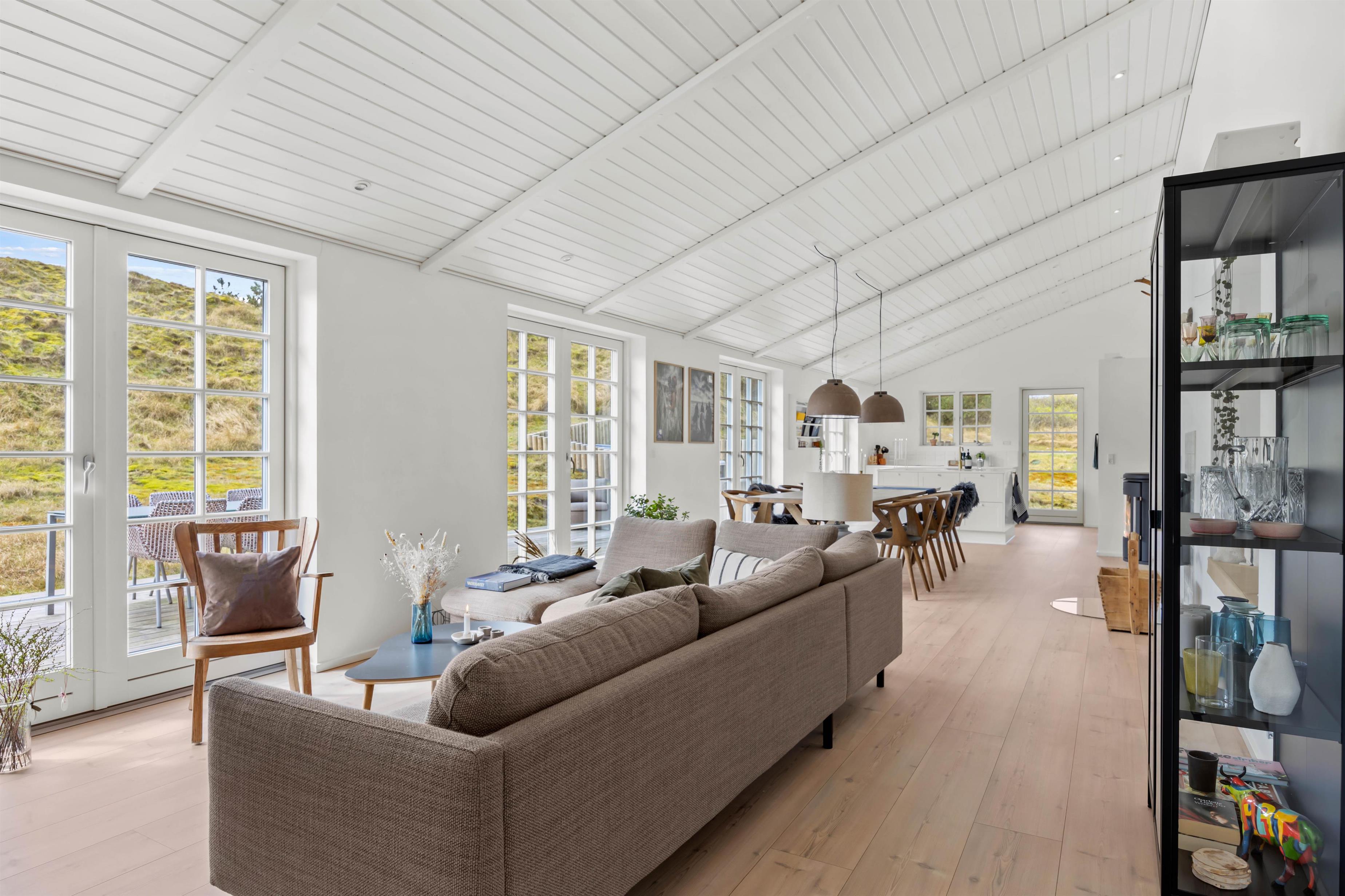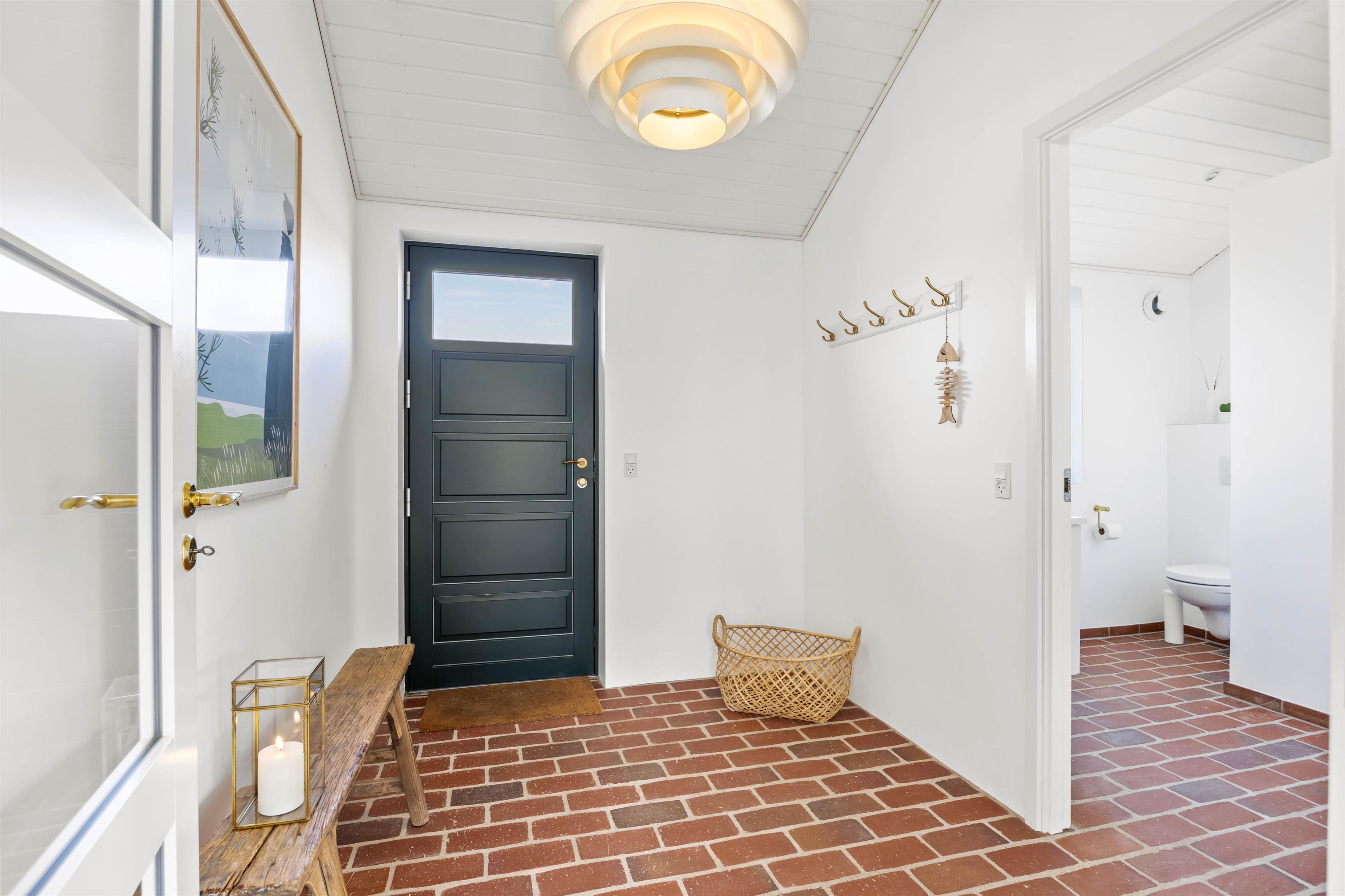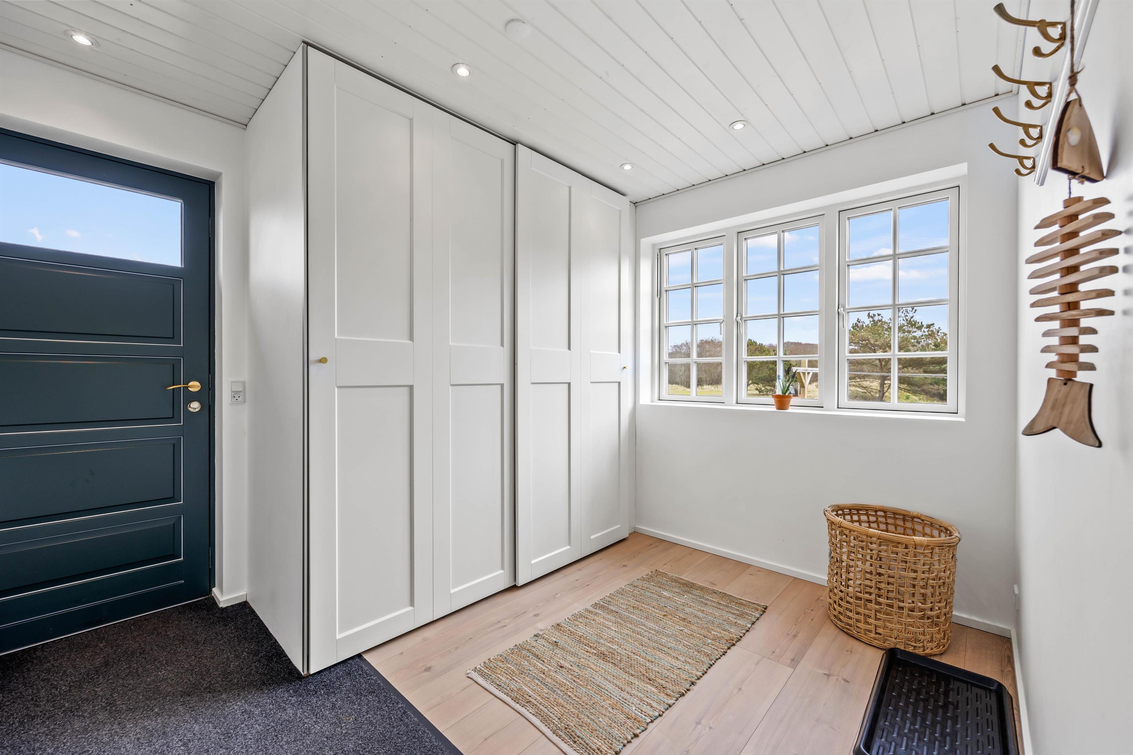 Skovsletten 17 kan danne rammerne omkring en fantastisk ferie ved Vesterhavet. Her kan bo op mod 6 gæster og man kan virkelig fornemme, hvordan her er kræset for detaljerne. Her kombineres de rustikke murstensgulve med de lysebrune nuancer, der sammen skaber en balanceret og smagfuld indretning. I det store køkkenalrum i forbindelse med stuen, har brændeovnen en central placering, så I får mest mulig glæde af den. Nyd det skønne lysindfald og læs en bog fra den fine lille alkove eller i sofaen.