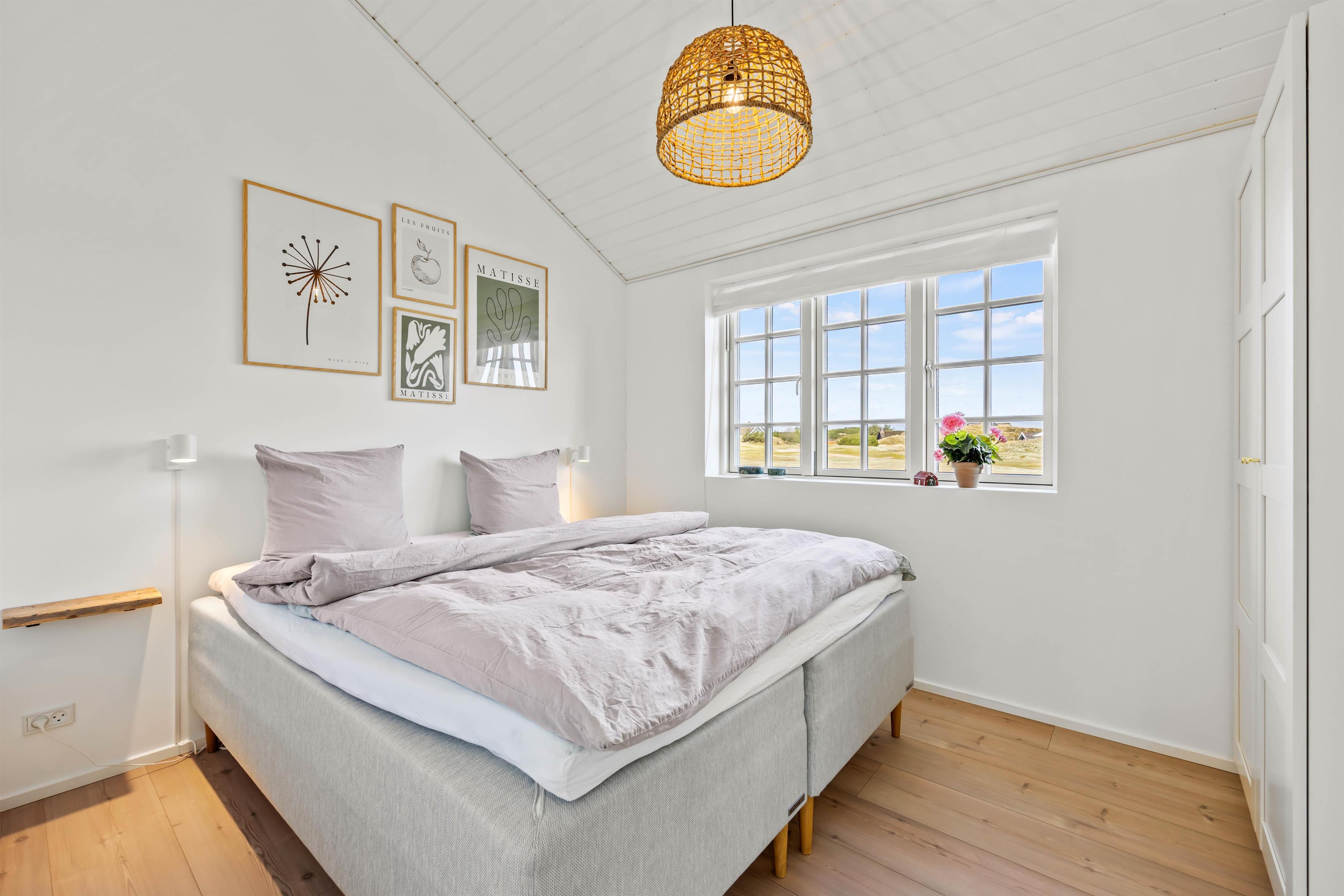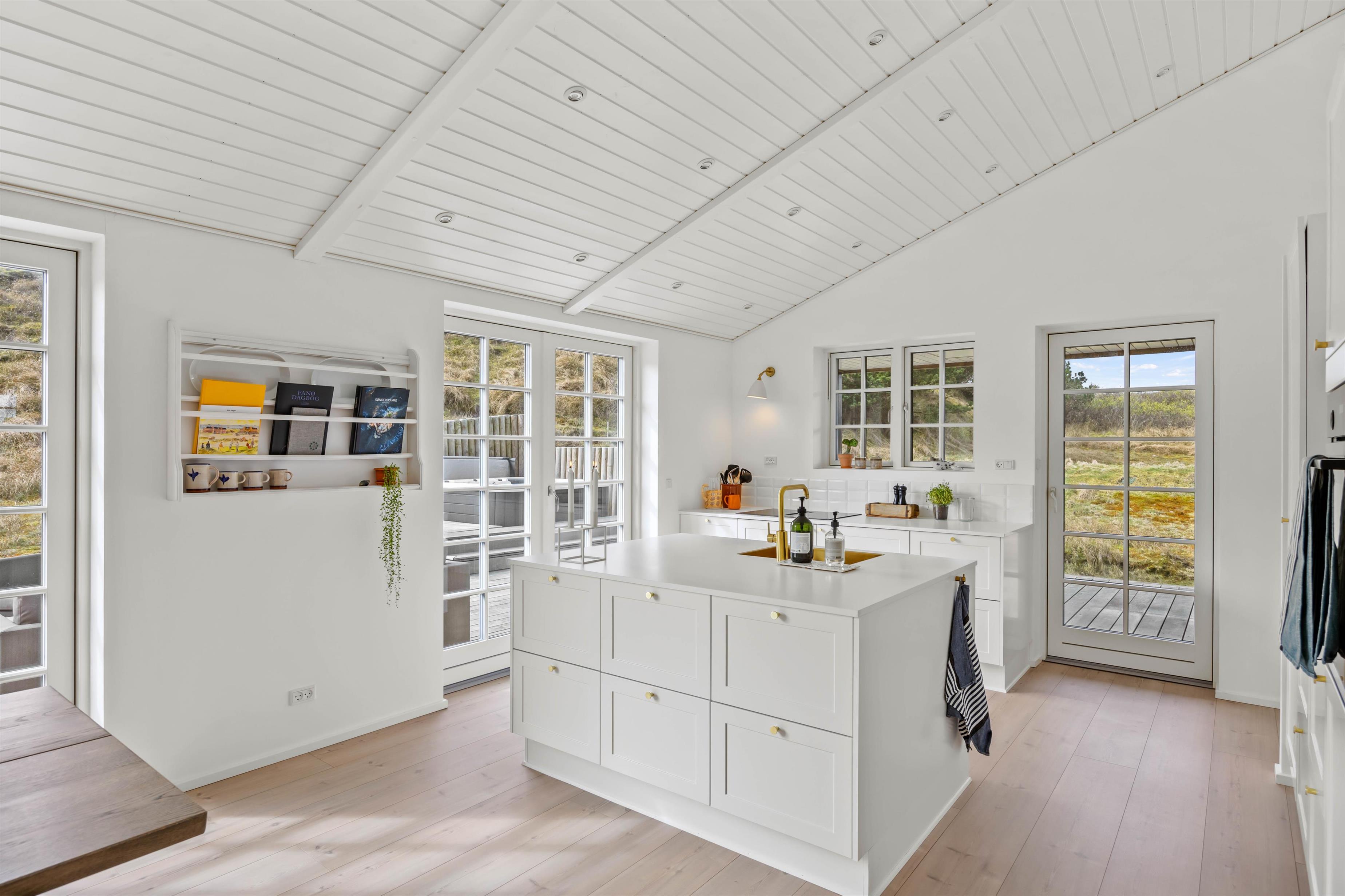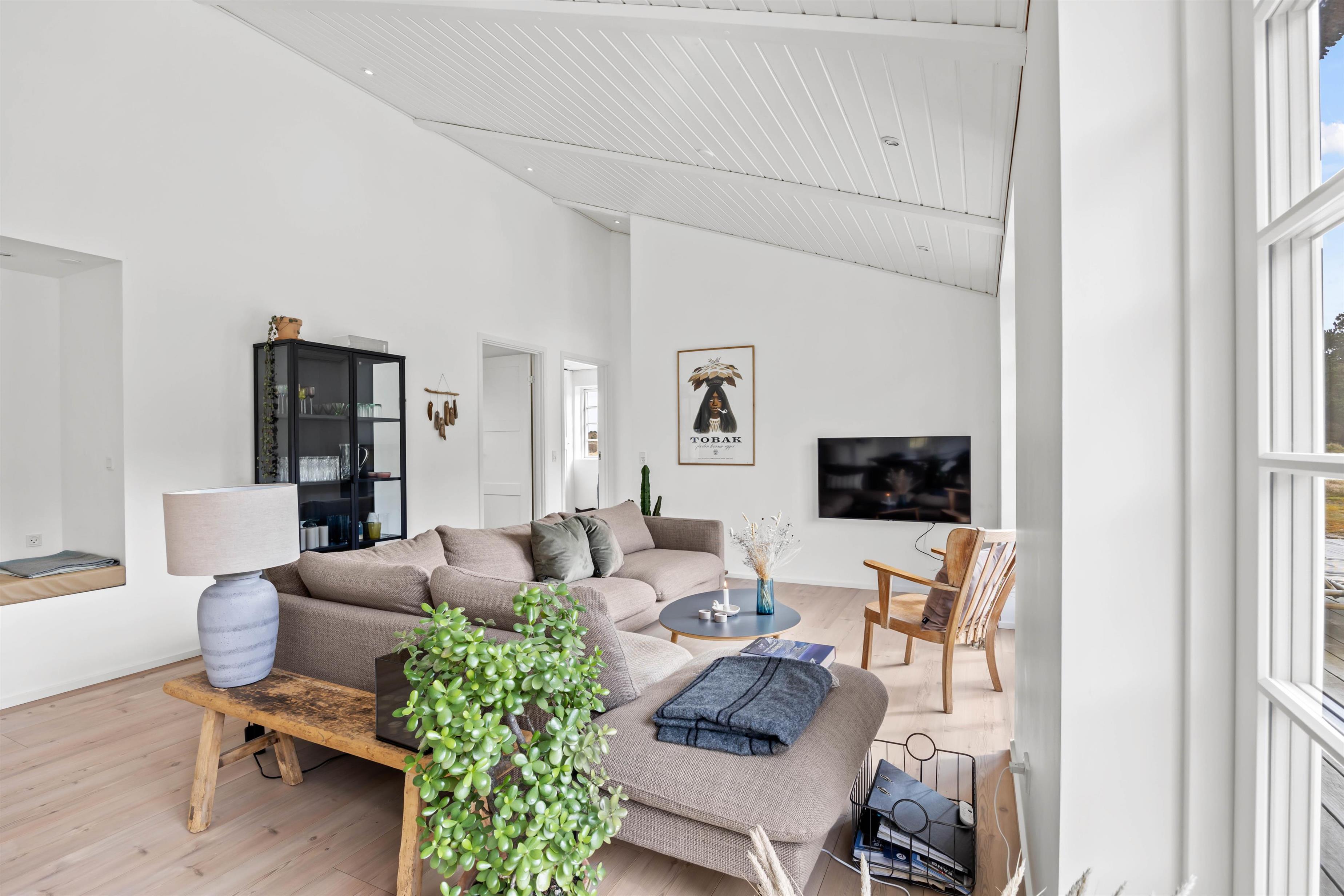 Skovsletten 17 kan danne rammerne omkring en fantastisk ferie ved Vesterhavet. Her kan bo op mod 6 gæster og man kan virkelig fornemme, hvordan her er kræset for detaljerne. Her kombineres de rustikke murstensgulve med de lysebrune nuancer, der sammen skaber en balanceret og smagfuld indretning. I det store køkkenalrum i forbindelse med stuen, har brændeovnen en central placering, så I får mest mulig glæde af den. Nyd det skønne lysindfald og læs en bog fra den fine lille alkove eller i sofaen.