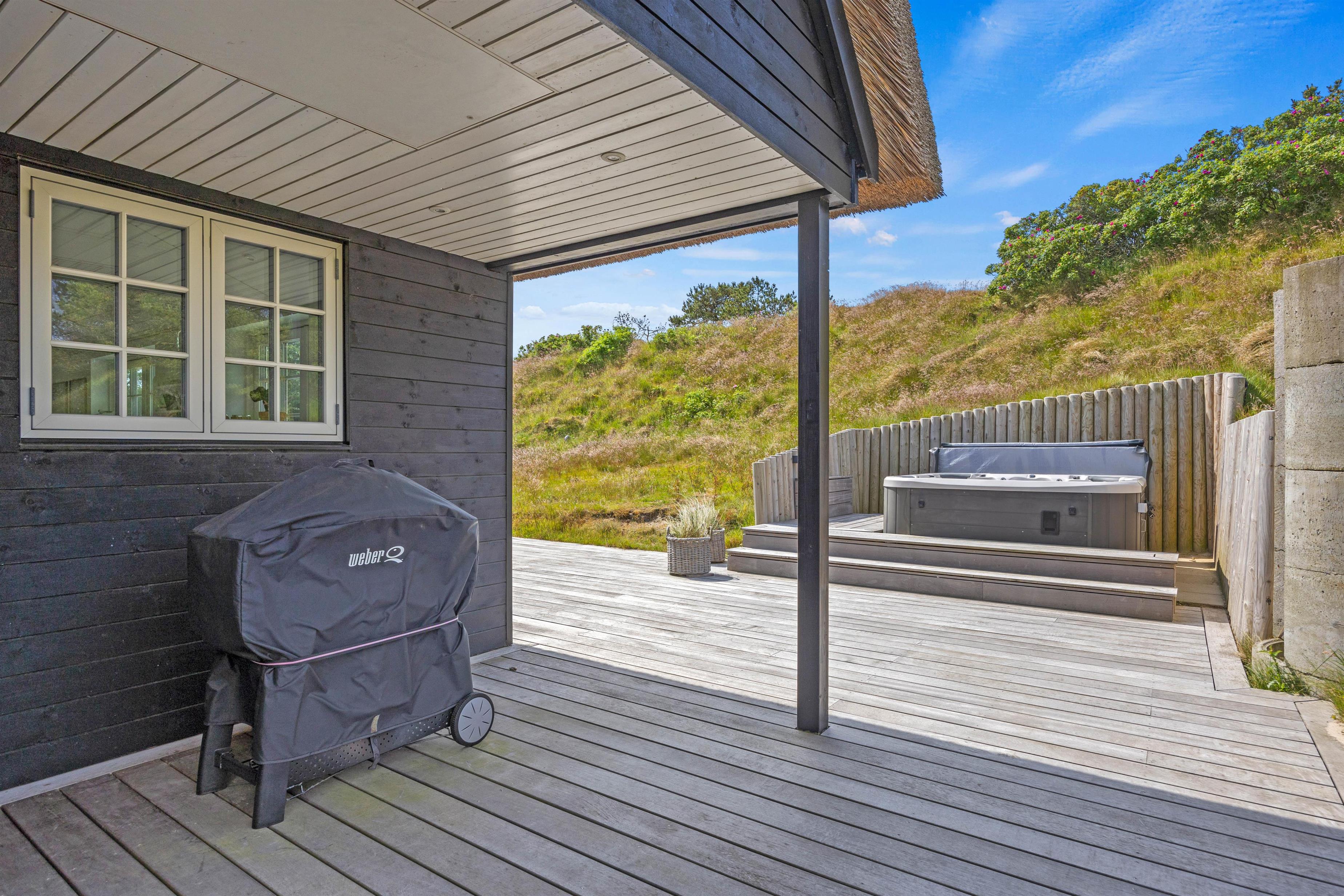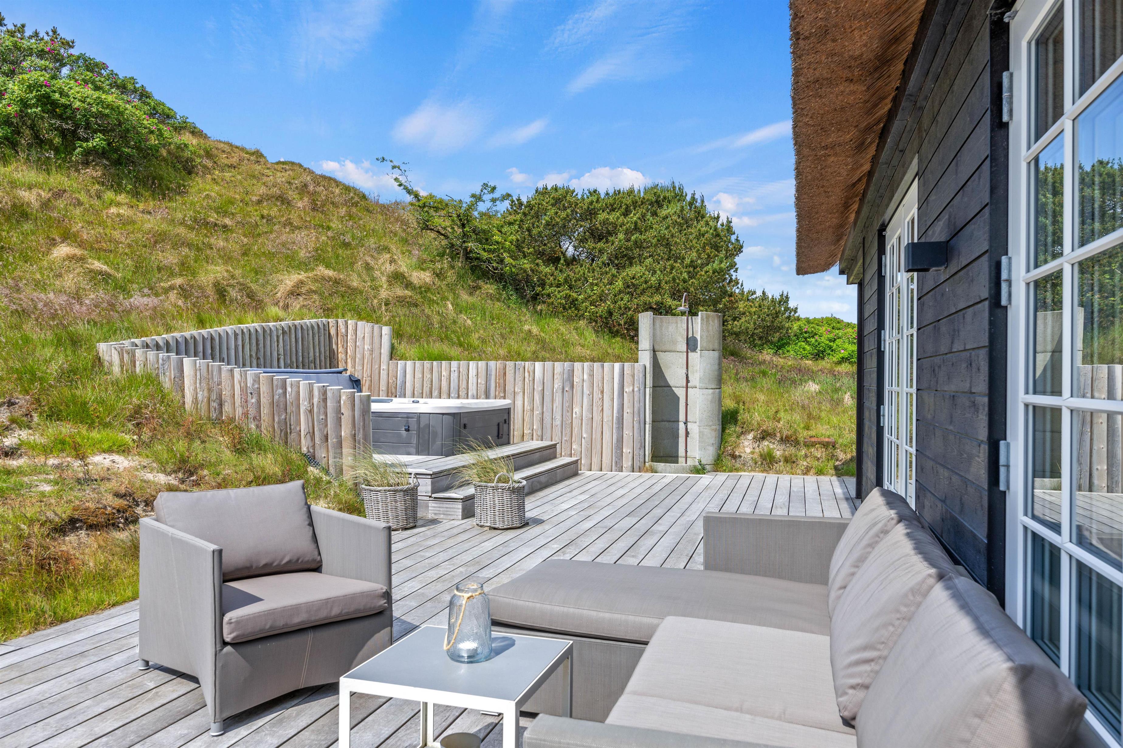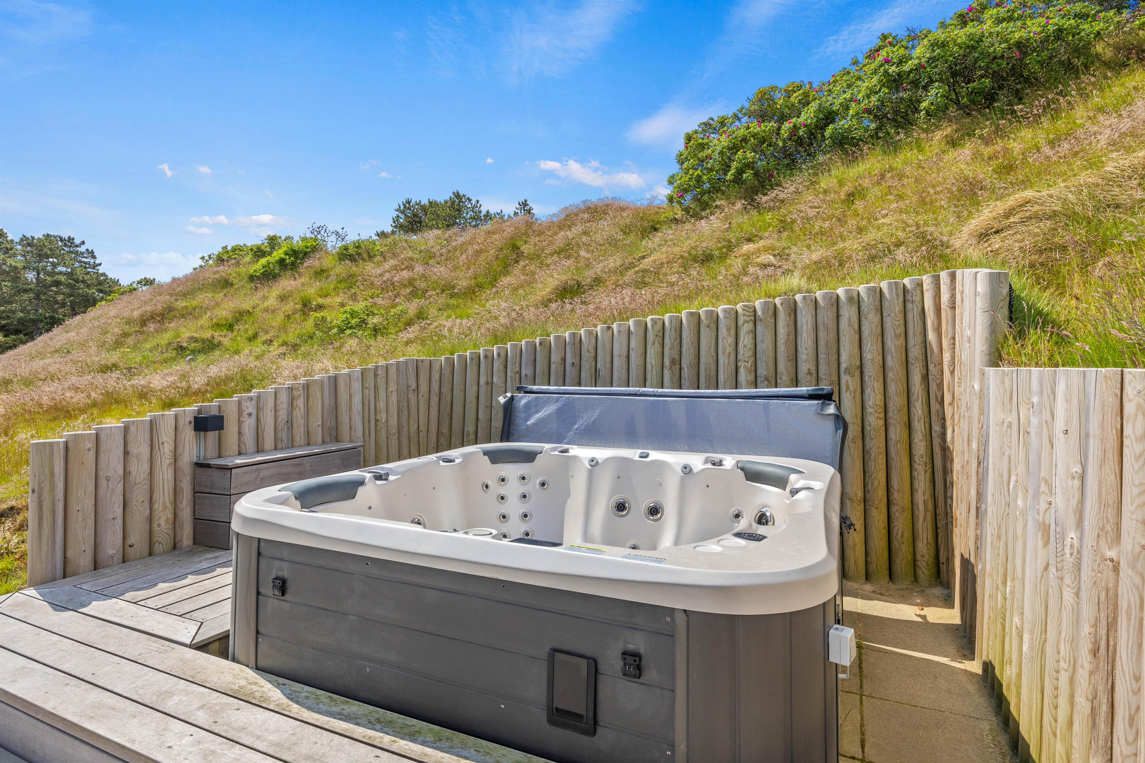 Efter en hyggelig grillaften kan I sætte jer godt til i udespaen, der har plads til 6 personer. Mærk det varme boblende vand og nyd roen, der er over at kigge på de viftende marehalm. Ved siden af udespaen er en udebruser, så I let kan blive skyllet eller vaske sandet af fødderne efter en tur på stranden. Denne kan benyttes fra april til november.