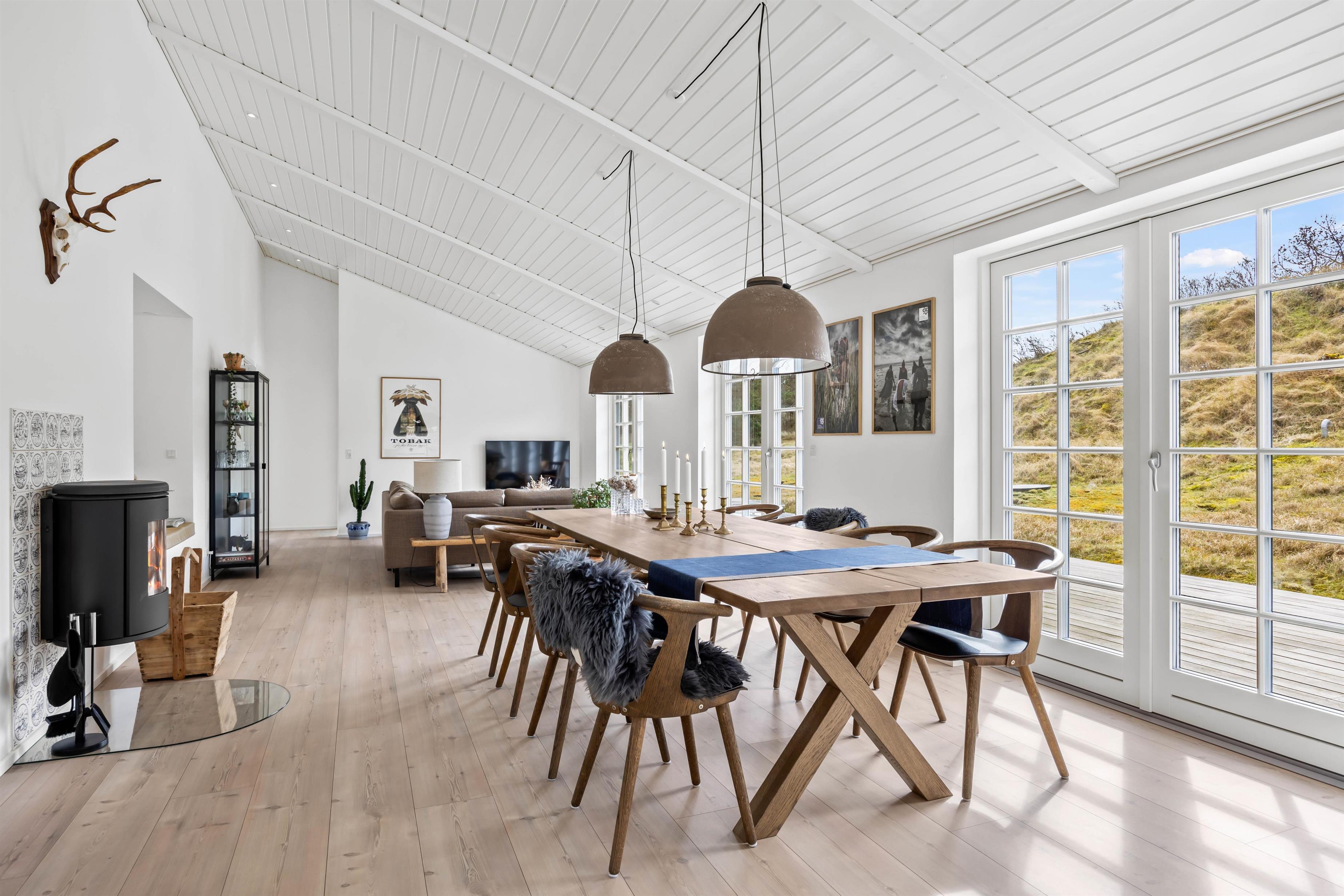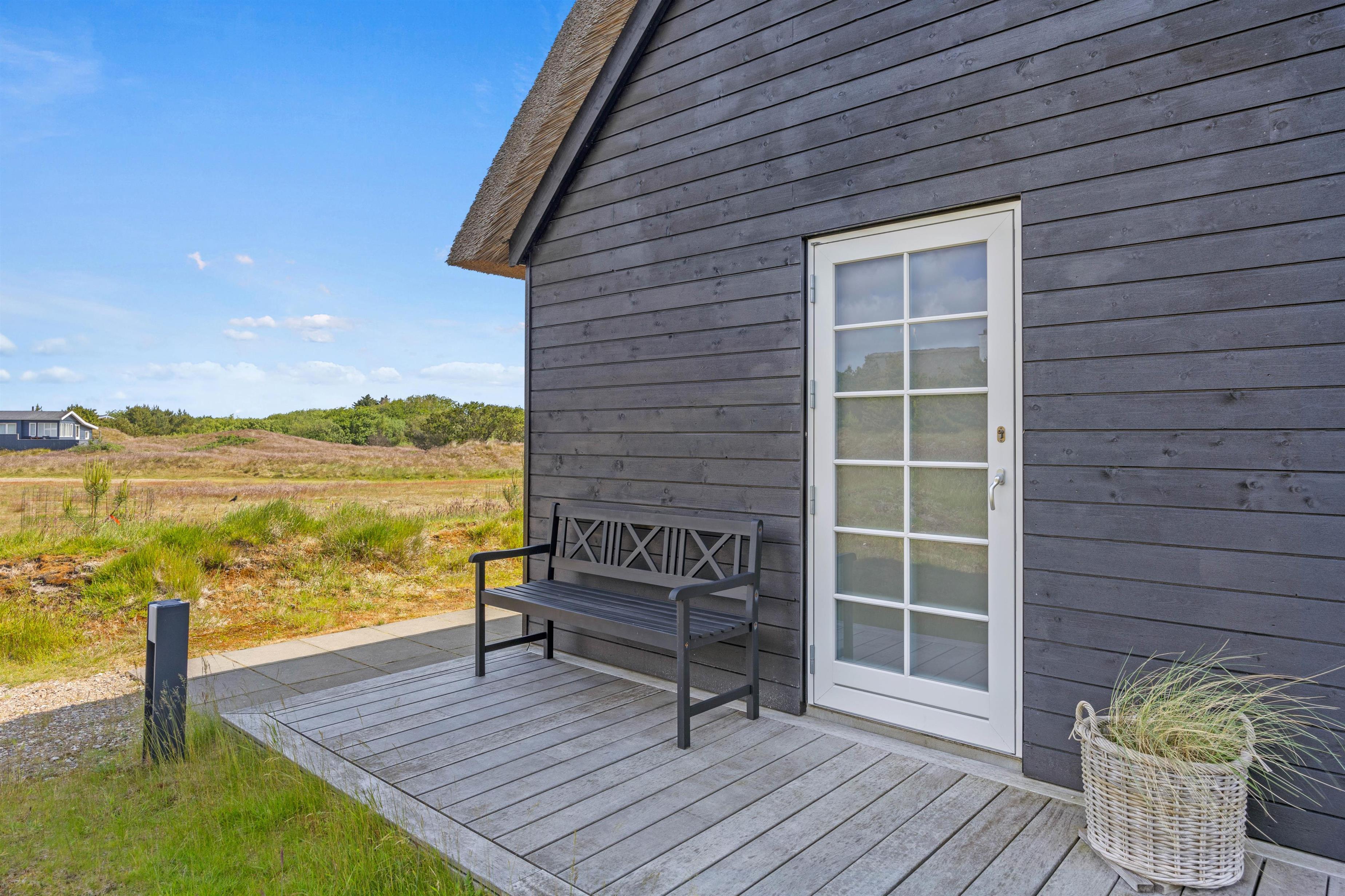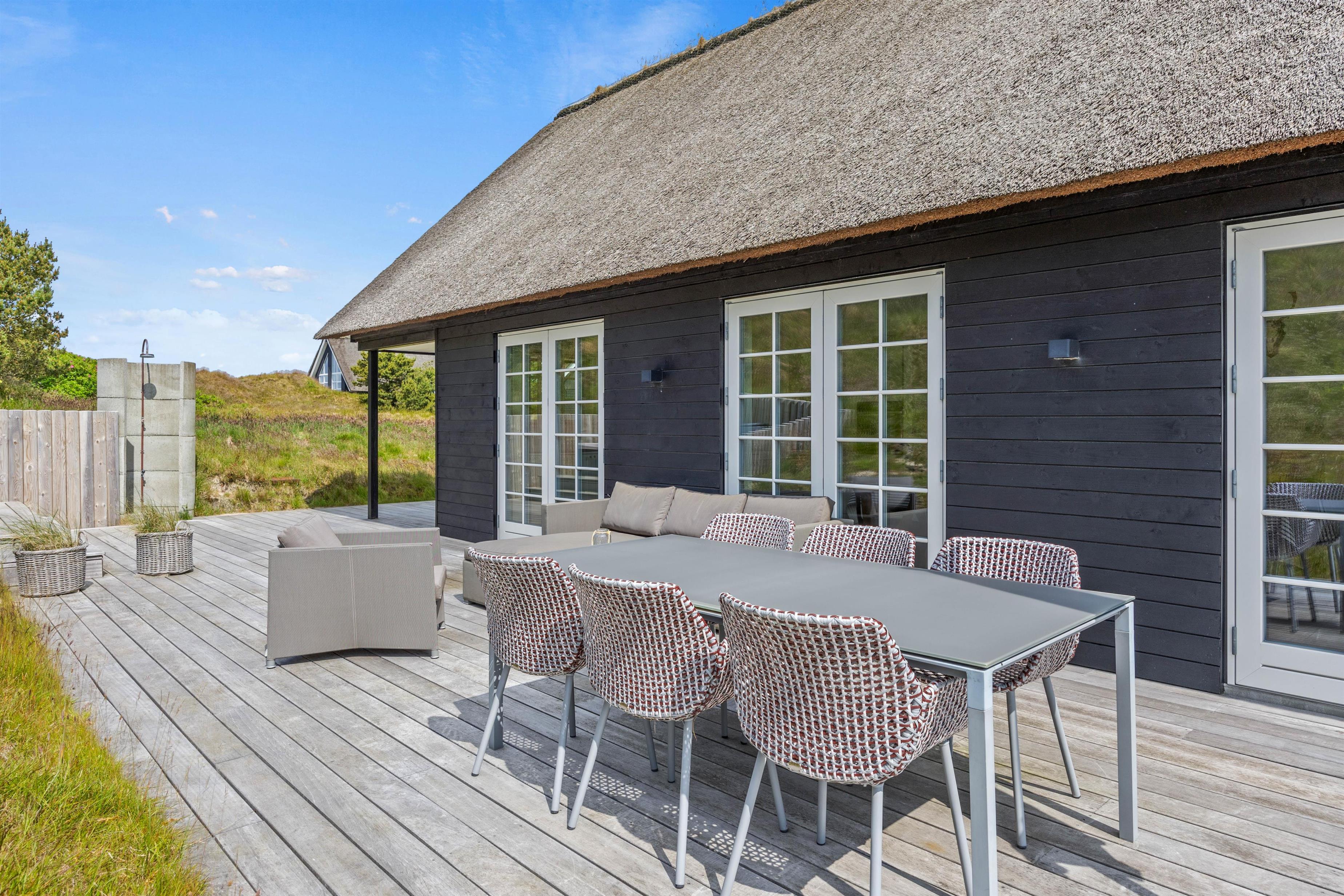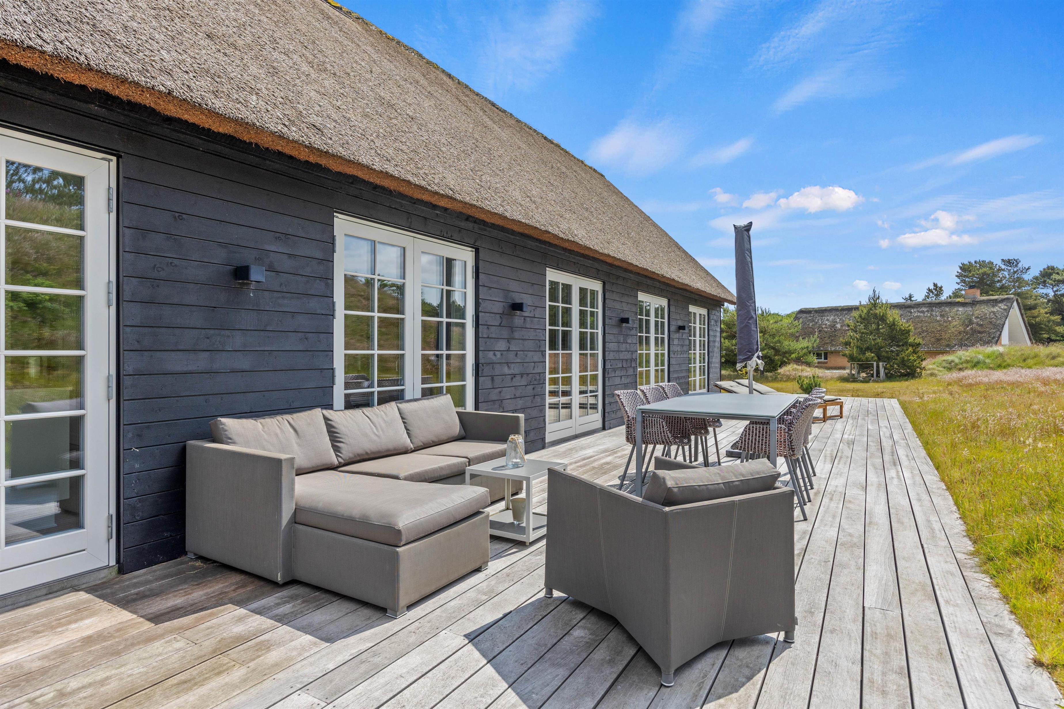Fra feriehusets stue er der flere udgange til den store træterrasse, der indbyder til mange skønne timer i solen. Her venter havemøbler og liggestolene blot på jer. Nyd det gode vejr eller en frokost i skønne under terrassens overdækket del.