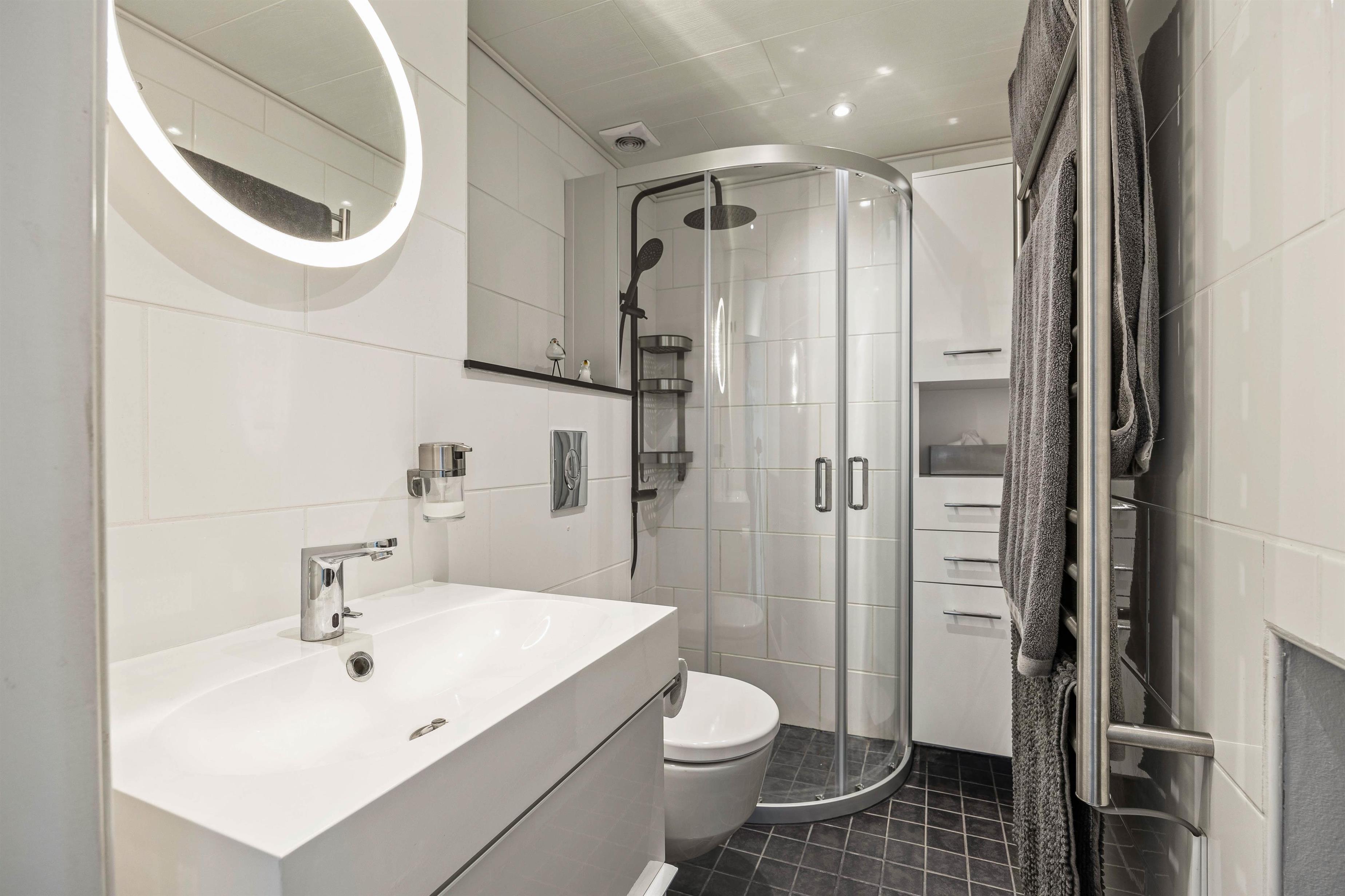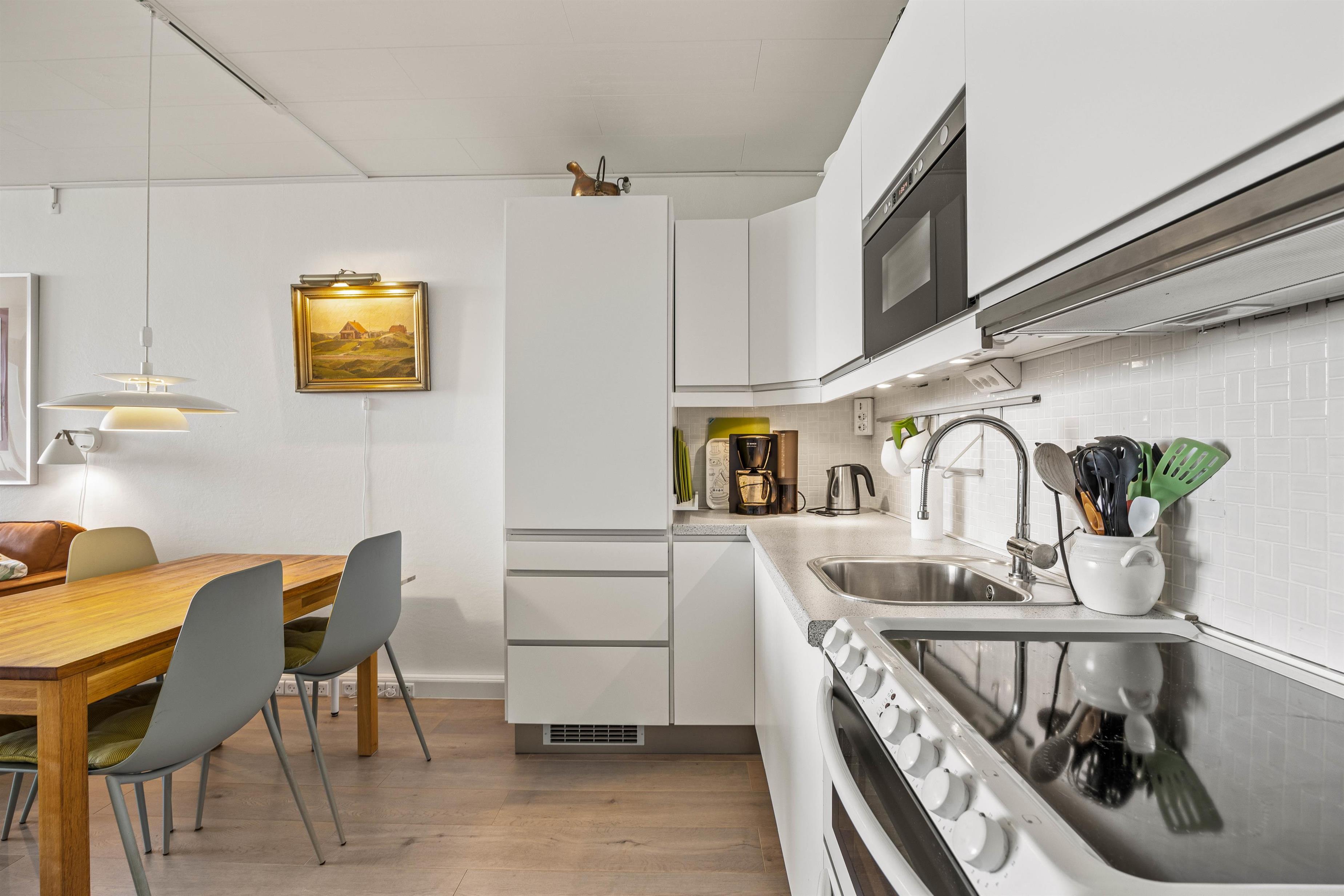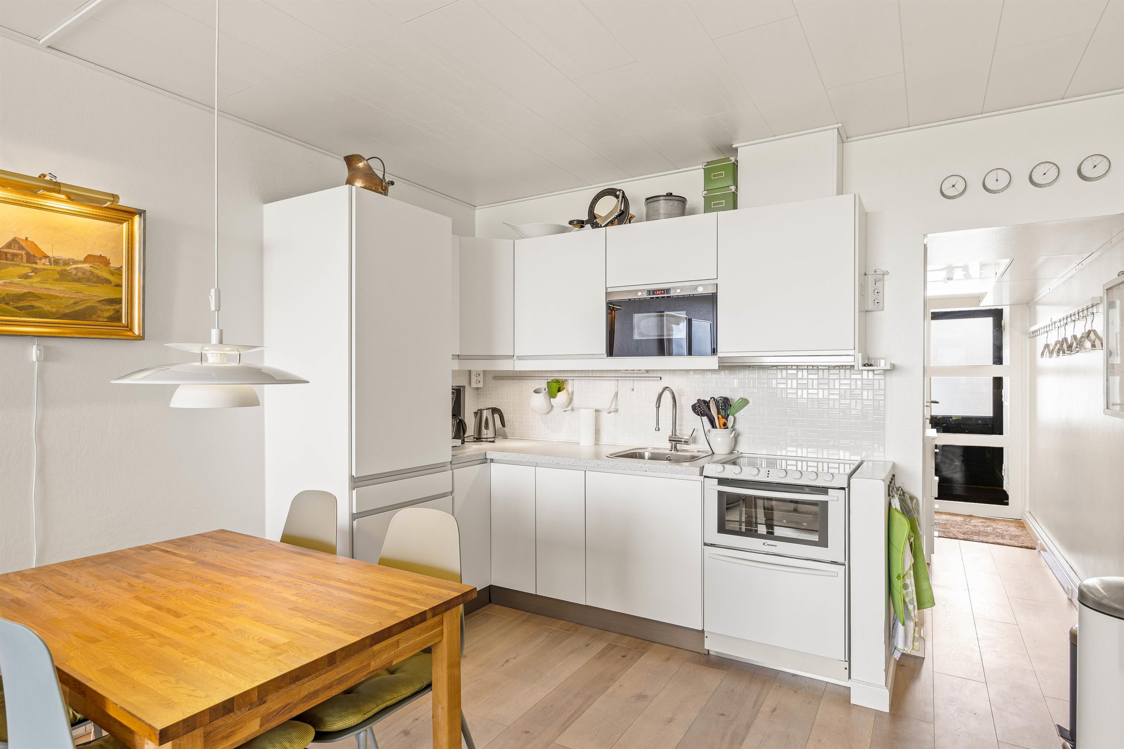 Alrummet byder på et velindrettet køkken med opvaskemaskine i åben forbindelse til spiseplads og stue. Fra stuen er der udgang til en fin vestvendt overdækket terrasse, hvor I kan sætte jer til rette og nyde en kop kaffe eller et glas vin imens solen langsomt går ned i horisonten - herfra har I nemlig havudsigt.