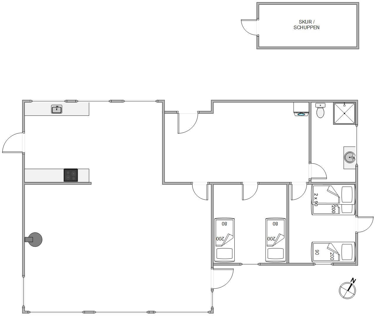 Den energibesparende varmepumpe sikrer et behageligt indeklima året rundt. I det komfortable badeværelse er der gulvvarme, så fødderne altid holdes varme. Det smagfuldt indrettede feriehus har 2 soveværelser, som kan tilpasses efter behov. Ét værelse har 1 enkeltsenge, og 1 køjeseng, og det andet har 2 enkeltsenge.