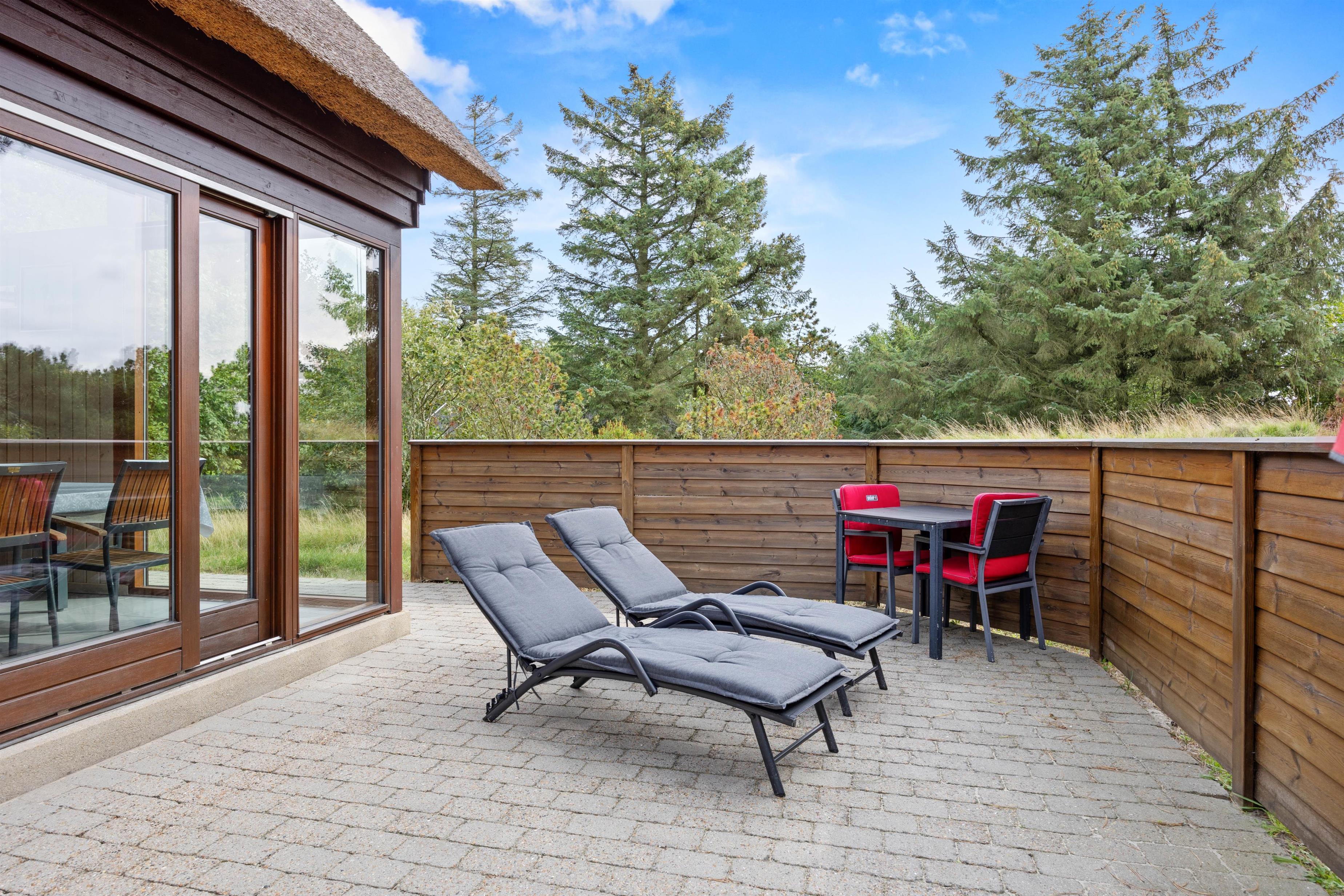 Naturgrunden og terrasserne er et stort aktiv for sommerhuset. Her finder I både læ, sol og små hyggekroge, hvor I kan sidde med en bog, nyde kaffen eller tænde op i grillen. Der er havemøbler, gynge til børnene og god plads til afslapning. I udestuen kan I nyde "udelivet" i læ – selv når vejret ikke helt er med jer.