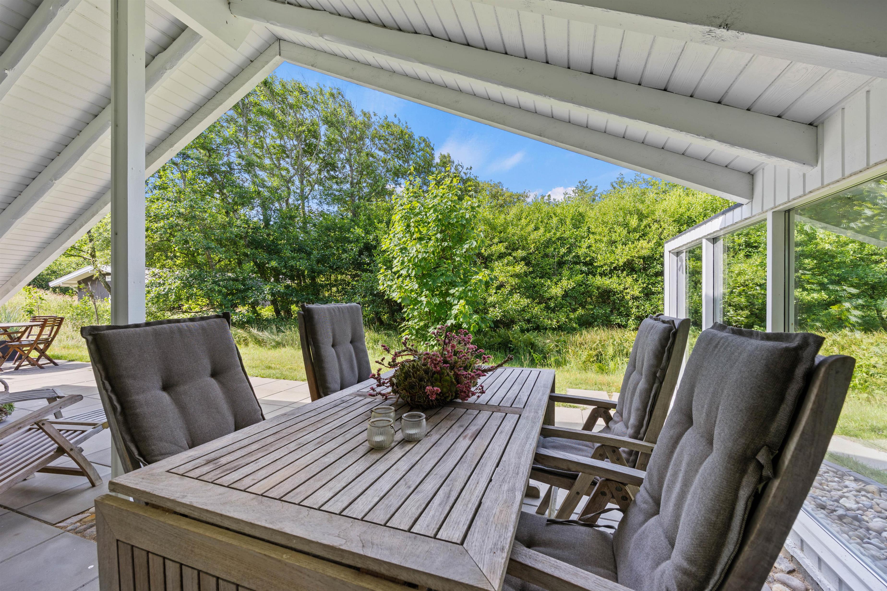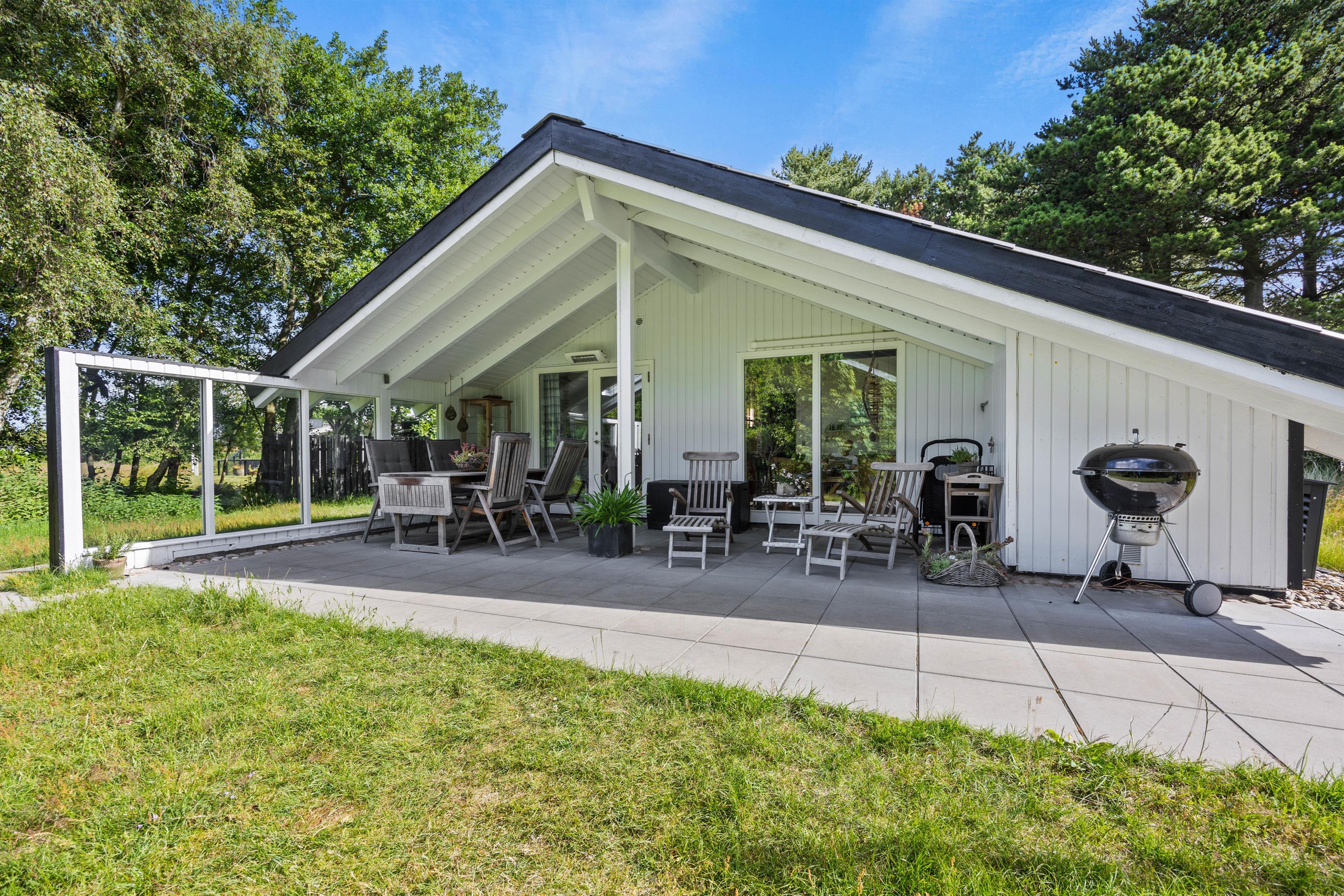 Sommerhuset ligger på en 1900 m2 stor naturgrund omgivet af buske og træer. Her kan I nyde privatlivet på den store terrasse, som er delvist overdækket og afskærmet. Terrassen strækker sig fra østsiden, mod syd og helt om til den vestlige side af sommerhuset, så I hele dagen har mulighed for at nyde varmen fra sommersolen.
