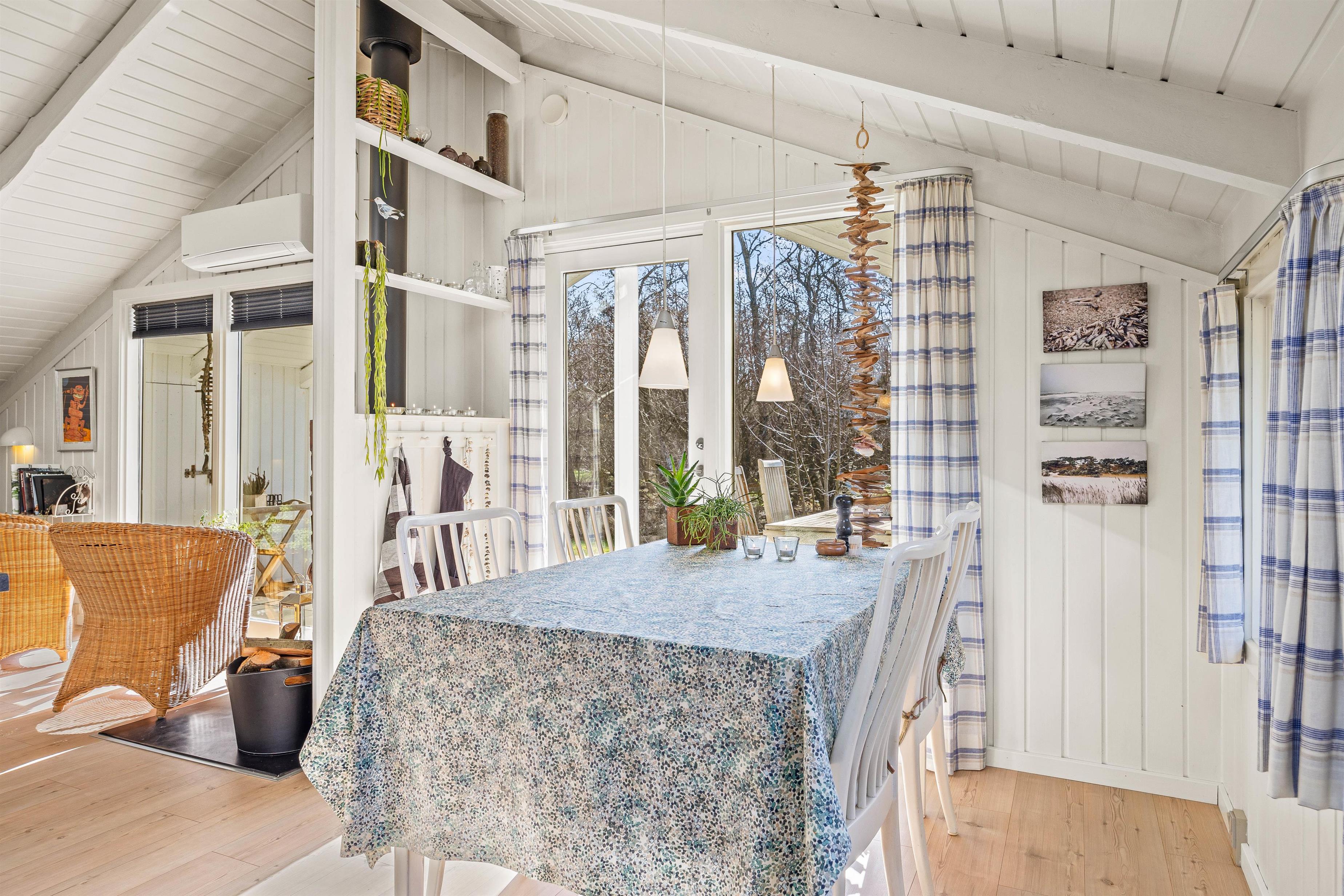 Hjerterummet i sommerhuset er den hyggelige stue med loft til kip og en fin indretning med sans for detaljerne. Her kan I sætte jer godt til rette i sofaen, mens brændeovnen knitrer, og I ser en god film i fjernsynet. Sommerhuset har danske tv-kanaler. Her er også en alkove til afslapning, og som et ekstra plus er der en energibesparende varmepumpe i feriehuset.