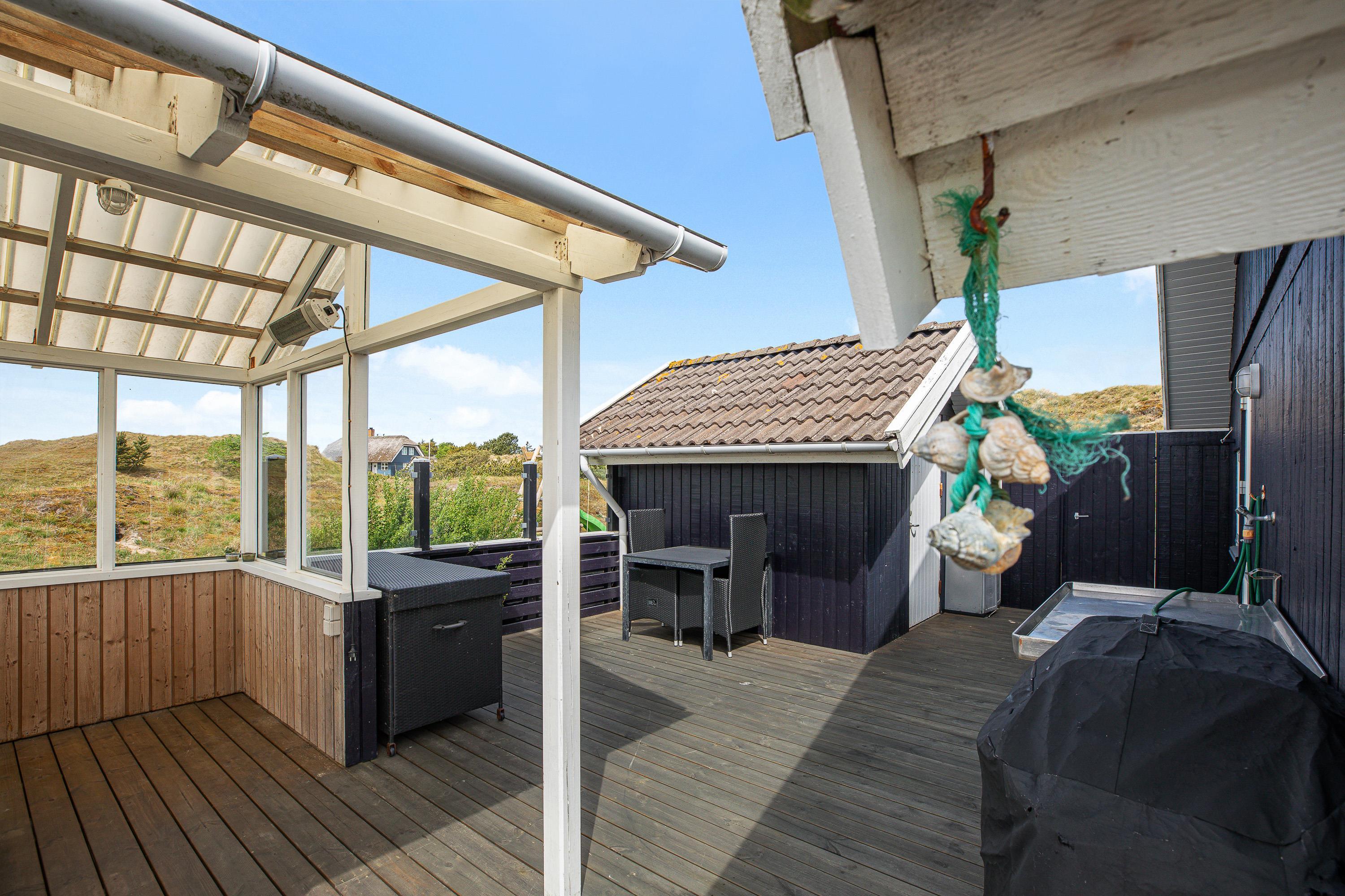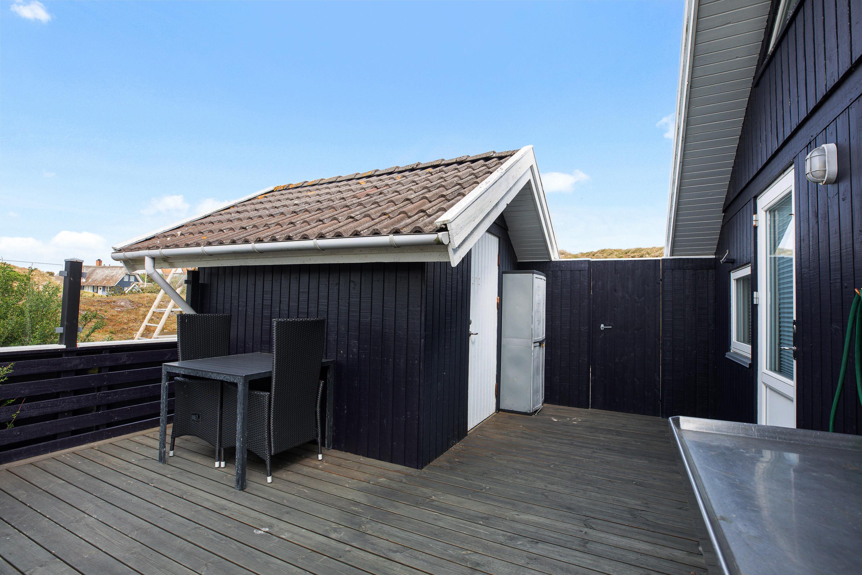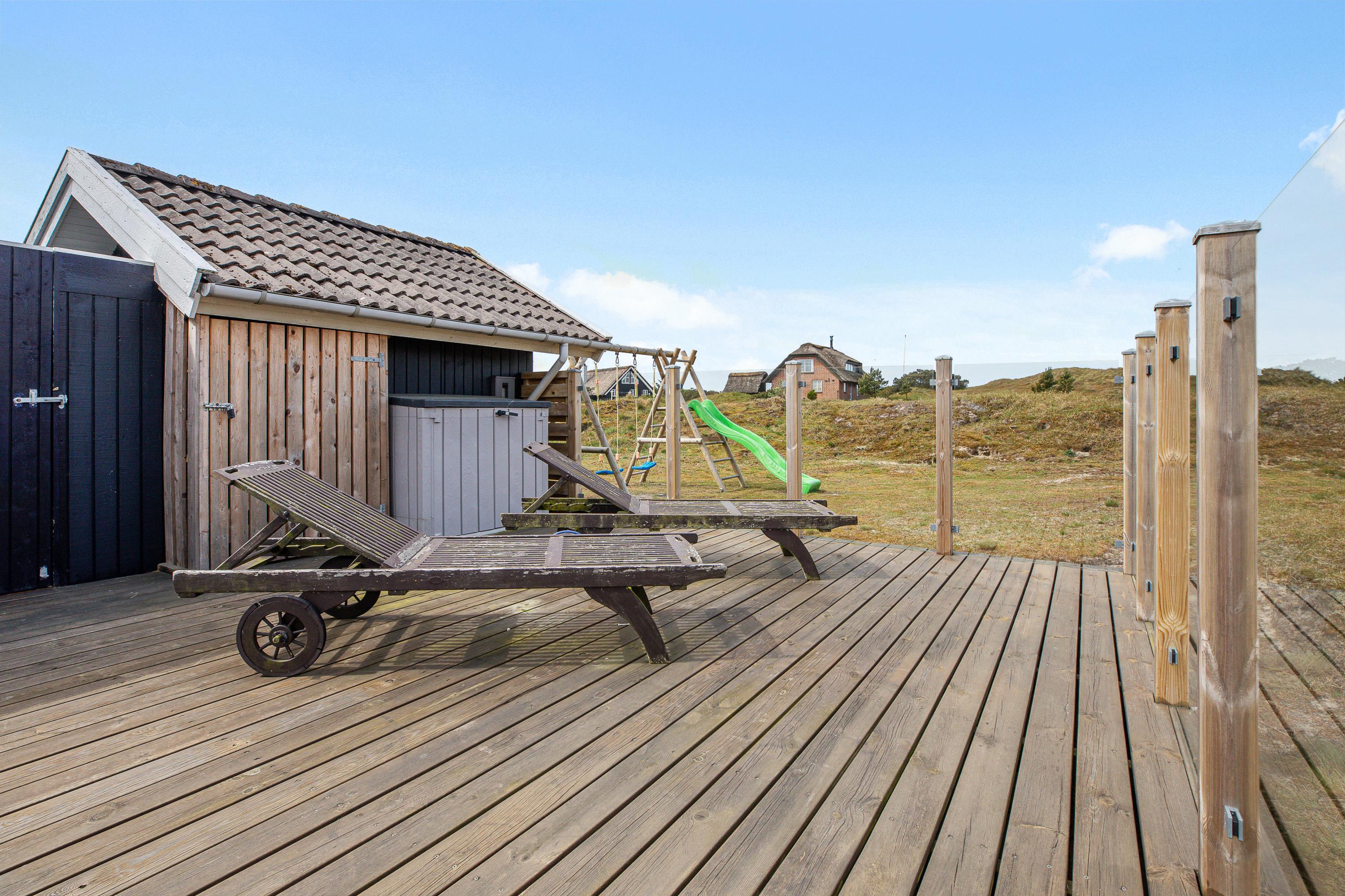 Den primære, aflukkede terrasse strækker sig langs 3 af feriehusets sider, så familiens mindste kan lege frit uden bekymringer. Med udgang fra den lukkede terrasse er der bag feriehuset på nordsiden indrettet en hyggelig terrasseplatform med udgang til sandkasse og legetårn med gynge og rutsjebane.