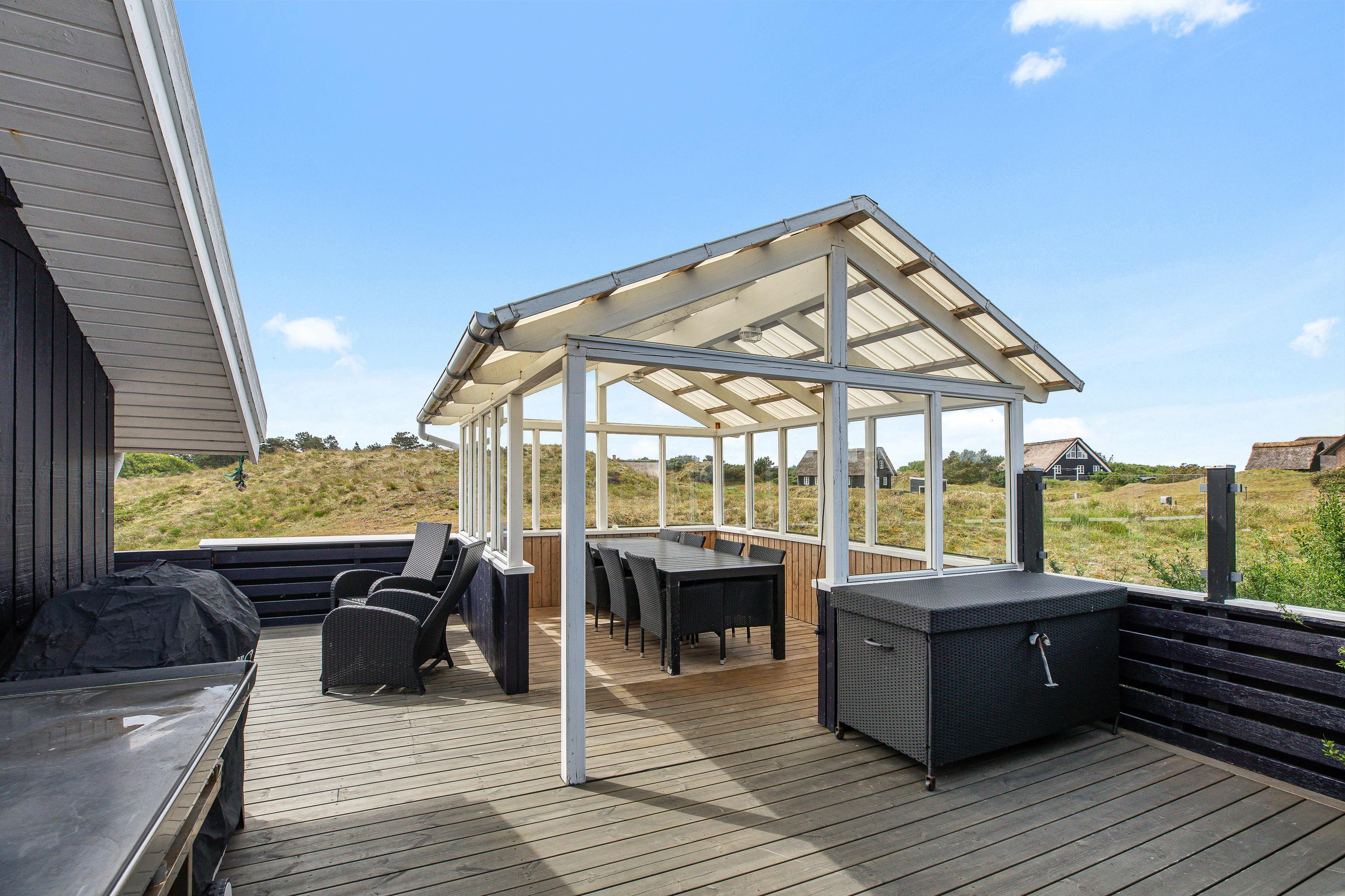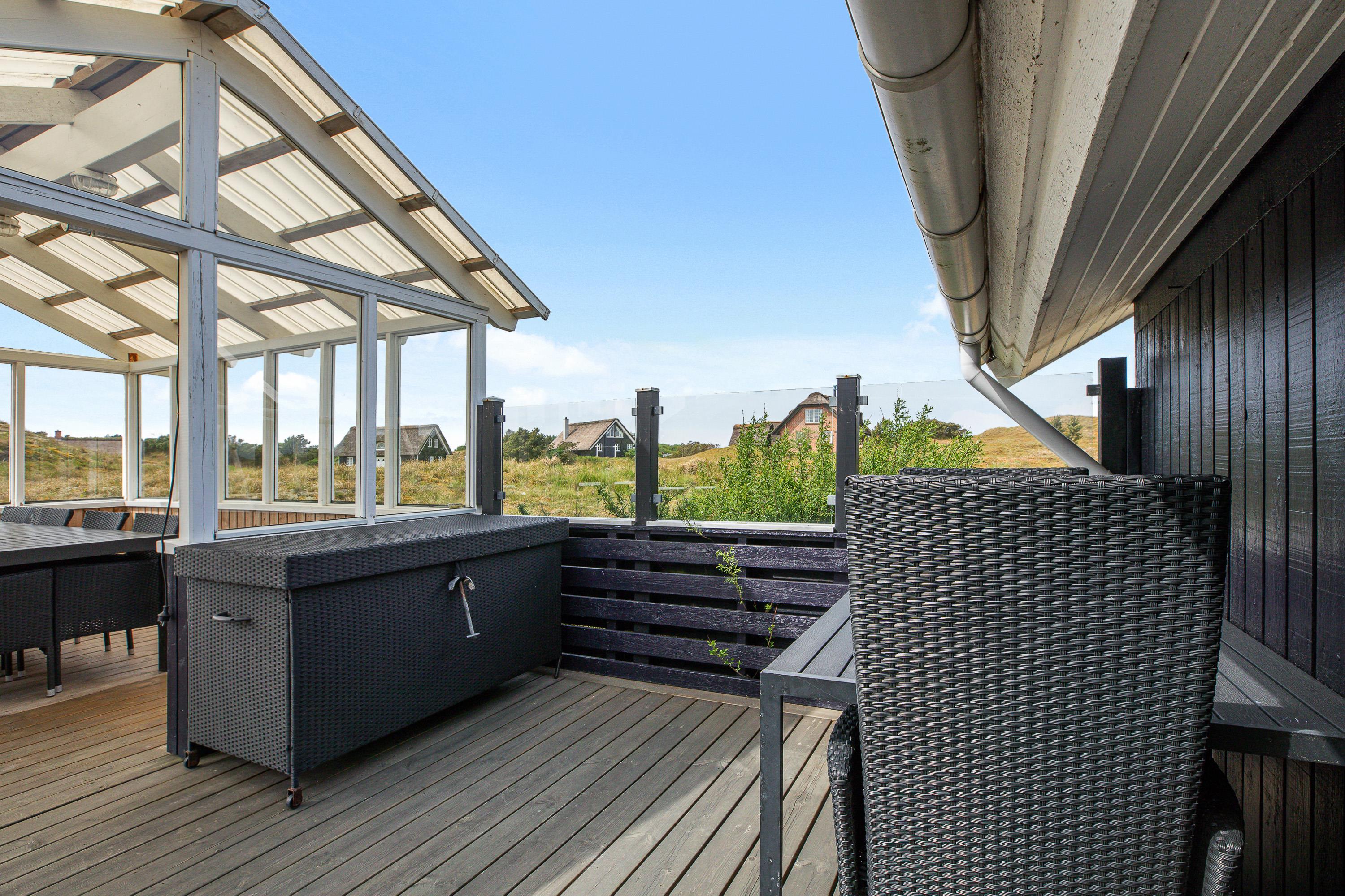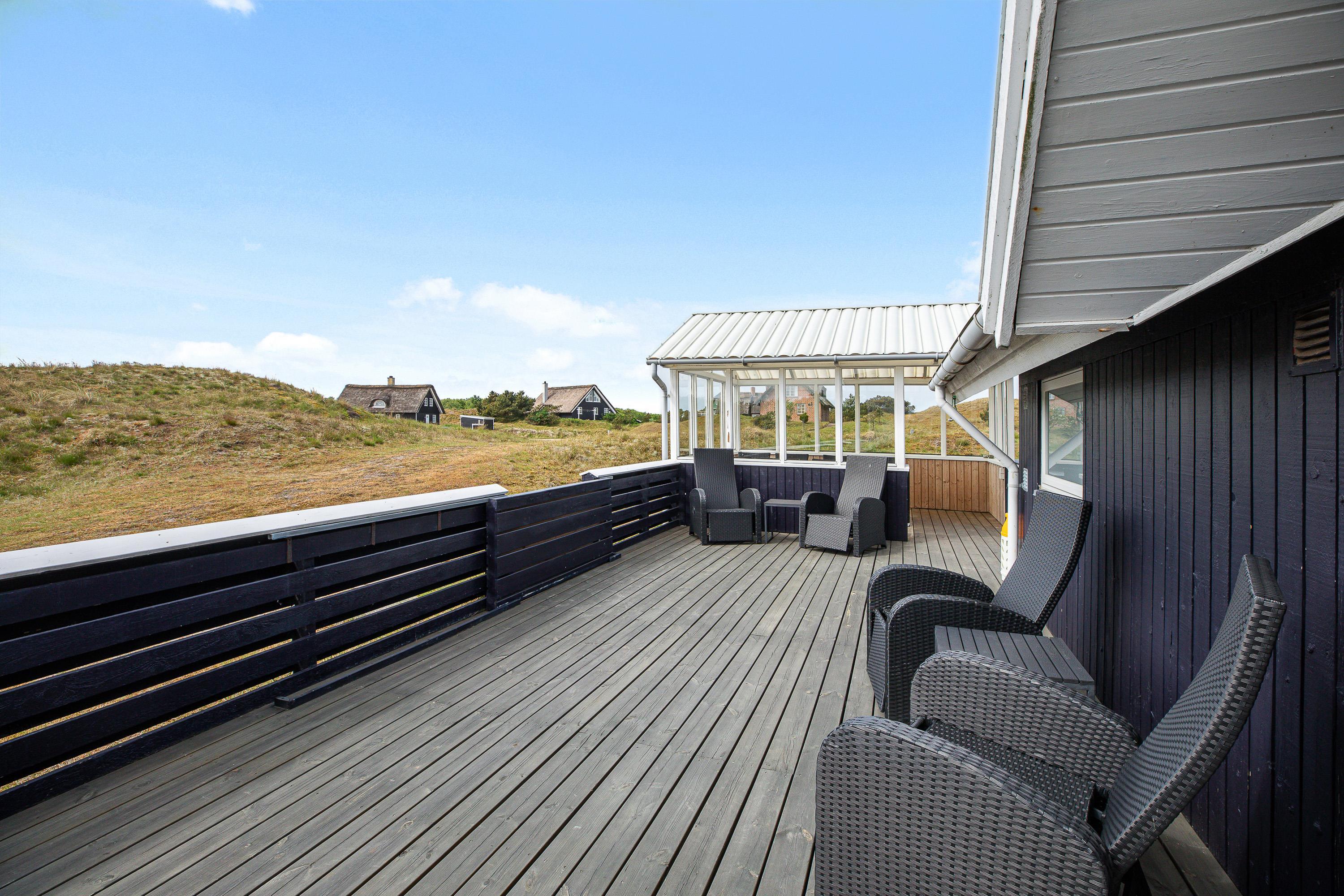 Den primære, aflukkede terrasse strækker sig langs 3 af feriehusets sider, så familiens mindste kan lege frit uden bekymringer. Med udgang fra den lukkede terrasse er der bag feriehuset på nordsiden indrettet en hyggelig terrasseplatform med udgang til sandkasse og legetårn med gynge og rutsjebane.