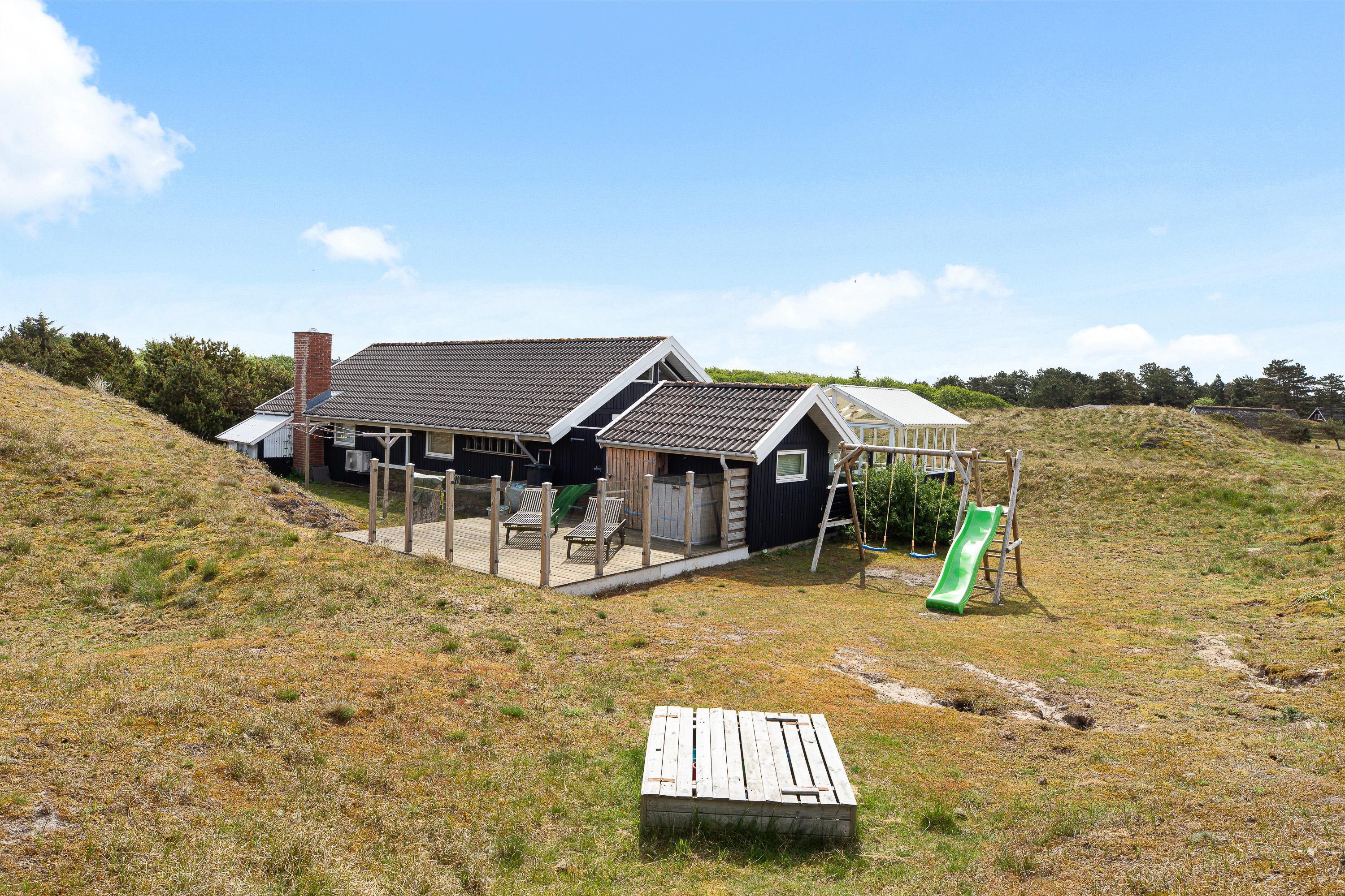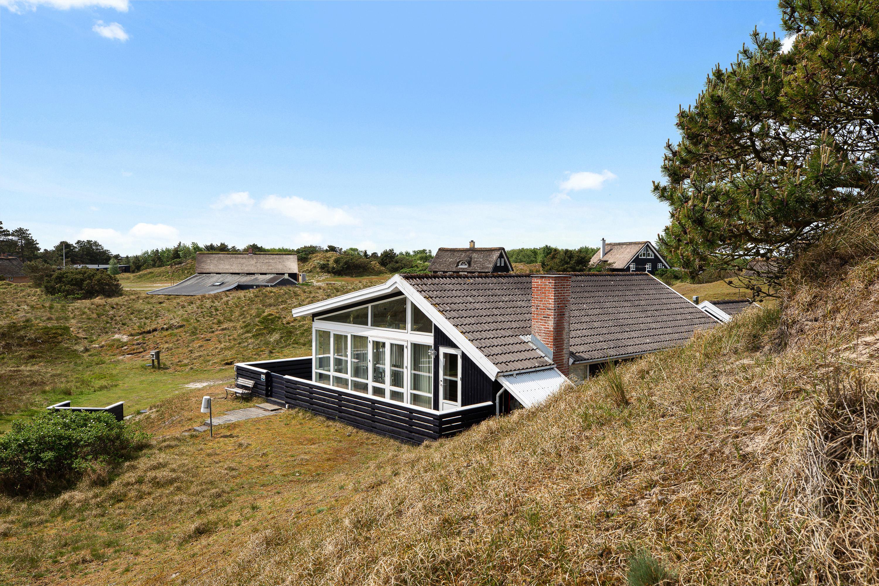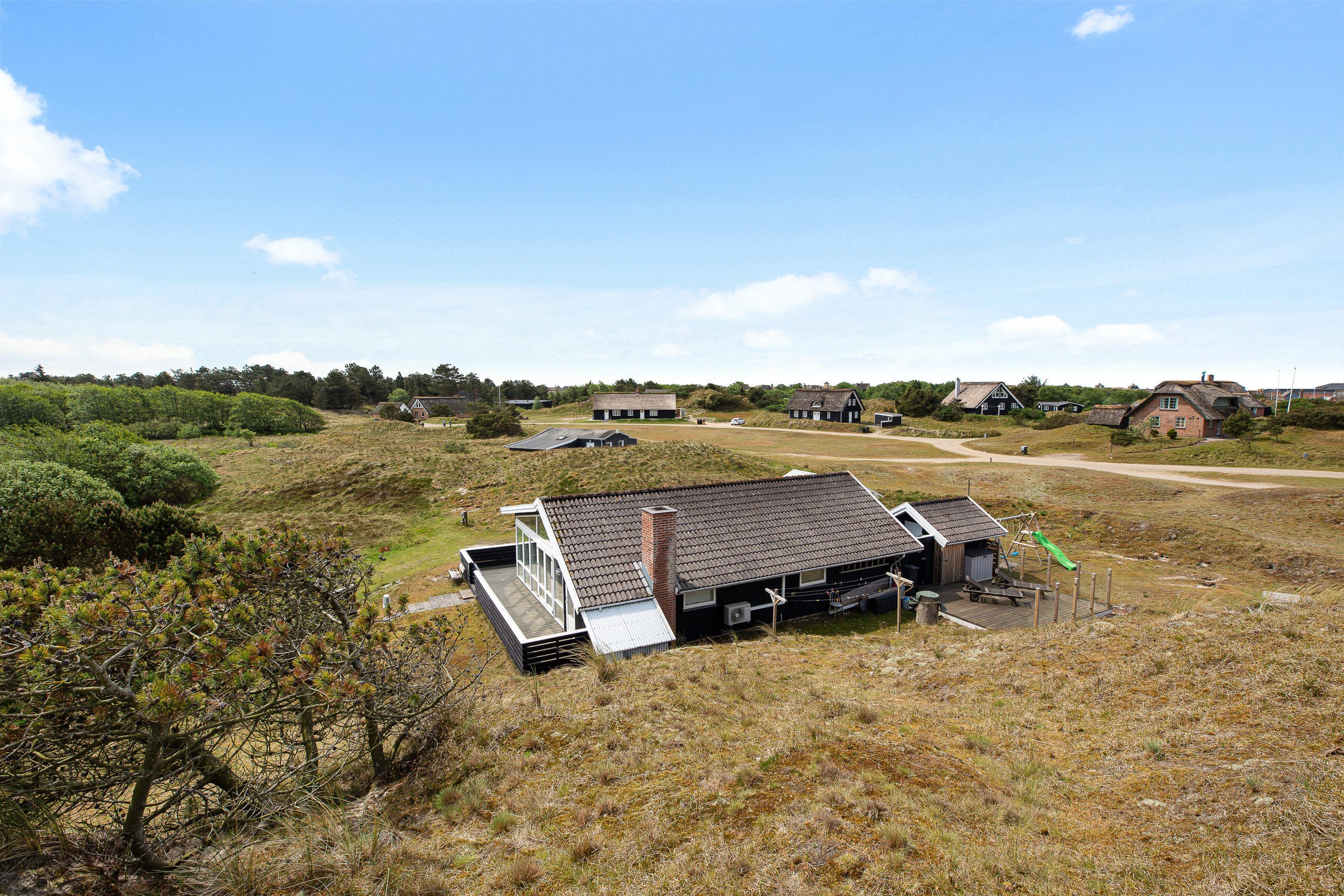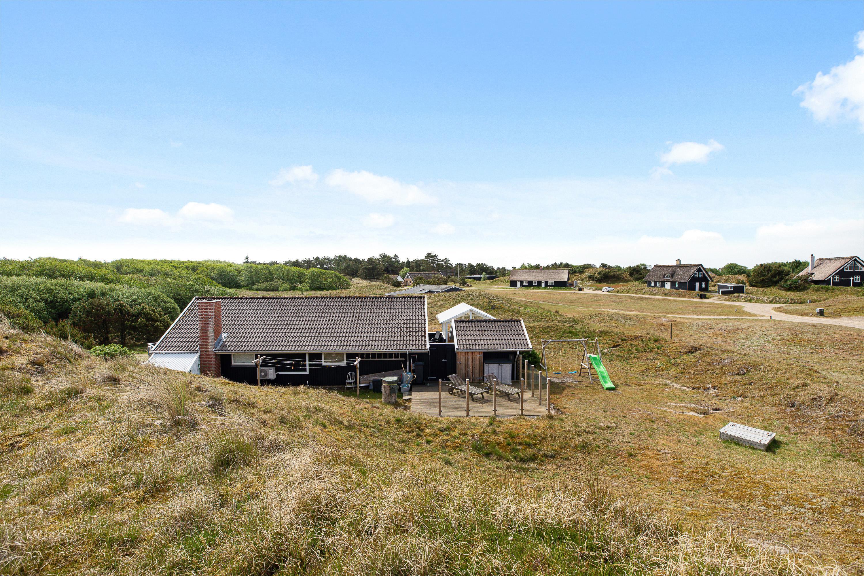Udover et fantastisk feriehus får I her et helt særligt udemiljø. Feriehuset på Nørre Meldbjergdal 11 ligger ugeneret og smukt indlejret i de grønne klitter, hvilket giver jer ekstra privatliv. Rundt om feriehuset er der indrettet flere små terrasseområder, så I altid vil kunne finde en solrig eller skyggefuld plet.