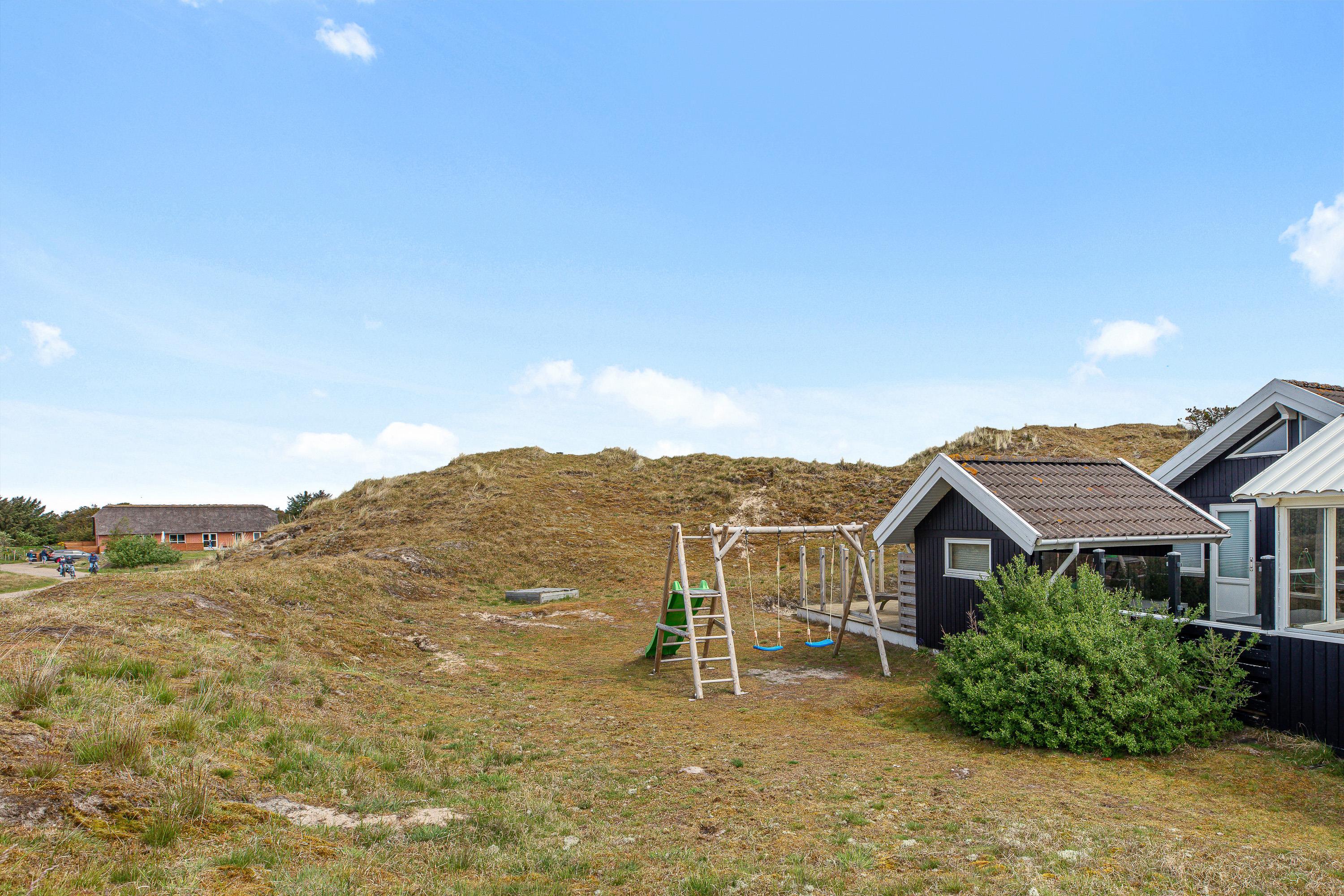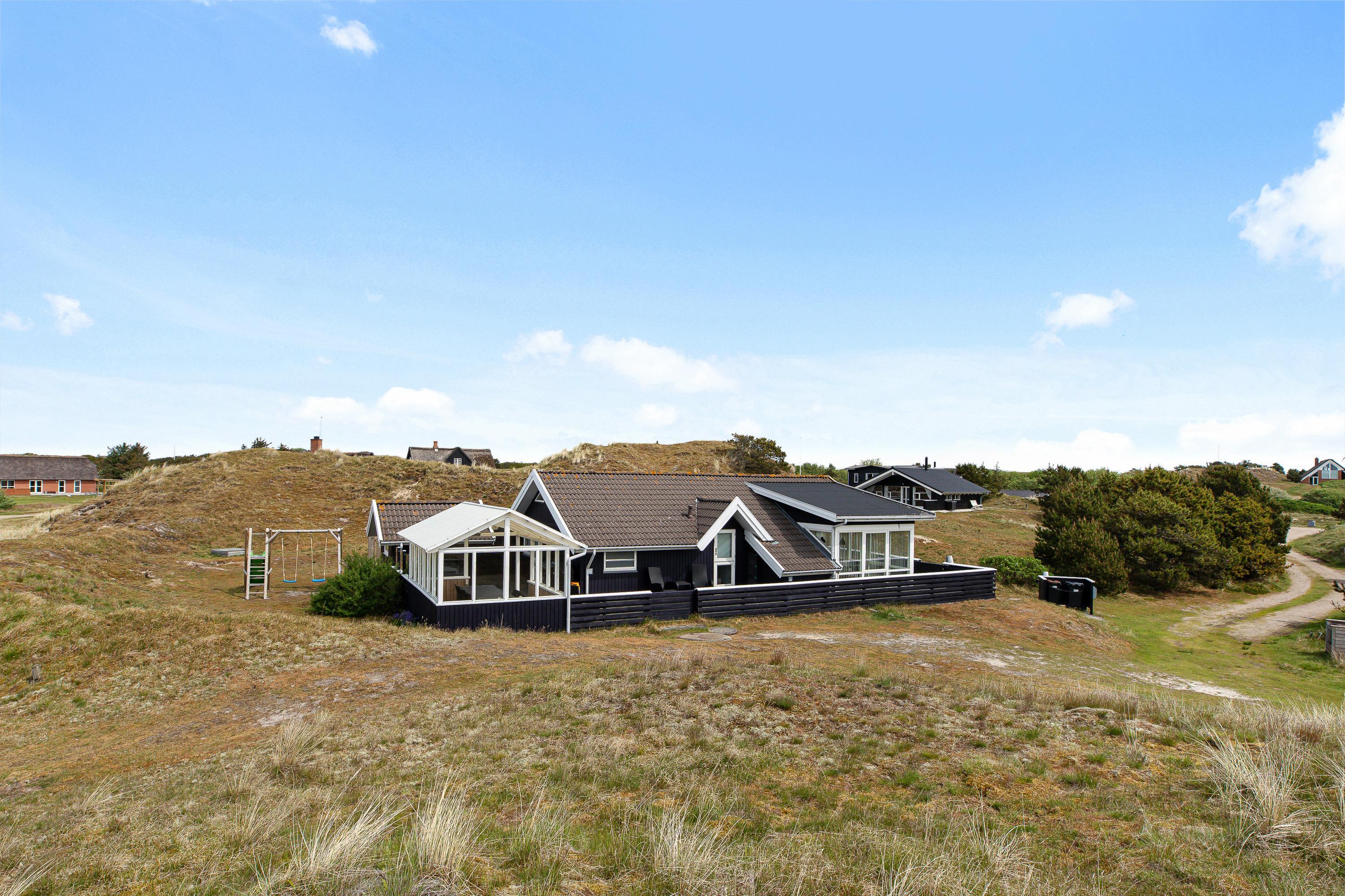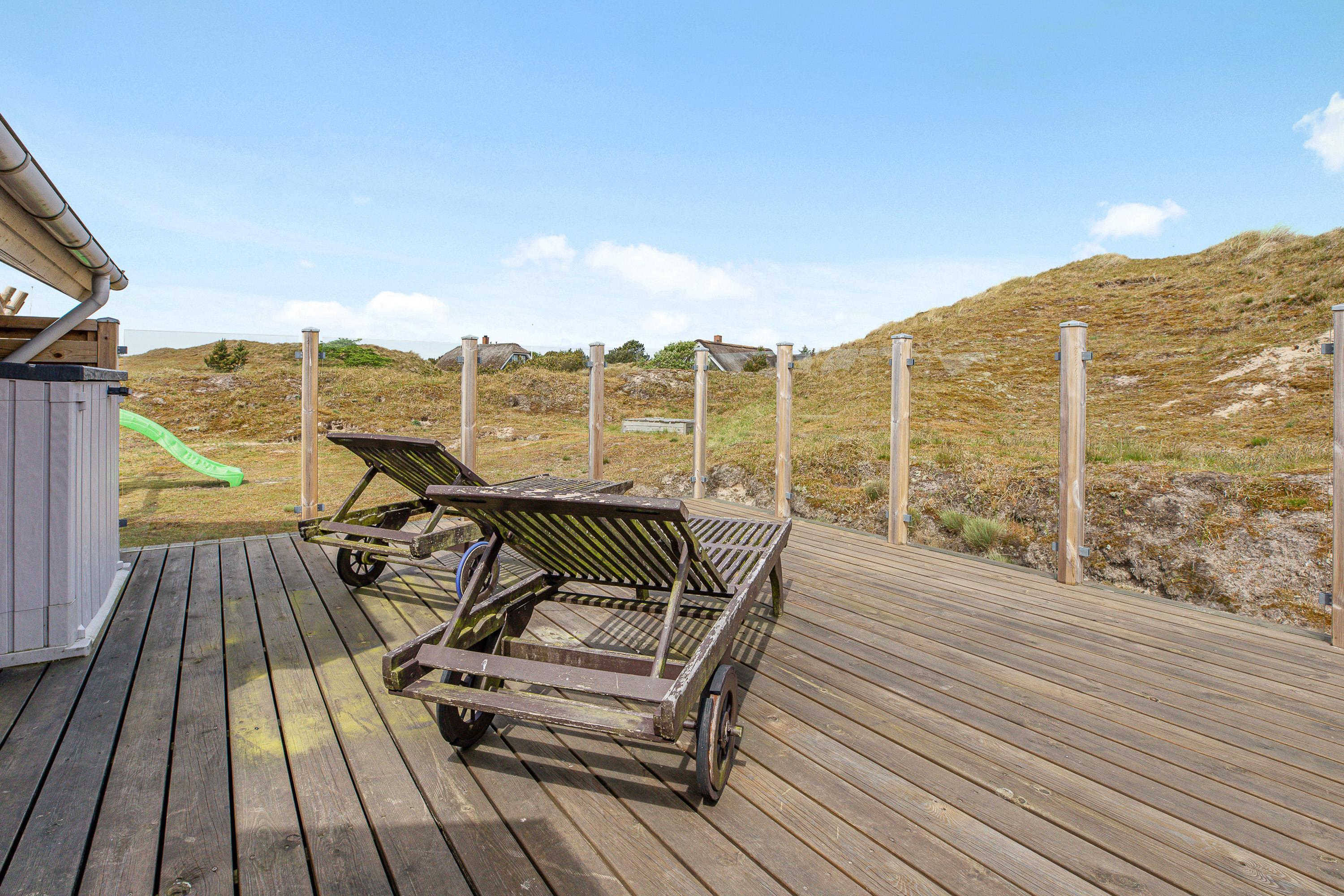 Udover et fantastisk feriehus får I her et helt særligt udemiljø. Feriehuset på Nørre Meldbjergdal 11 ligger ugeneret og smukt indlejret i de grønne klitter, hvilket giver jer ekstra privatliv. Rundt om feriehuset er der indrettet flere små terrasseområder, så I altid vil kunne finde en solrig eller skyggefuld plet.