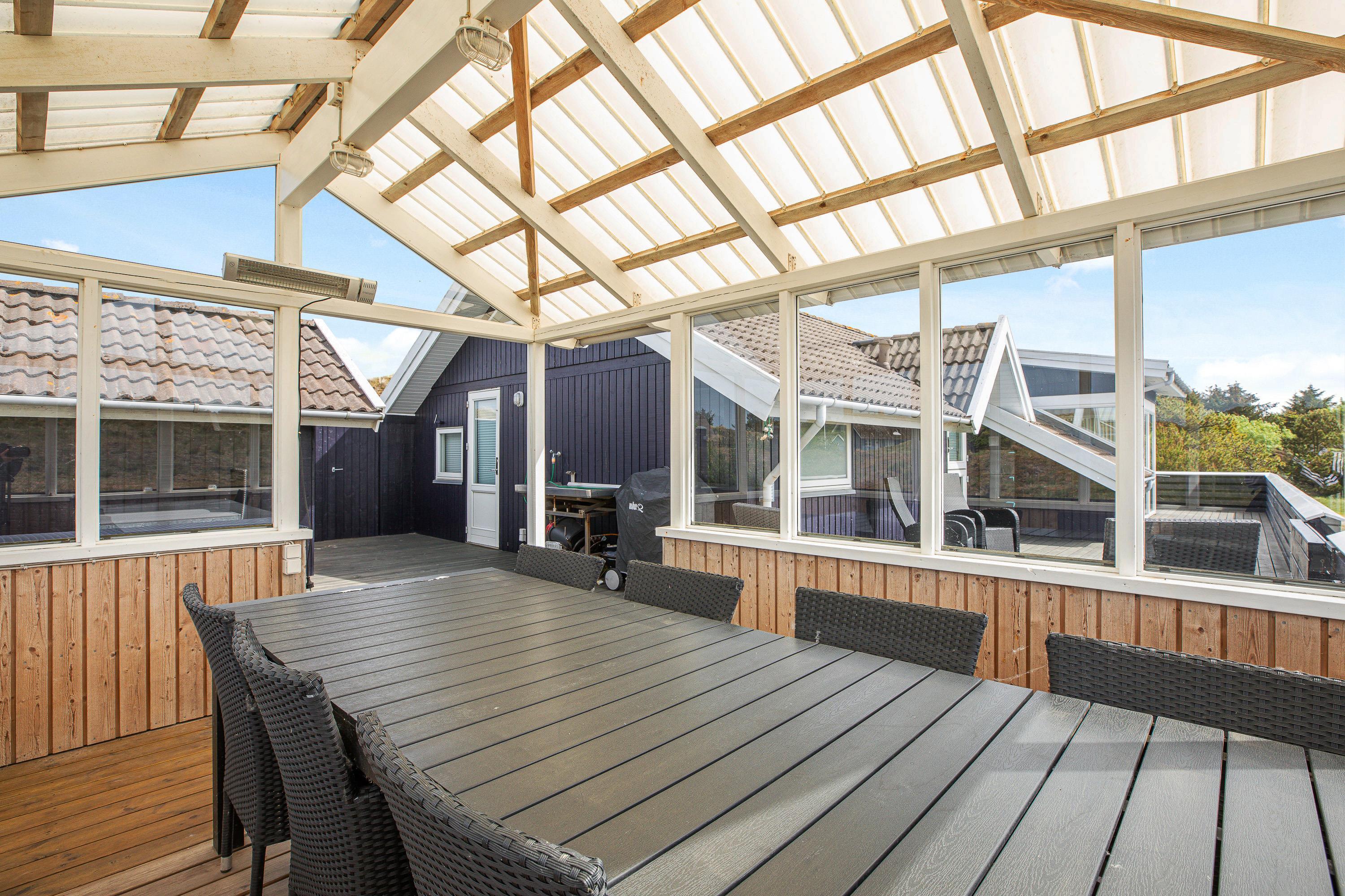 Når duggen falder på, kan I rykke terrassehyggen ind under den overdækkede del af terrassen, hvor der også er en terrassevarmer. Hele terrassen er udstyret med pæne, komfortable havemøbler, solvogne samt en gasgrill, så I kan nyde aftensmaden i det fri.