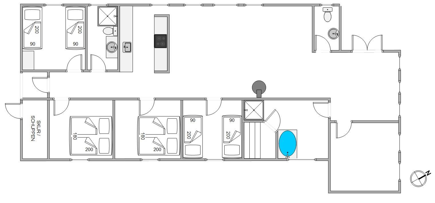 Det nænsomt renoverede sommerhus indeholder 4 soveværelser, hvoraf 2 er med 180x200cm dobbeltsenge, og 2 er med 90x200cm enkeltsenge. Derudover er der et gæstetoilet og 2 badeværelser med brusenicher, hvor det ene også indeholder både badekar og sauna. På alle 3 badeværelser er der gulvvarme, der sørger for varme fødder i vintermånederne. Her har I altså heller ingen trængsel om morgenen.