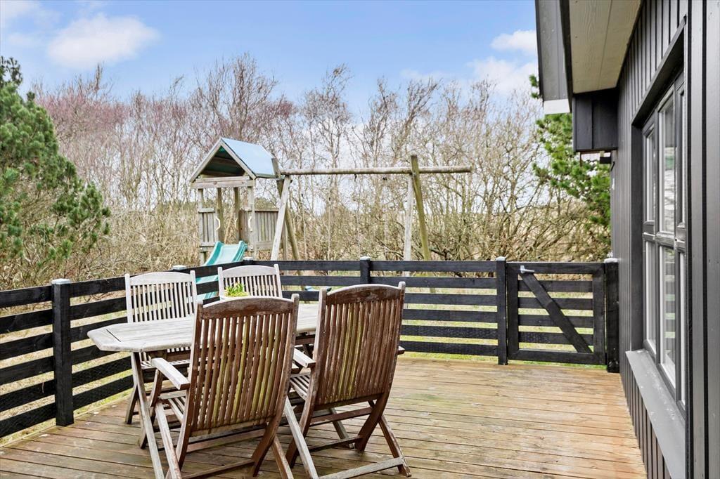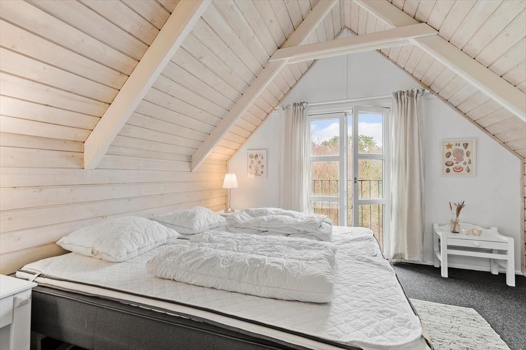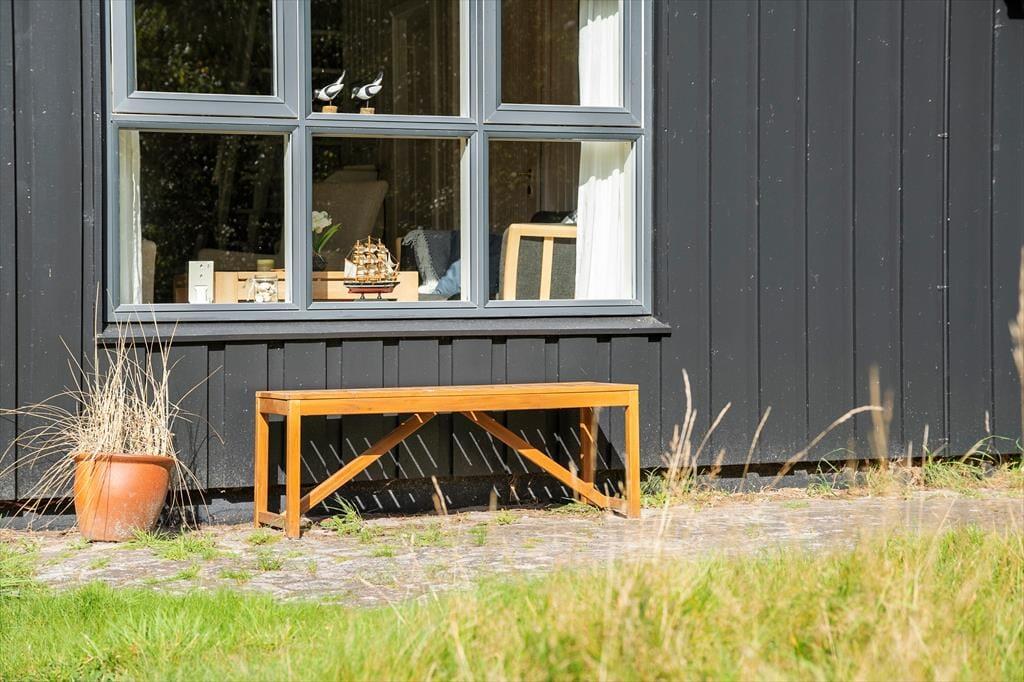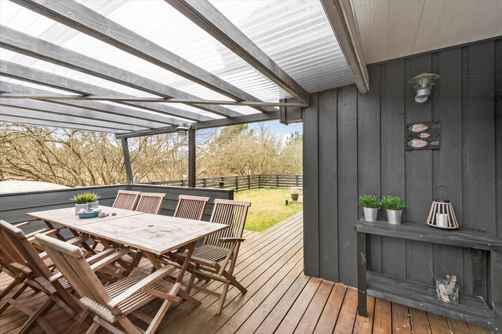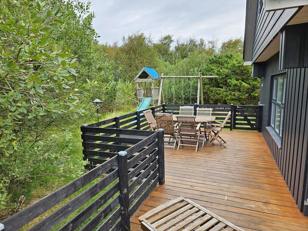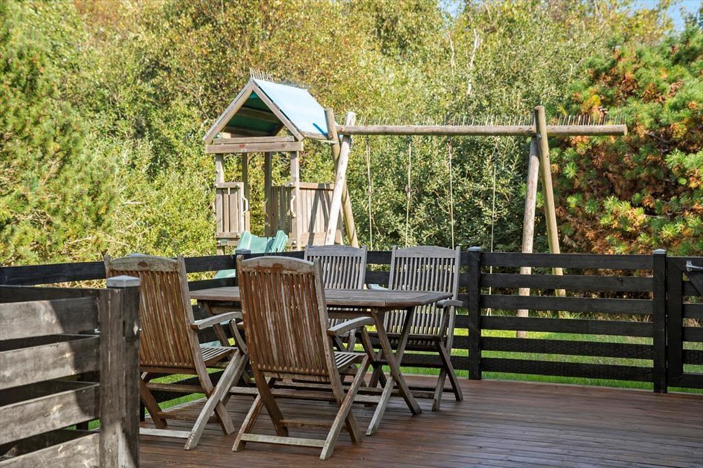 Naturgrunden er en tillokkende oase for hele familien, for i læ af træer og buske er der legeredskaber, et bålsted og flere dejlige terrasseområder – ja, i årets våde måneder har huset endda sin egen lille sø, der fuldender den naturskønne sommerhusromantik! Børnene kan hygge sig med at gynge, klatre og rutsje, og hvis du ikke er klar på at tage del i legen, kan du sidde lige i nærheden med en god kop kaffe. Om aftenen kan I hjælpes ad med at grille, og bordet kan I dække enten på den åbne terrasse mod vest eller på det hyggelige, overdækkede opholdsareal.