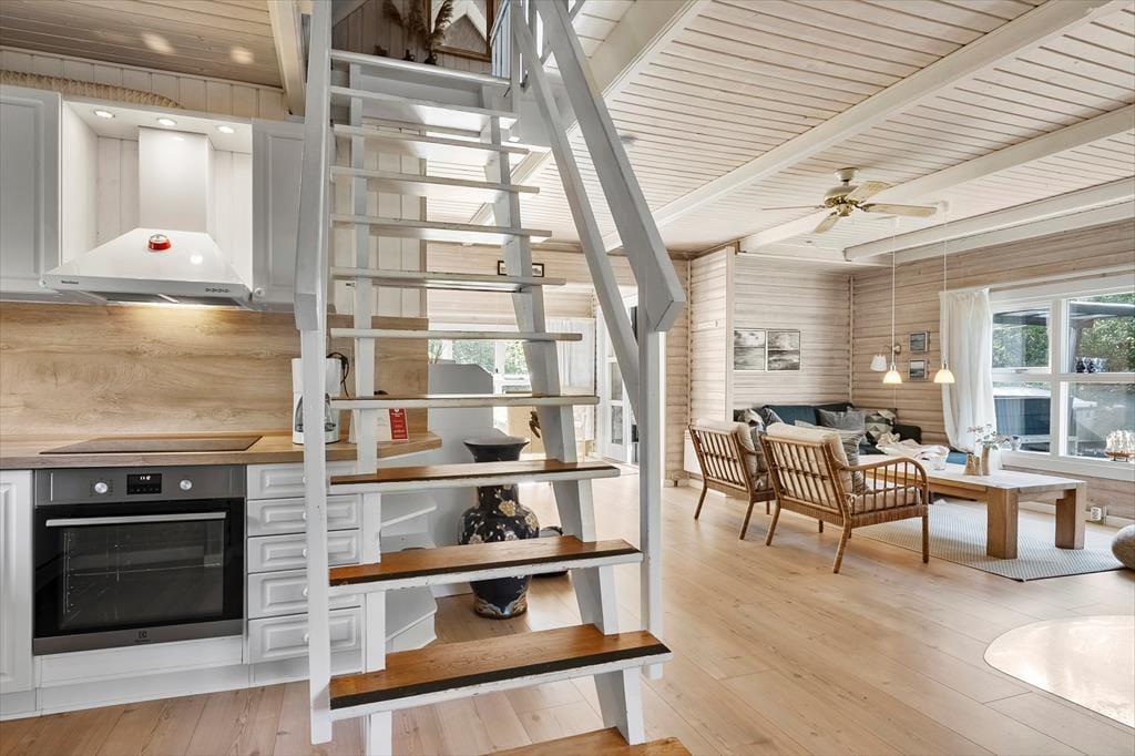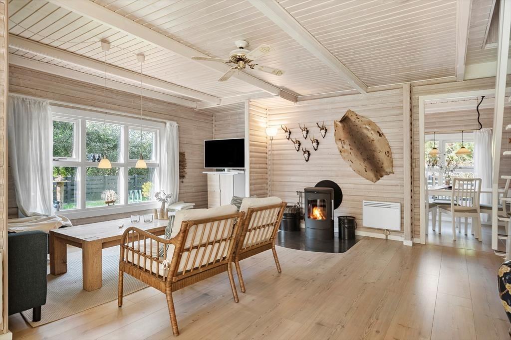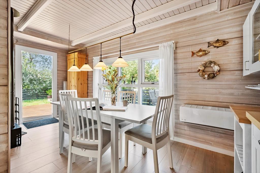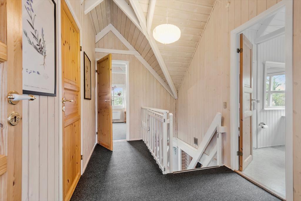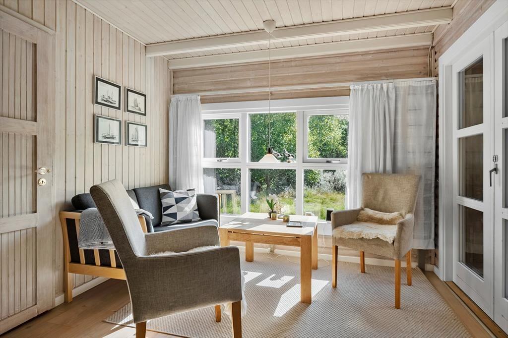 Sommerhuset ser hyggeligt ud allerede ude fra vejen, og når du kommer indenfor, bliver du mødt af en varm og indbydende atmosfære. Med rustik træbeklædning på væggene, brændeovn og udsigt til den grønne grund er alt, som det skal være, hvis du drømmer om at slappe af i en charmerende stue – og så er det dejlige opholdsrum endda indrettet med flere gode hyggekroge, alt efter om du og dine kære vil læse, se film, spille brætspil eller nyde et lækkert måltid mad. Ved siden af det åbne, veludstyrede køkken går en trappe op til førstesalen, der rummer tre gode soveværelser. Du finder for øvrigt en sauna heroppe i forlængelse af et toiletrum, mens badeværelset med bruser er placeret i stueplan.