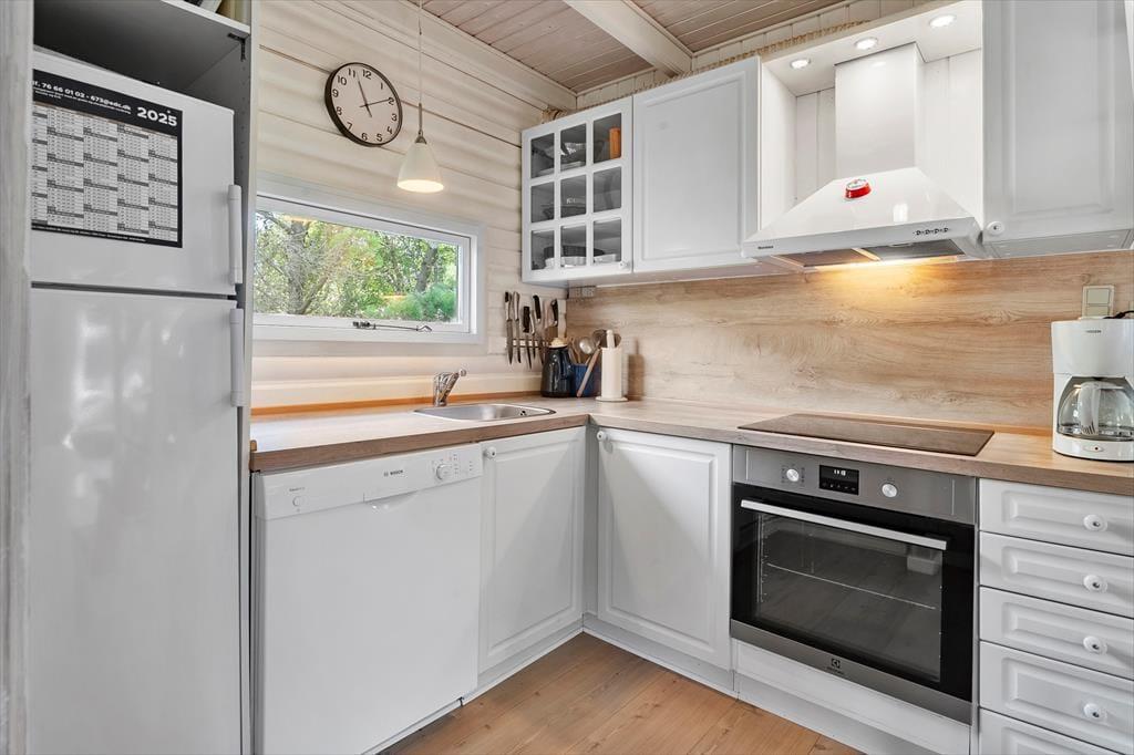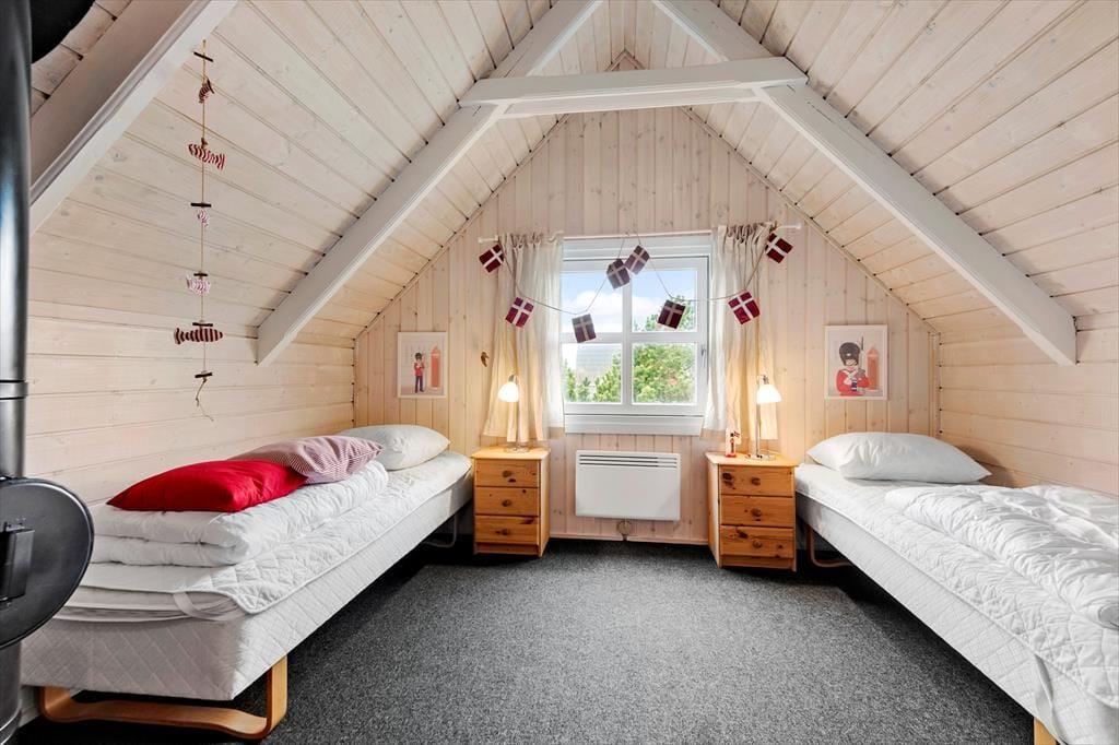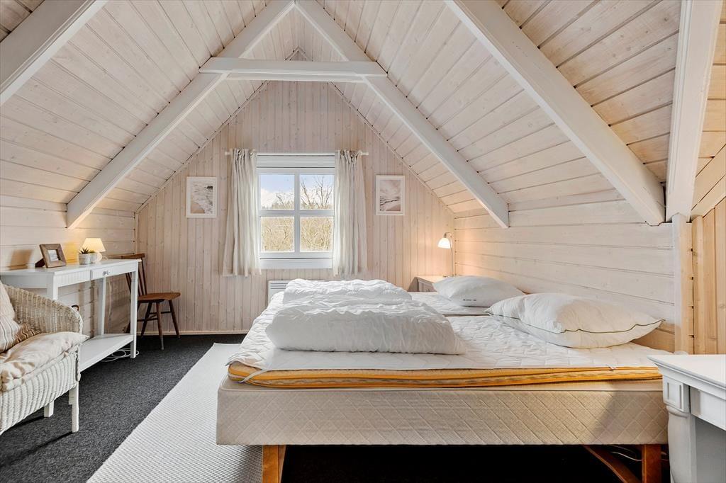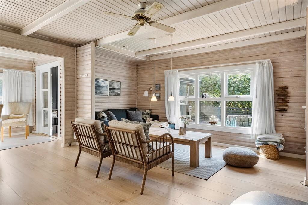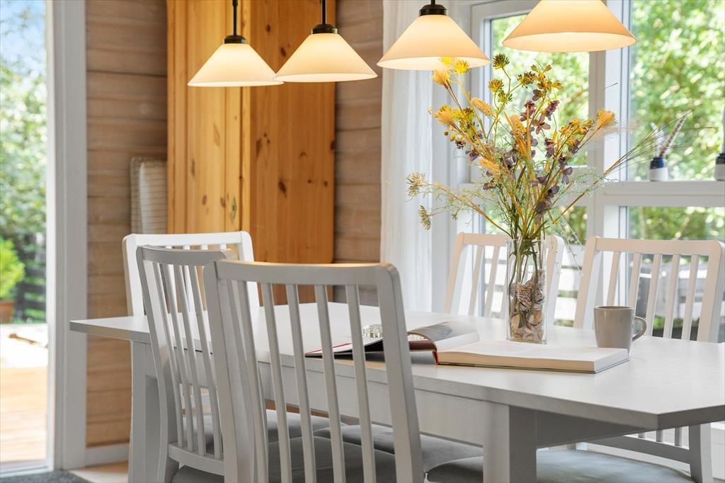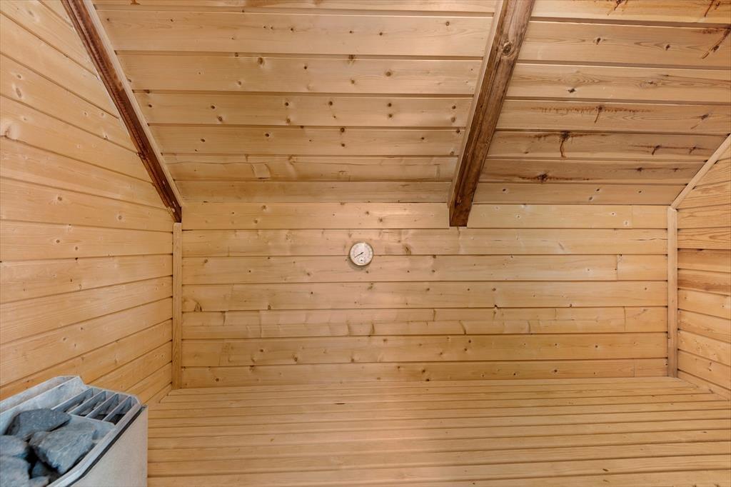 Sommerhuset ser hyggeligt ud allerede ude fra vejen, og når du kommer indenfor, bliver du mødt af en varm og indbydende atmosfære. Med rustik træbeklædning på væggene, brændeovn og udsigt til den grønne grund er alt, som det skal være, hvis du drømmer om at slappe af i en charmerende stue – og så er det dejlige opholdsrum endda indrettet med flere gode hyggekroge, alt efter om du og dine kære vil læse, se film, spille brætspil eller nyde et lækkert måltid mad. Ved siden af det åbne, veludstyrede køkken går en trappe op til førstesalen, der rummer tre gode soveværelser. Du finder for øvrigt en sauna heroppe i forlængelse af et toiletrum, mens badeværelset med bruser er placeret i stueplan.