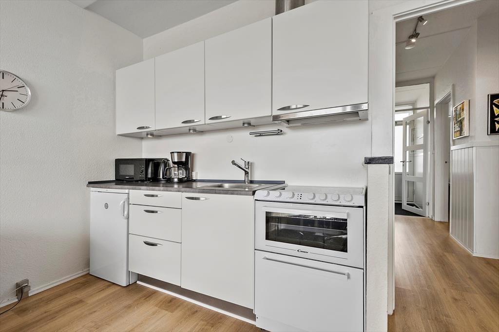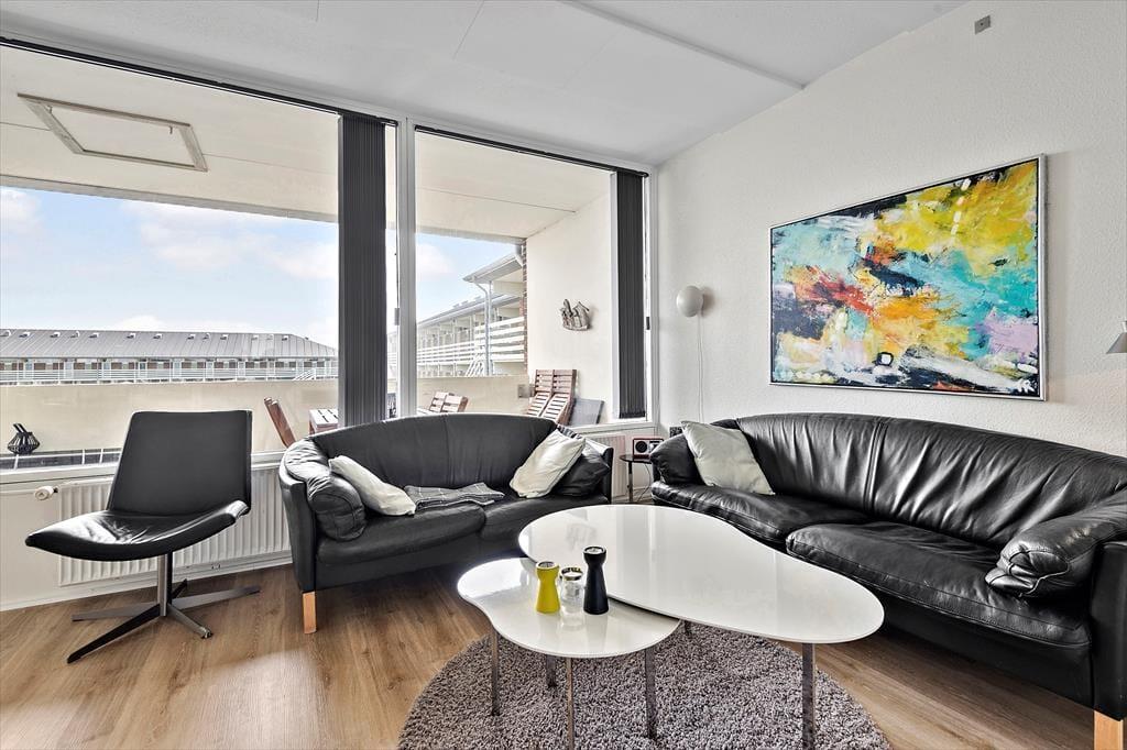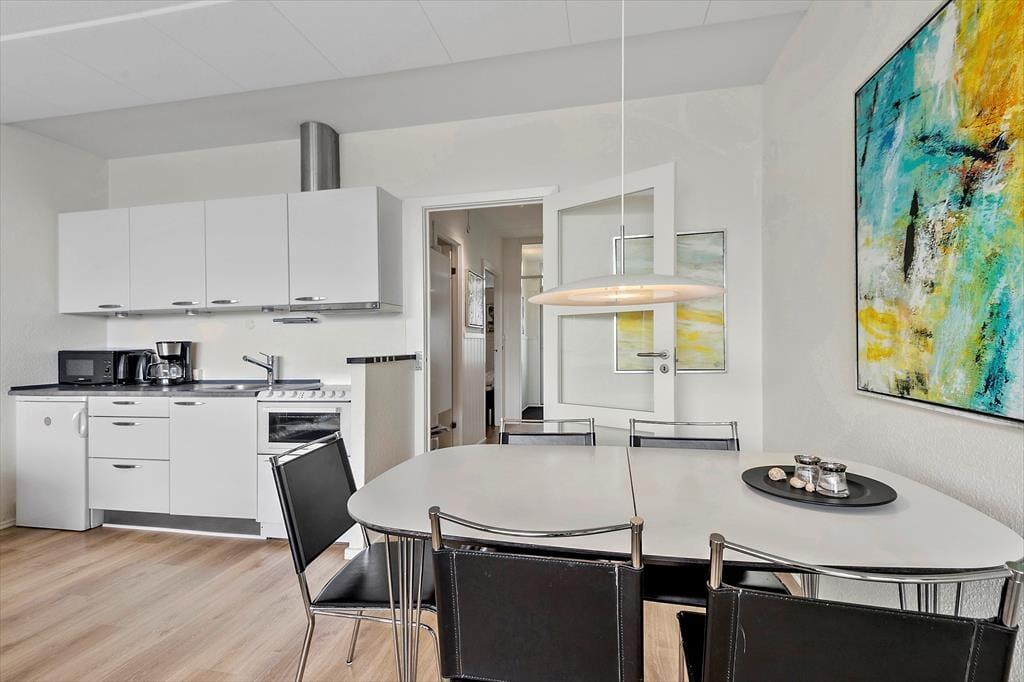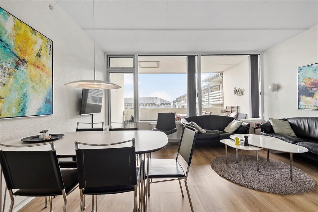 Med sin lyse atmosfære og sin velfungerende planløsning passer lejligheden perfekt til en parferie såvel som nogle dejlige dage for en børnefamilie, og uanset selskabet kan du se frem til at nyde driverlivet i rare omgivelser. Alle rum fremstår pæne og indbydende, og især stuen er et skønt opholdssted, for her kan du slænge dig i sofaarrangementet, se film på fladskærms-tv’et eller slå dig ned ved spisebordet til et lækkert måltid. Maden kan du trylle frem i det åbne køkken – og hvis solen skinner udenfor, kan du overveje, om du skal åbne glasdøren og dække op på altanens havebord i stedet for.