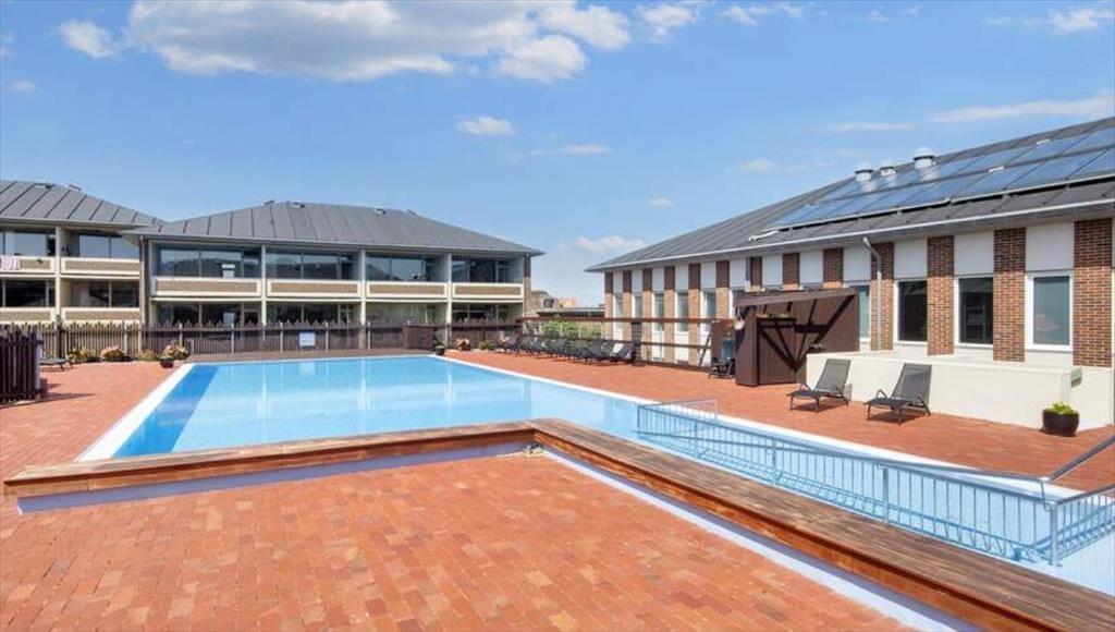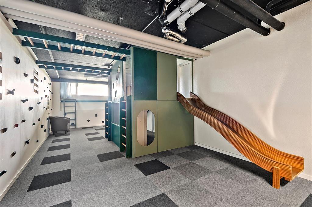 Lejligheden ligger på første sal, så når du slikker sol på altanen, har du et godt overblik over gårdmiljøets fællesarealer. Altanen er afskærmet i siderne, så der er gode chancer for at finde læ, og takket være overdækningen behøver du ikke at tænke på, om duggen falder, hvis du vil sidde herude hele aftenen. I gården kan du frit benytte den fælles swimmingpool i sommerperioden (cirka 1/7 – 1/9), og der er også en grillhytte og en legeplads, hvor børnene kan boltre sig. På de indendørs fællesarealer kan I blandt hygge jer med bordtennis og bordfodbold, og der er også et legerum til eventuelle regnvejrsdage, mens de indendørs svømmebassiner og saunaen inviterer til wellness og afslapning.