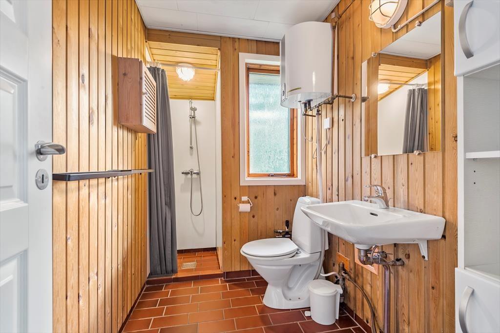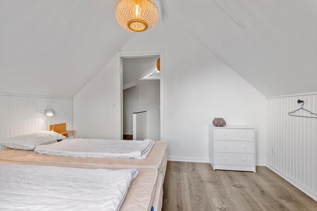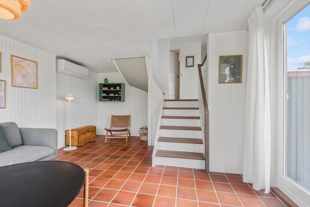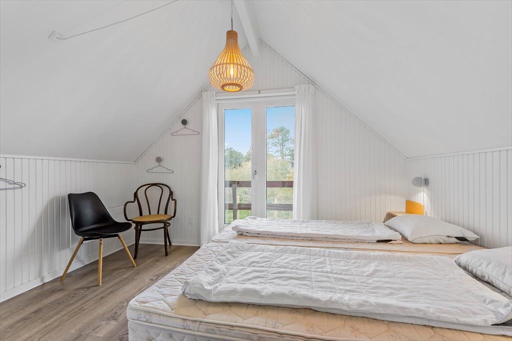 Fra førstesalens soveværelse har du adgang til en lille altan, så hvis du vil starte dagen med at trække frisk luft i lungerne og nyde udsigten over naturgrunden, er det her, du skal stå. Og hvis vejret er lunt og sommerligt, kan du tage morgenkaffen med ud på en af de tre skønne terrasser, der fordeler sig rundt om sommerhuset. Den hævede træterrasse vil du måske blive særligt forelsket i, for det er herligt at sidde her på en lys sommeraften og kunne kigge ud på det kuperede landskab. På grunden er der for øvrigt gyngestativ og sandkasse til børnene – og de rolige omgivelser på den lukkede vej kan glæde både store og små familiemedlemmer.