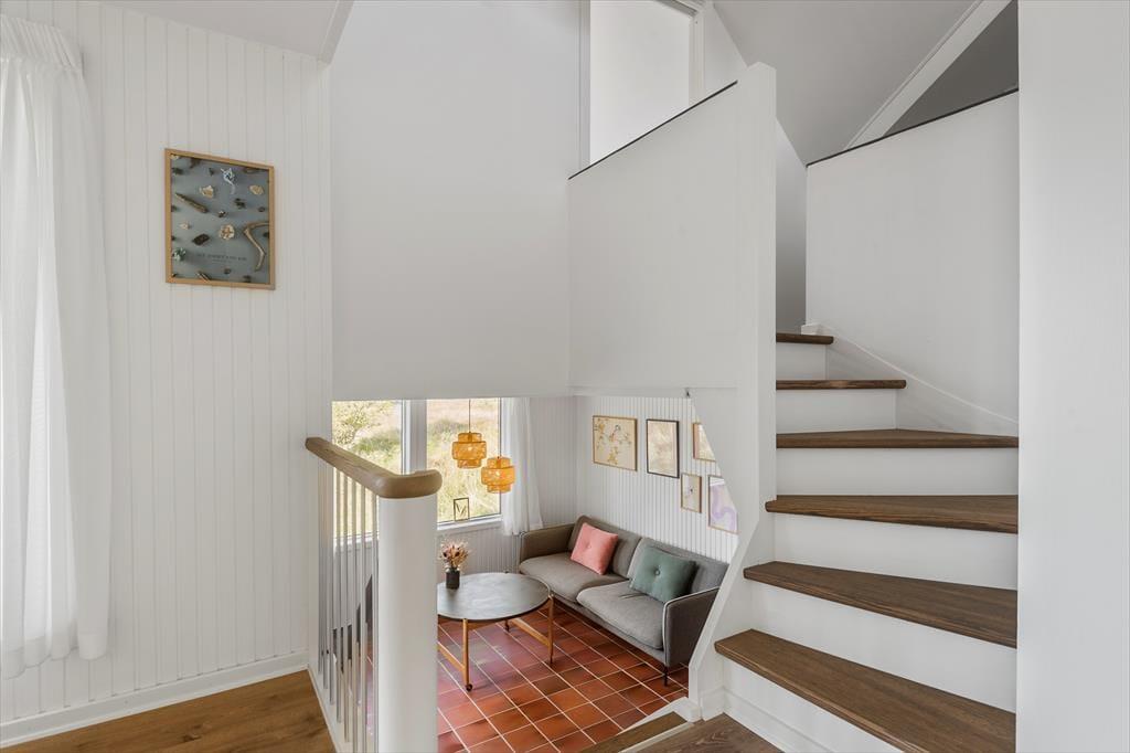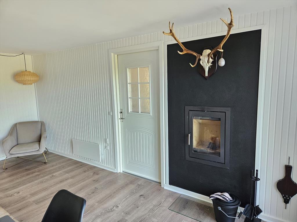 Det er tydeligvis ikke et typehus, der ligger her på Norges Fjelde 9, for arkitekturen er tilpasset den kuperede naturgrund, så der er flere niveauer og store vinduer vendt ud mod det smukke landskab. Den særlige planløsning betyder også, at I har stor fleksibilitet, alt efter om I vil hygge jer sammen, eller om I trænger til at slappe af hver for sig med en god bog, en podcast eller en film på fladskærms-tv’et. I den sænkede stue er der klinkegulv med indlagt varme, og i det centrale opholdsrum står en brændeovn klar til årets køligere dage og aftener. Stueplan byder på et brusebadeværelse og et enkelt soveværelse, og husets vindeltrappe fører op til endnu et soveværelse på førstesalen. Alt i alt får I med andre ord en fin og stemningsfuld feriebolig til fire personer!