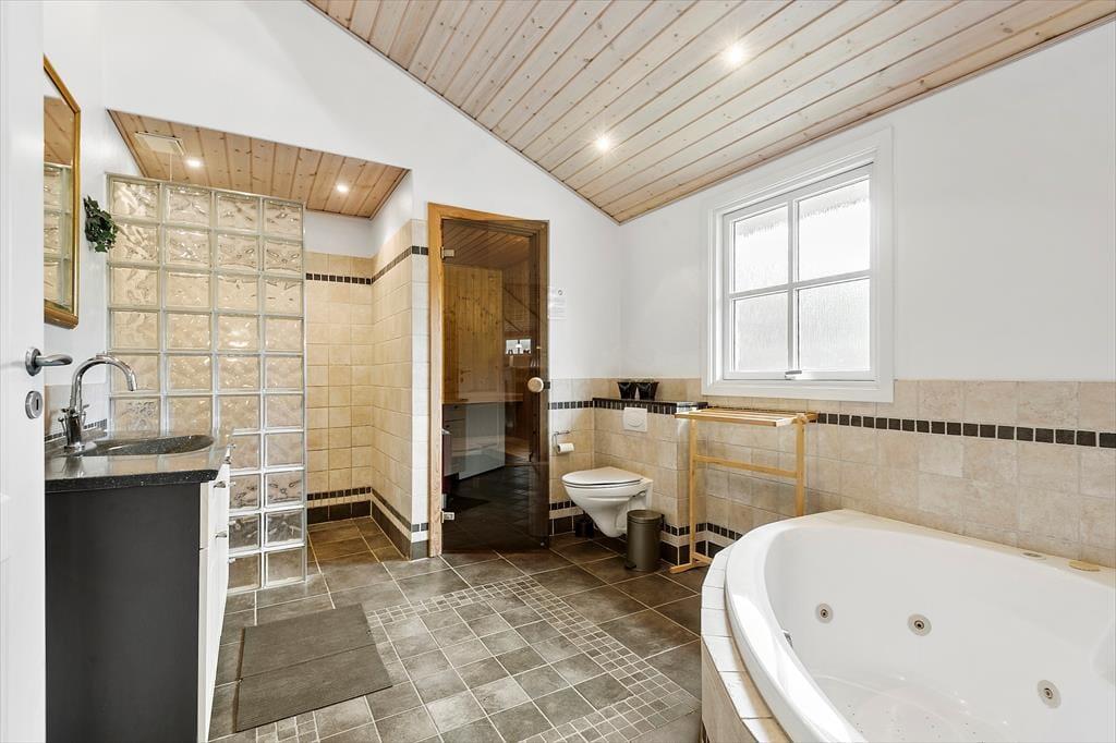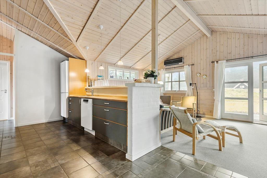 Indenfor mødes du af en lys og venlig atmosfære, hvor det hyggelige opholdsrum fungerer som husets naturlige samlingspunkt. Her kan du slå dig ned i sofaen efter en lang dag på stranden, mens brændeovnen knitrer i baggrunden. Det åbne køkken gør det let at tilberede feriens måltider, og ved spisebordet kan familien samles til lange middage og hyggelige samtaler. Efter en dag fyldt med oplevelser kan du forkæle dig selv med en afslappende tur i husets spabad eller en varm saunaoplevelse, der giver kroppen ro og velvære.